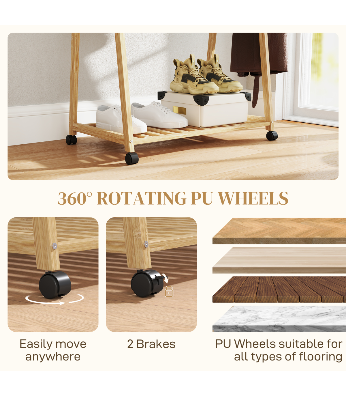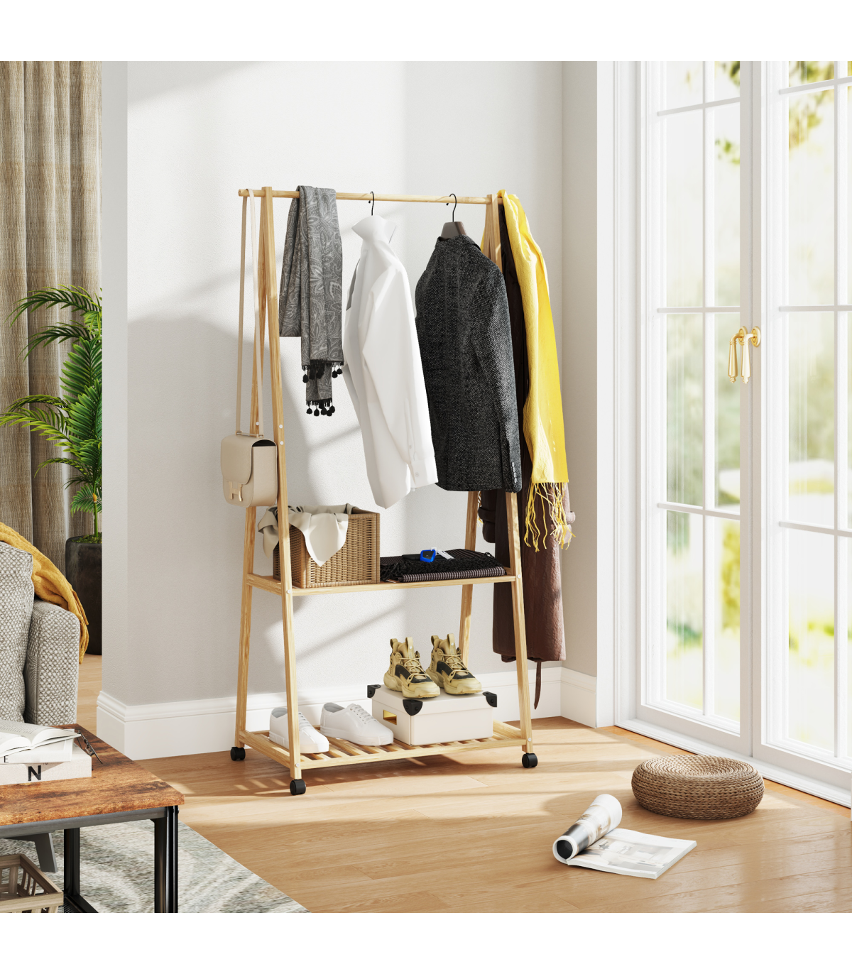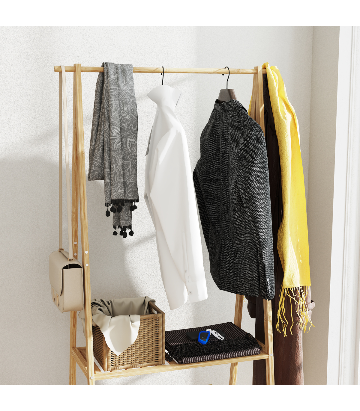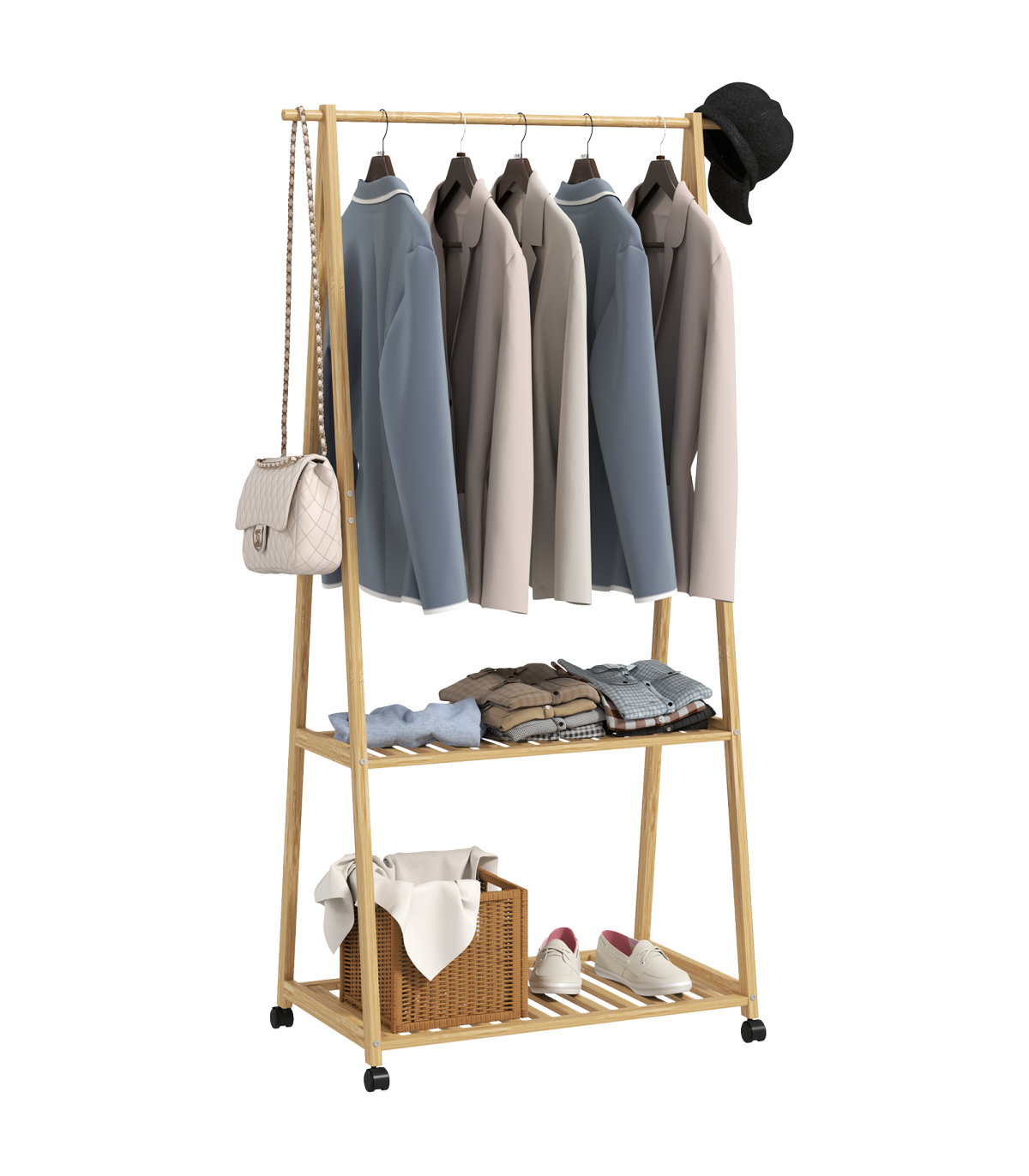 ● Two bottom slatted shelves hold shoes or storage boxes