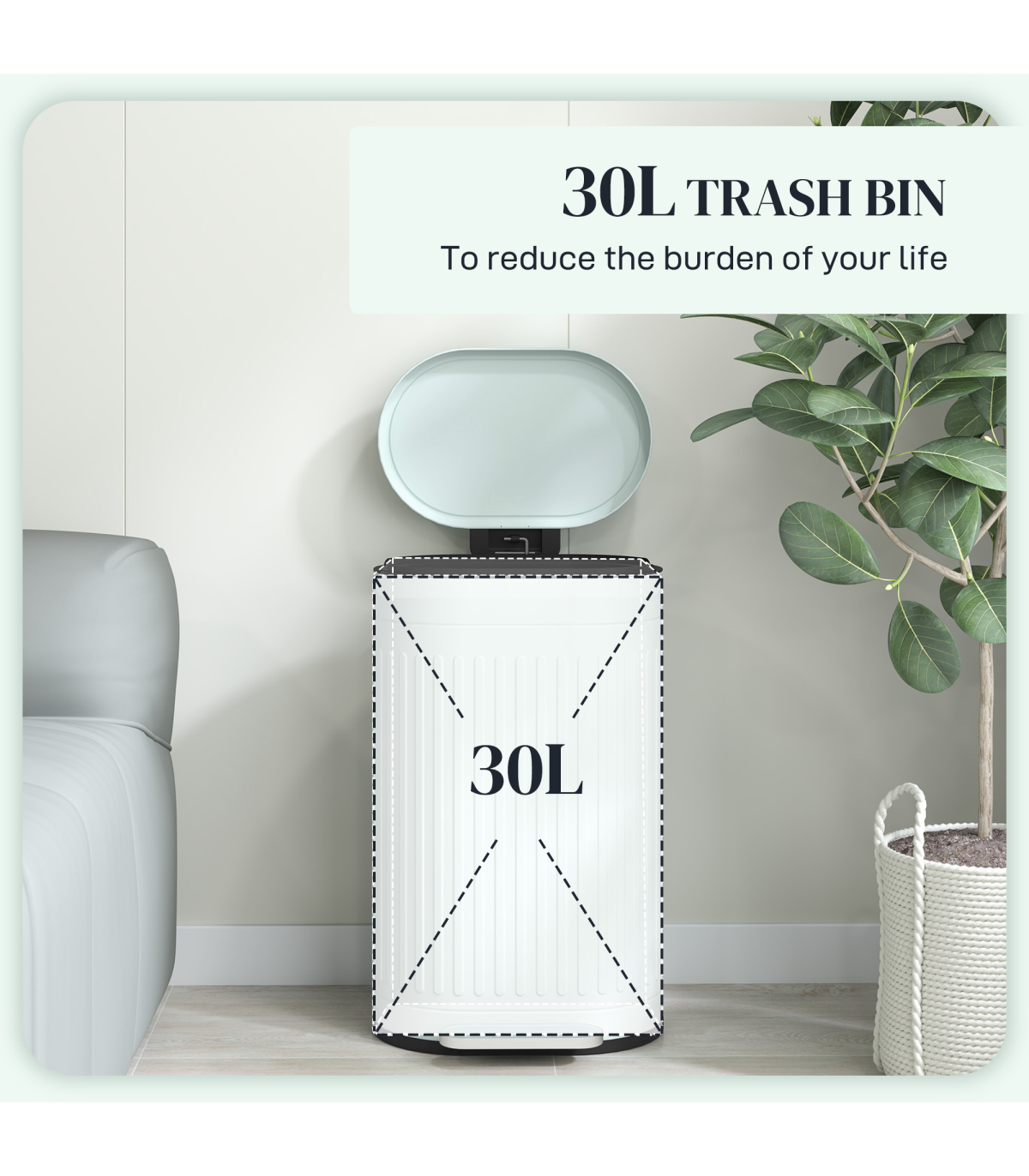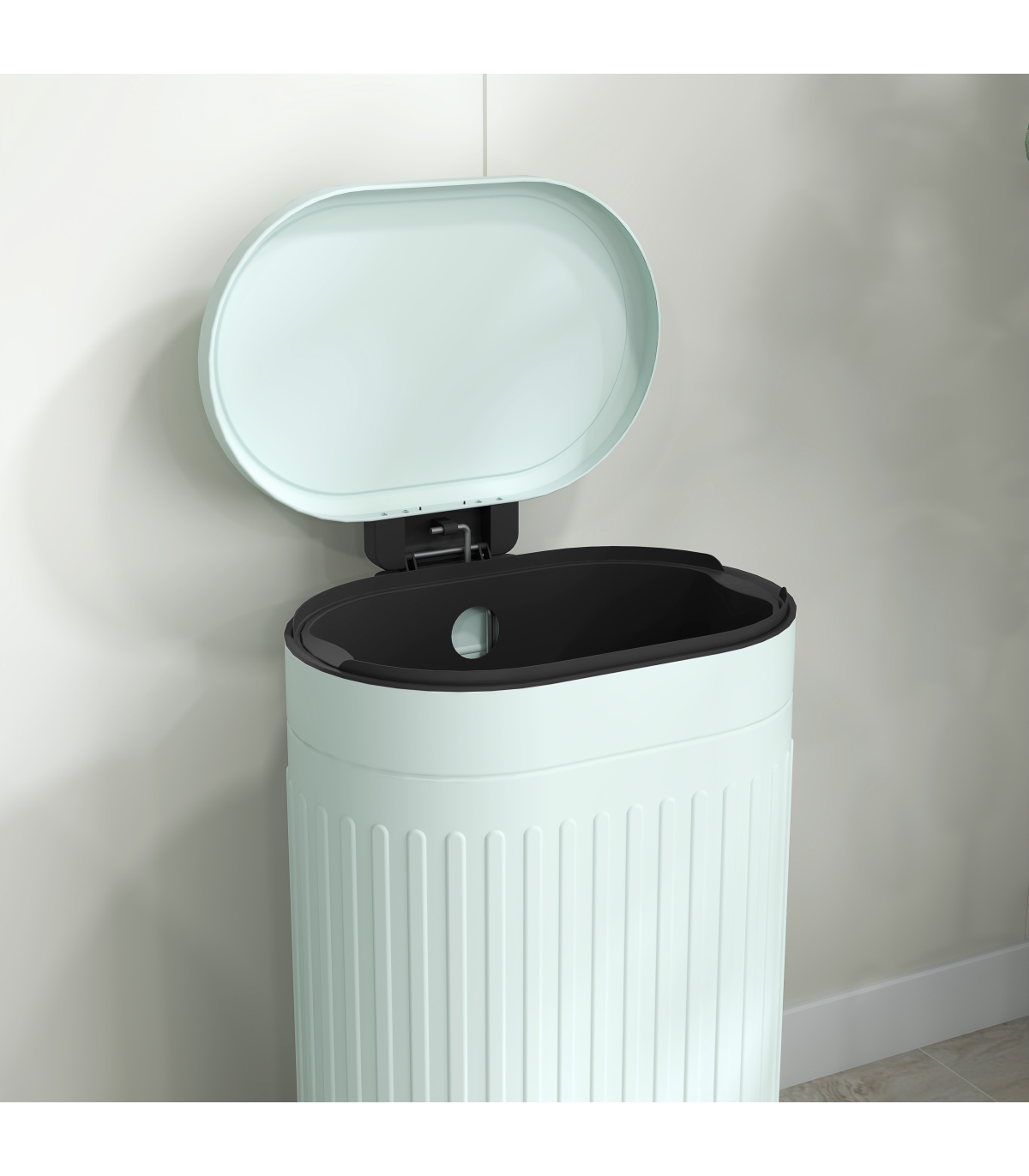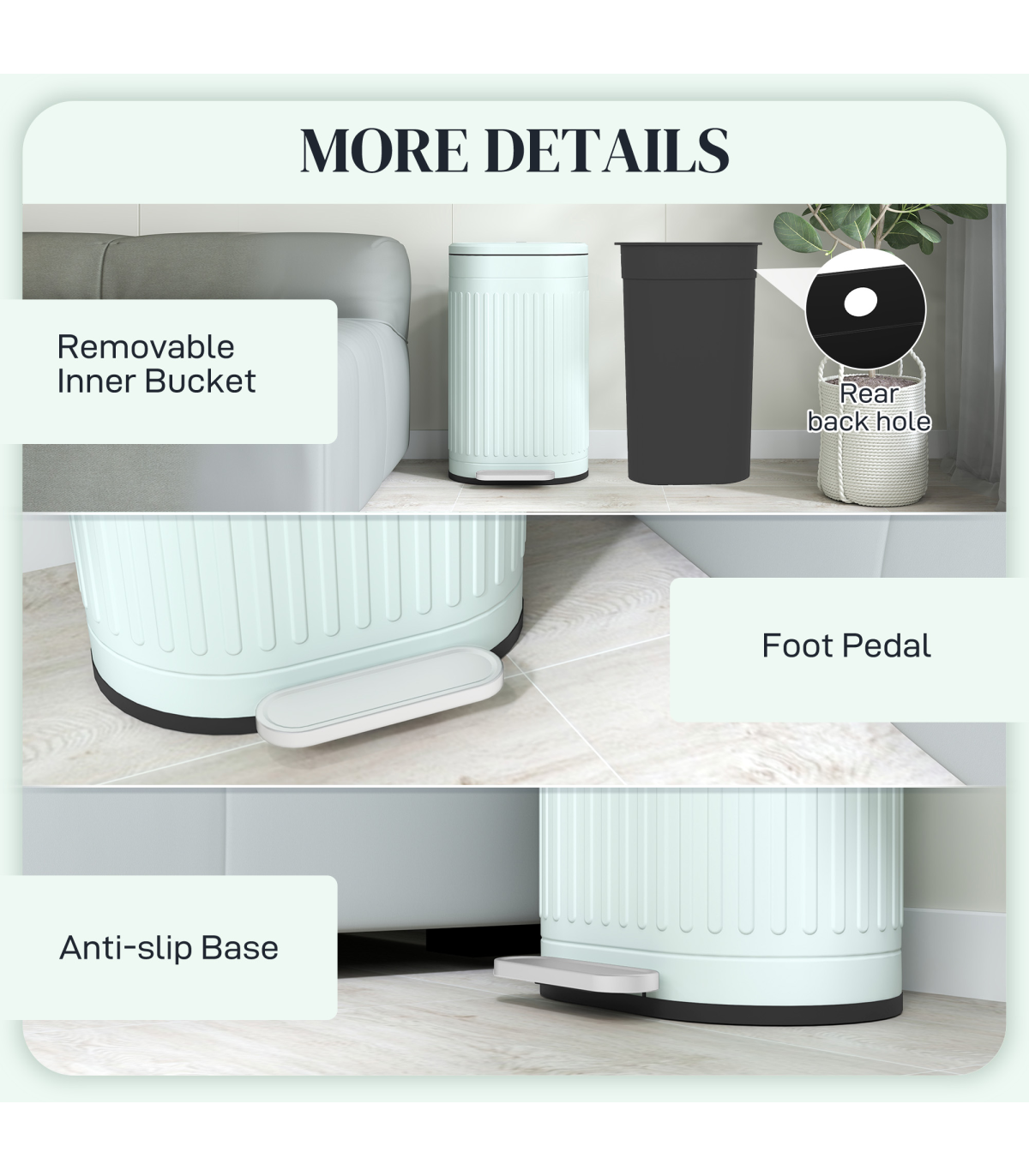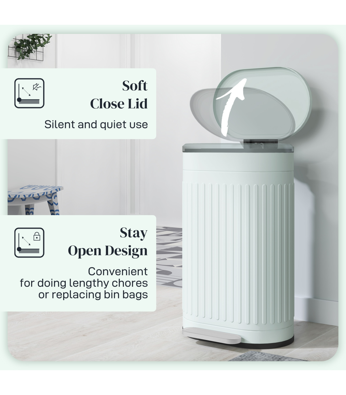 ● Stay-open lid and inner removable bucket for easy cleaning. Hole to fix bin bag