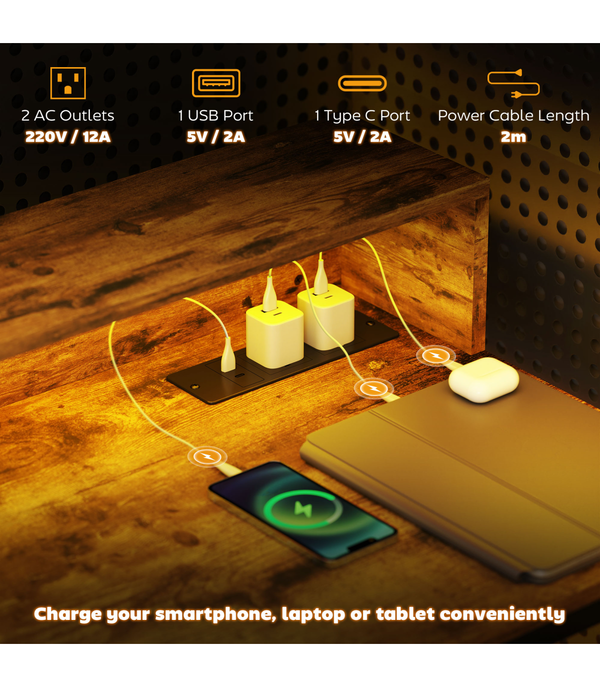 ● Power strip includes two outlets and a USB, a USB-C port