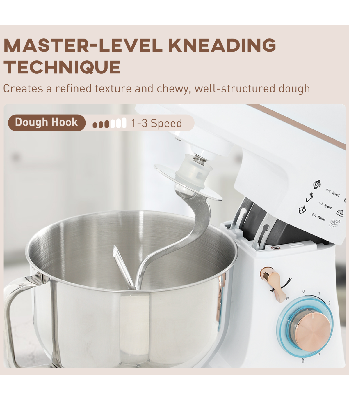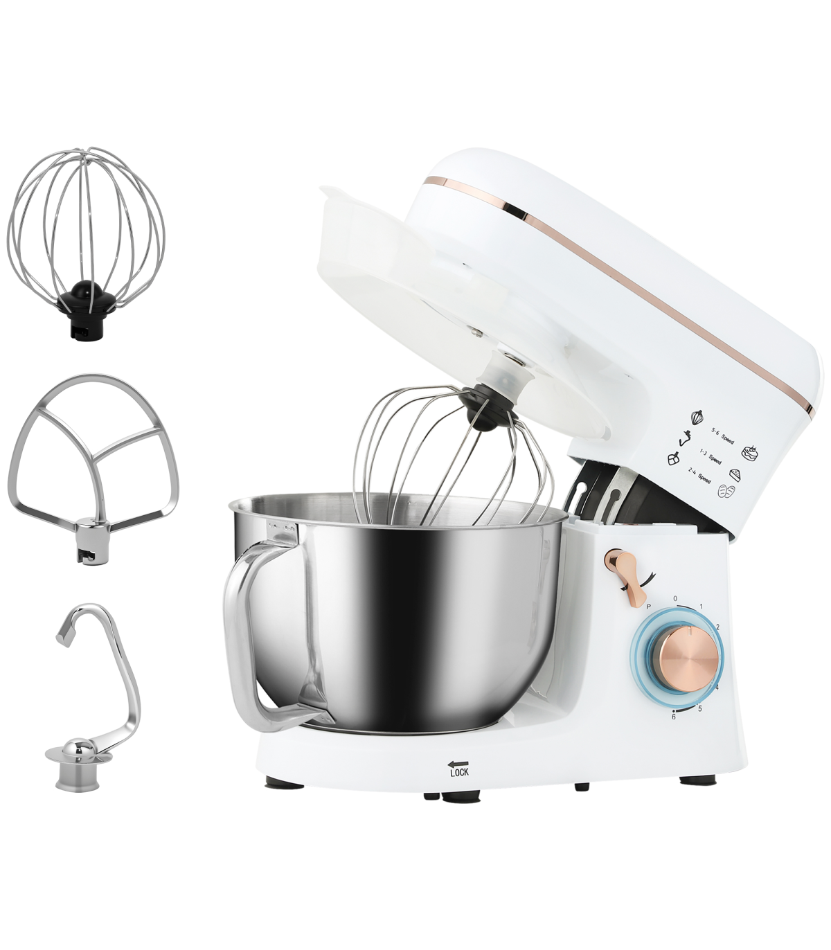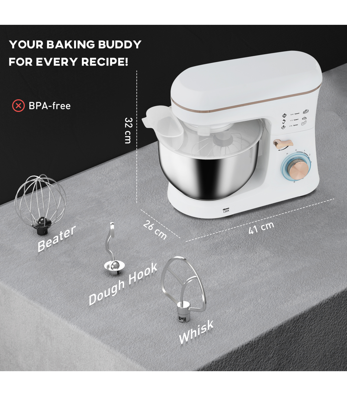 ● Includes whisk, dough hook and mixing beater for diverse tasks