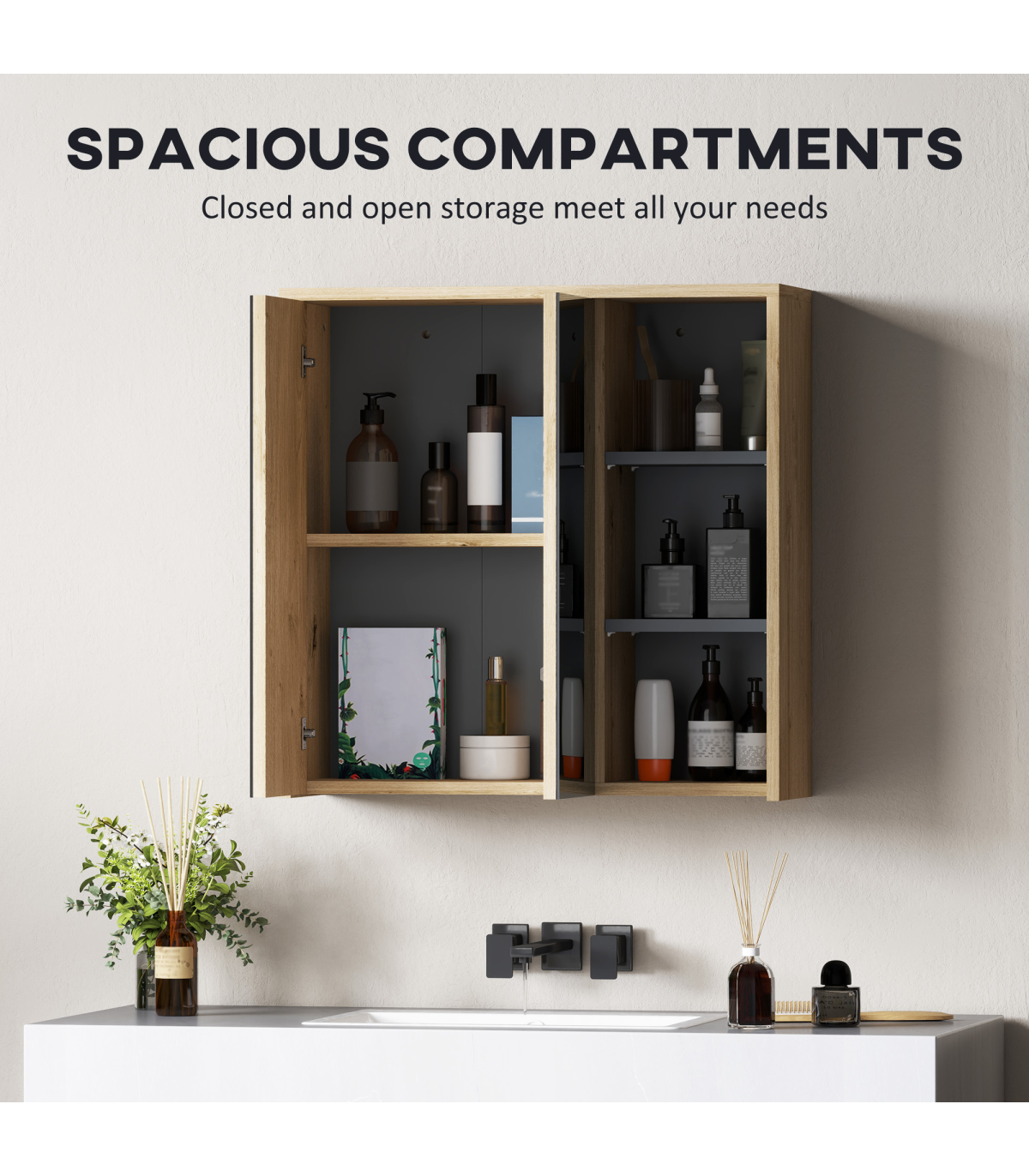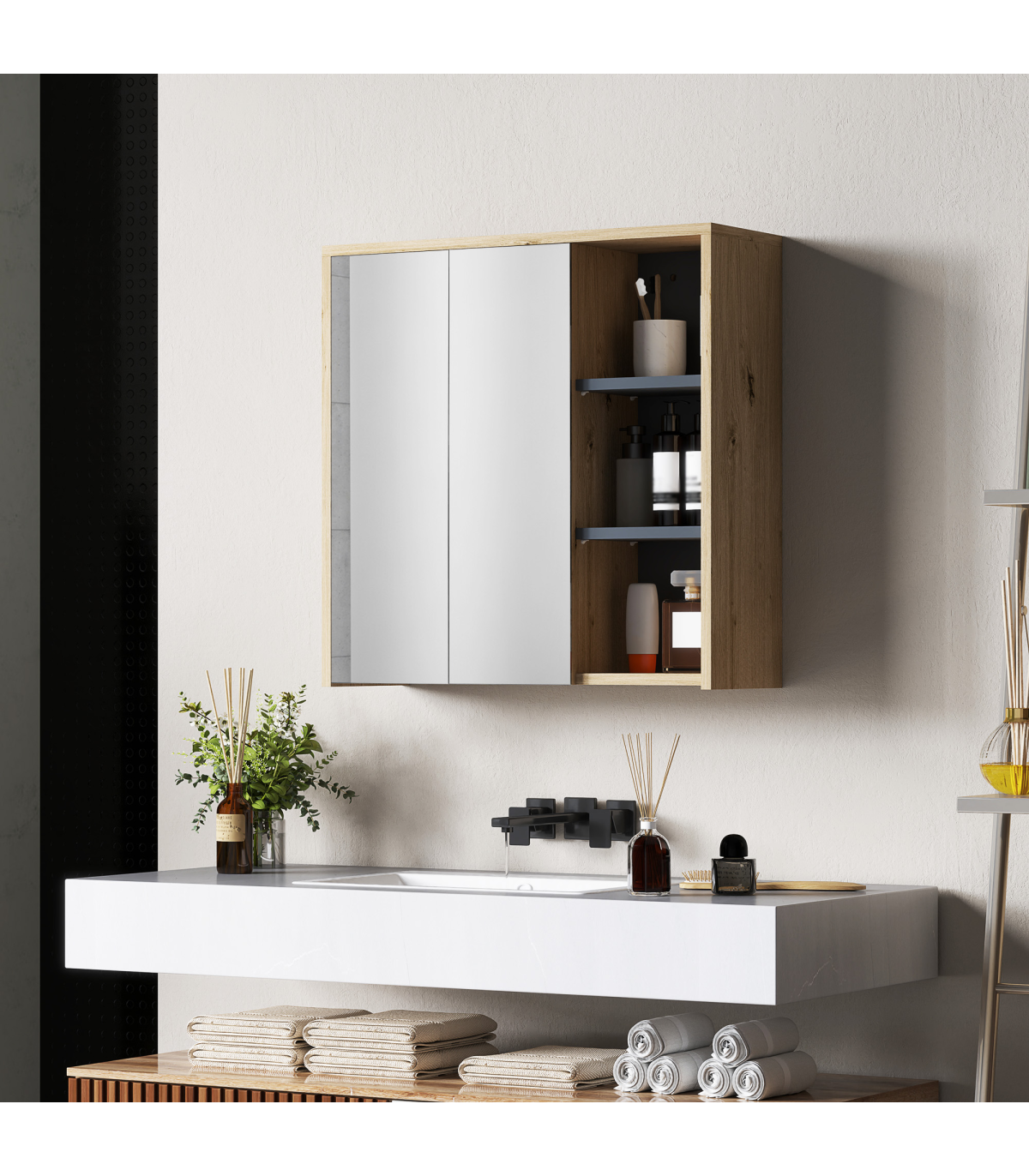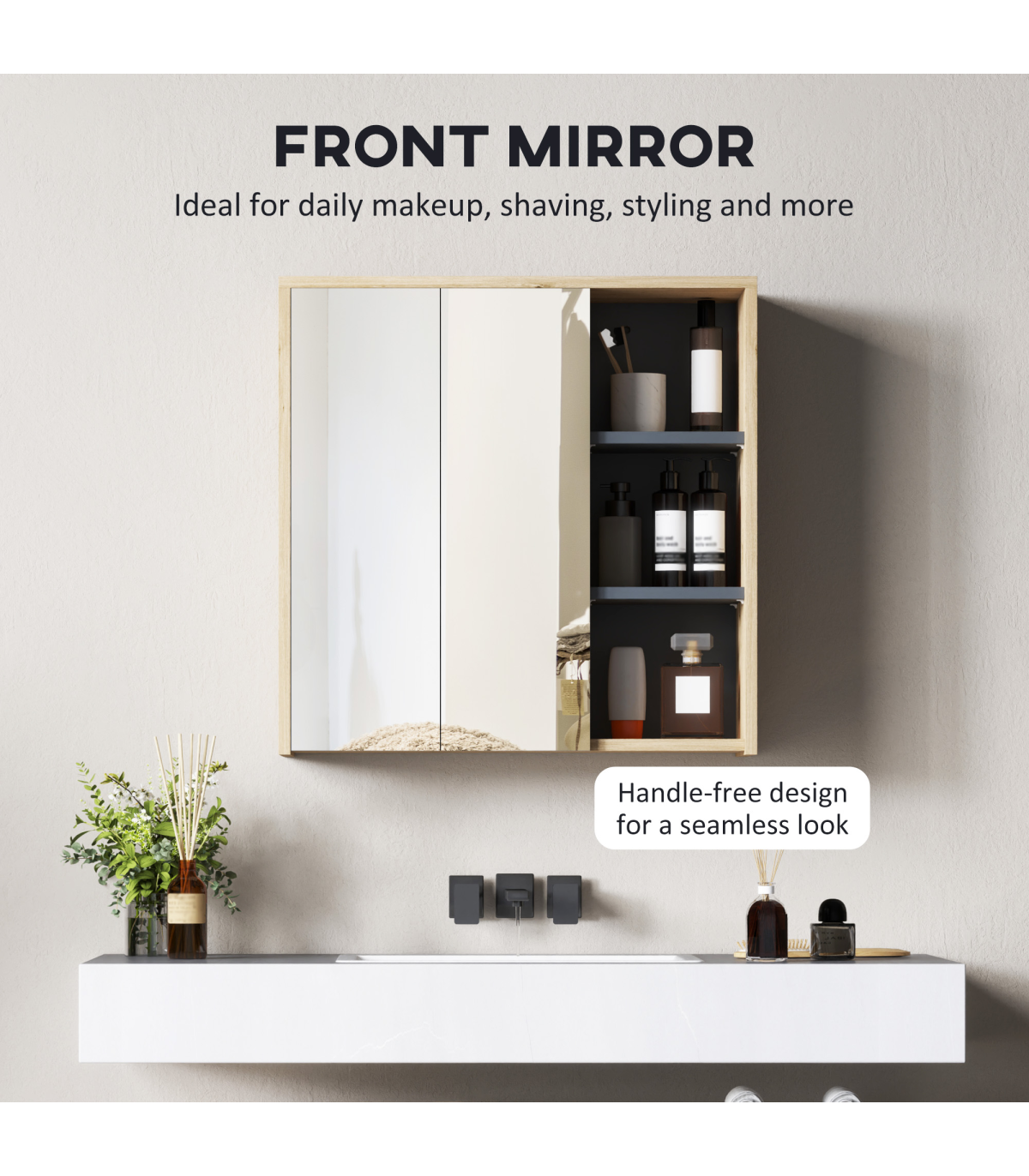 ● Two mirrored doors, with a handle-free design: a clean, seamless look. Smooth-opening hinges