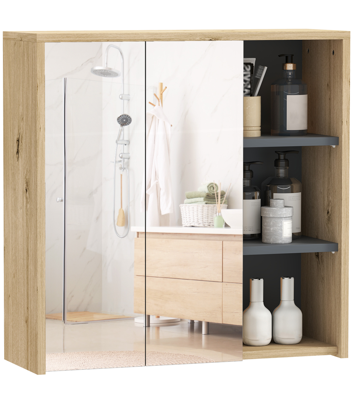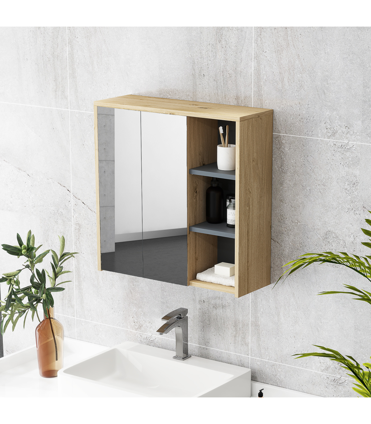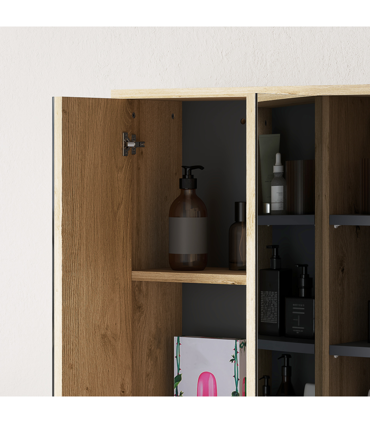 ● Two mirrored doors, with a handle-free design: a clean, seamless look. Smooth-opening hinges