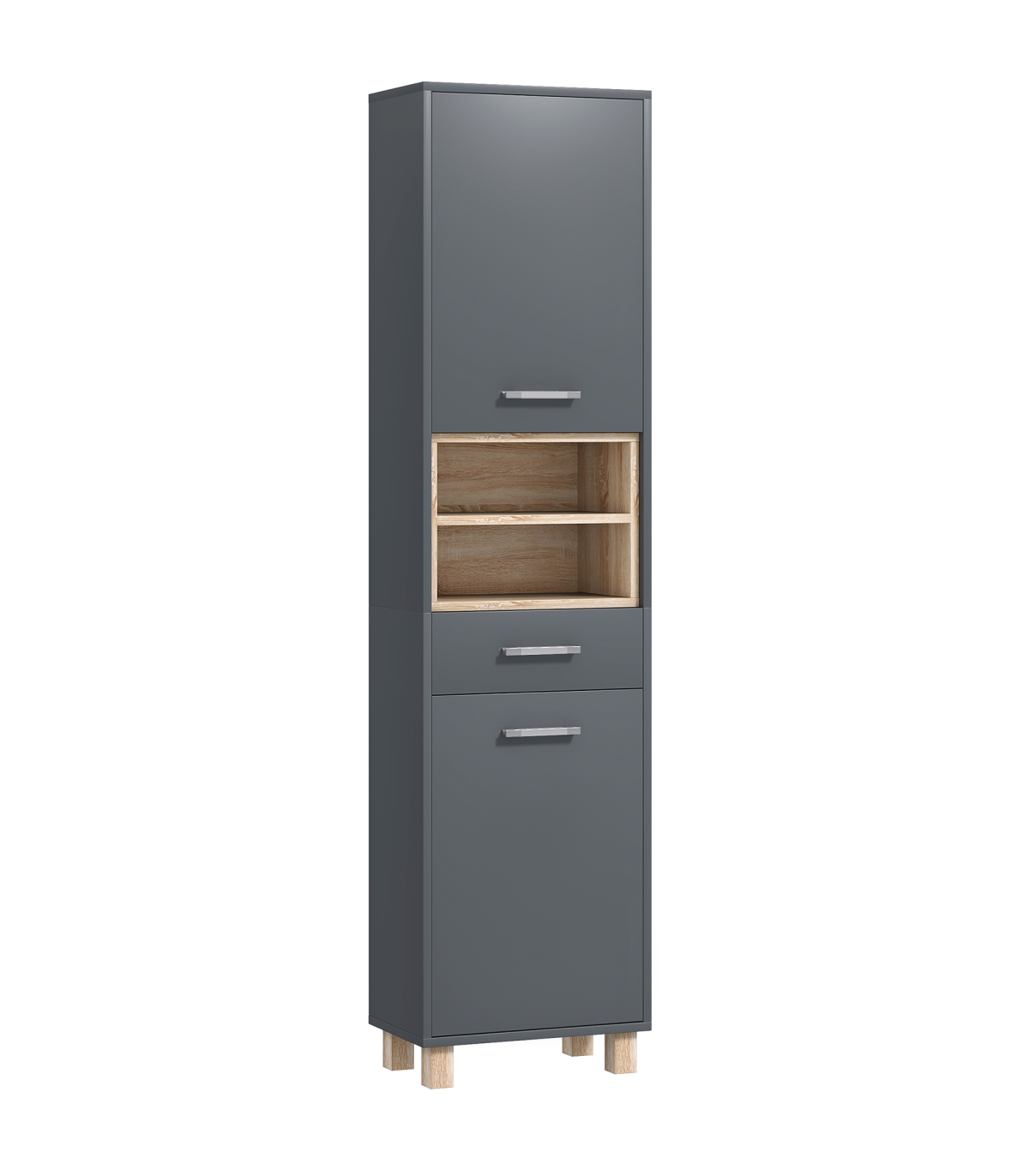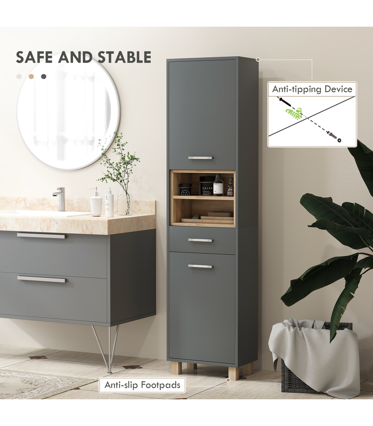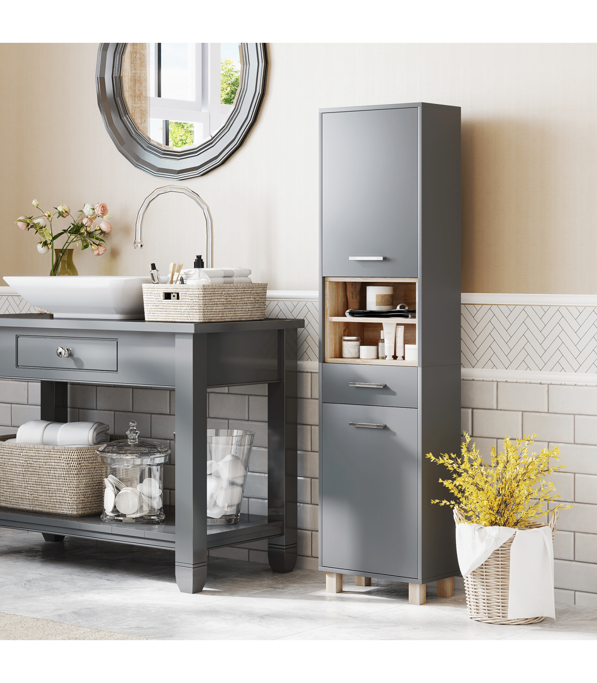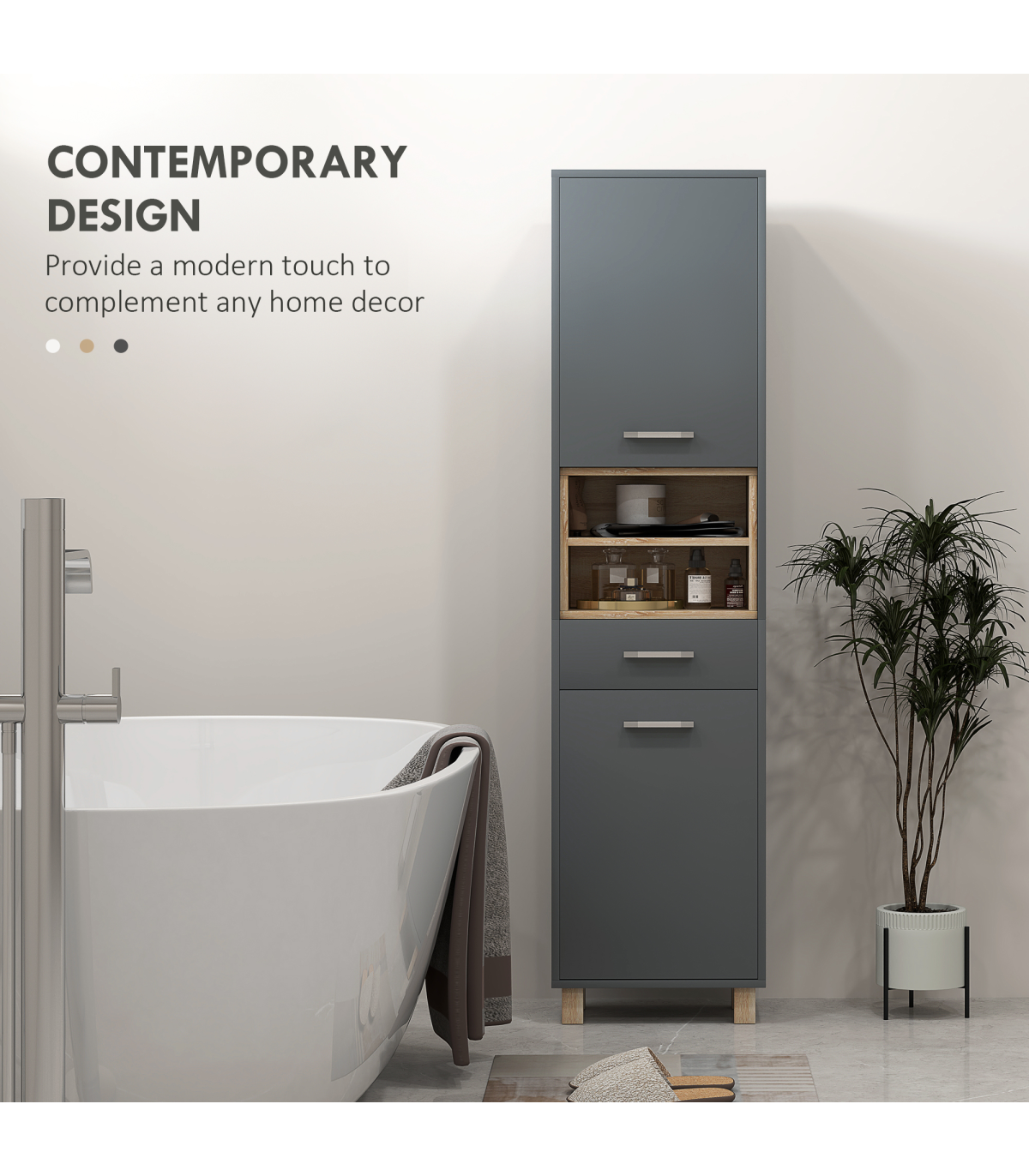 ● Grey and natural wood finish enhances modern home aesthetics