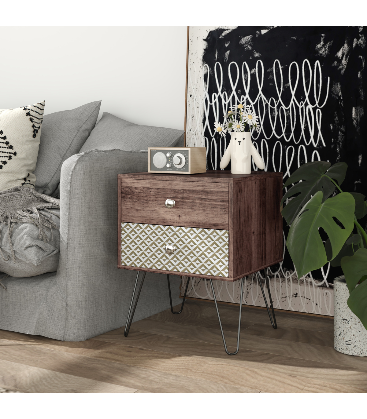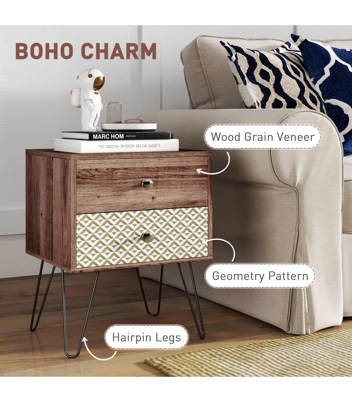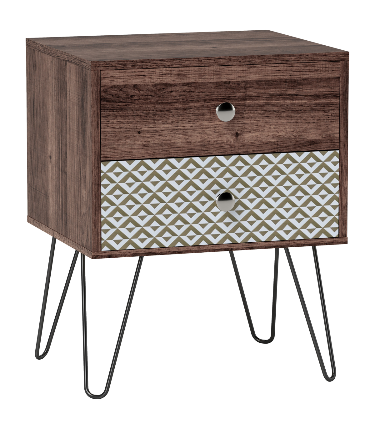 This stylish Boho bedside table combines elegance and functionality with its wood grain veneer and geometric pattern. Ideal for enhancing the decor of any room, it features black hairpin legs that add a modern touch while offering plenty of storage space.