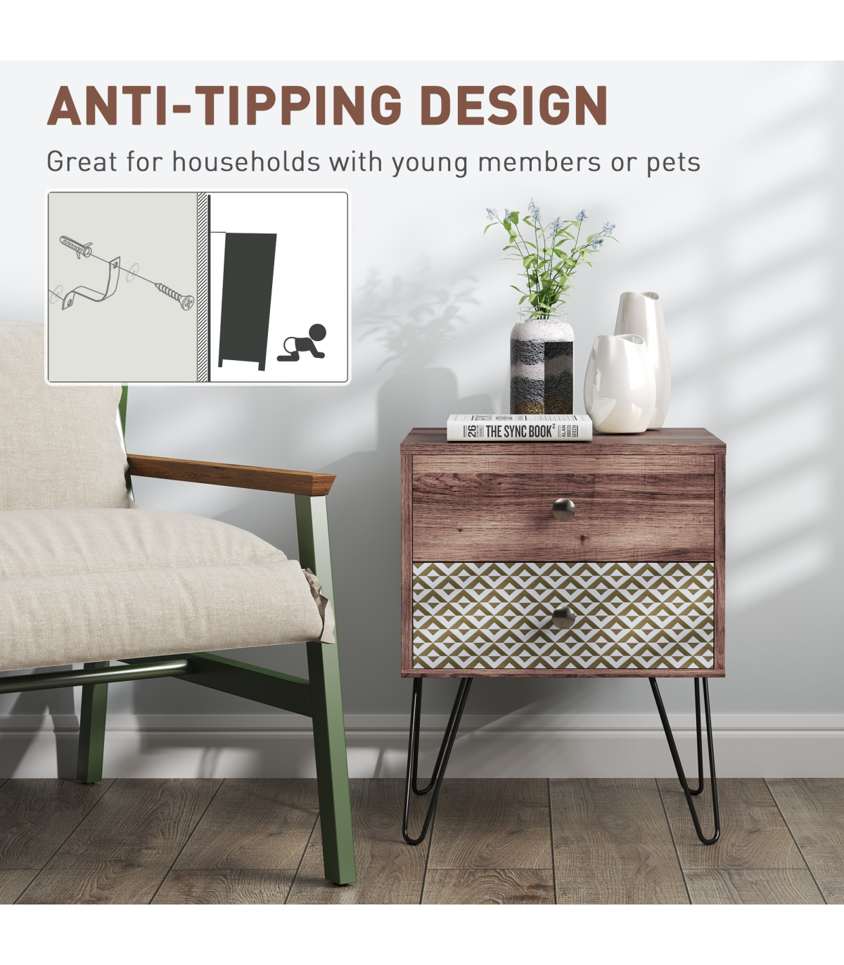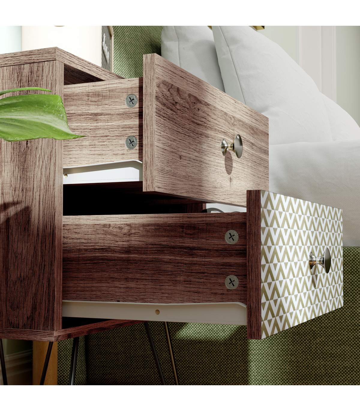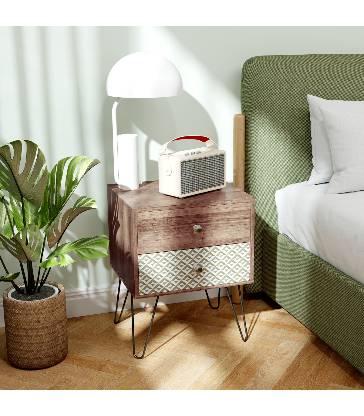 This stylish Boho bedside table combines elegance and functionality with its wood grain veneer and geometric pattern. Ideal for enhancing the decor of any room, it features black hairpin legs that add a modern touch while offering plenty of storage space.