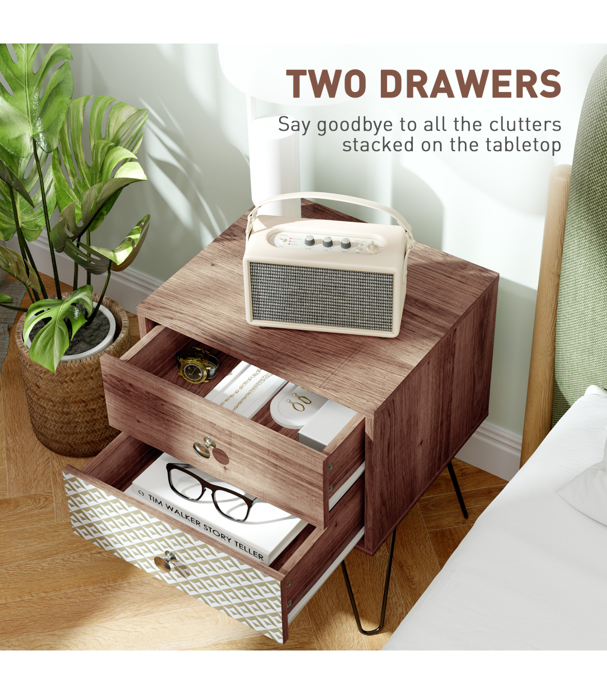 - Spacious Storage: Two drawers provide ample storage for essentials, keeping your space organised.