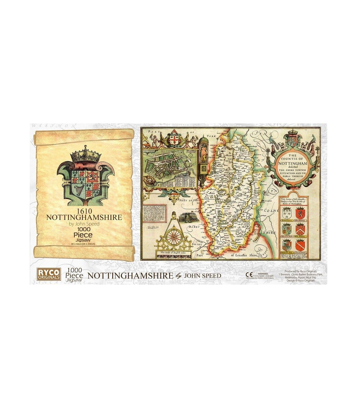 This is a superb jigsaw puzzle featuring the county of Nottinghamshire in approximately 1610. The finished jigsaw measures 66 x 50cm, and comes with a Free colour A3 guide print., Free, colour, A3 print suitable for framing, 1000 piece jigsaw, 66 x 50cm, Each County map is taken from the John Speed 1610 Atla, Manufactured by us in Devon