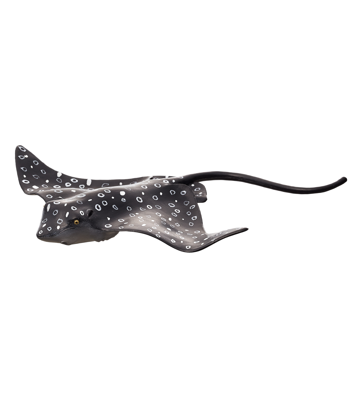 Spotted eagle rays have flat disk-shaped bodies, deep blue or black with white spots on top with a white underbelly, and distinctive flat snouts similar to a duck's bill. Their tails are longer than those of other rays and may have 26 venomous spines, just behind the pelvic fins. The front half of the long and wing-like pectoral disk has five small gills in its underside.