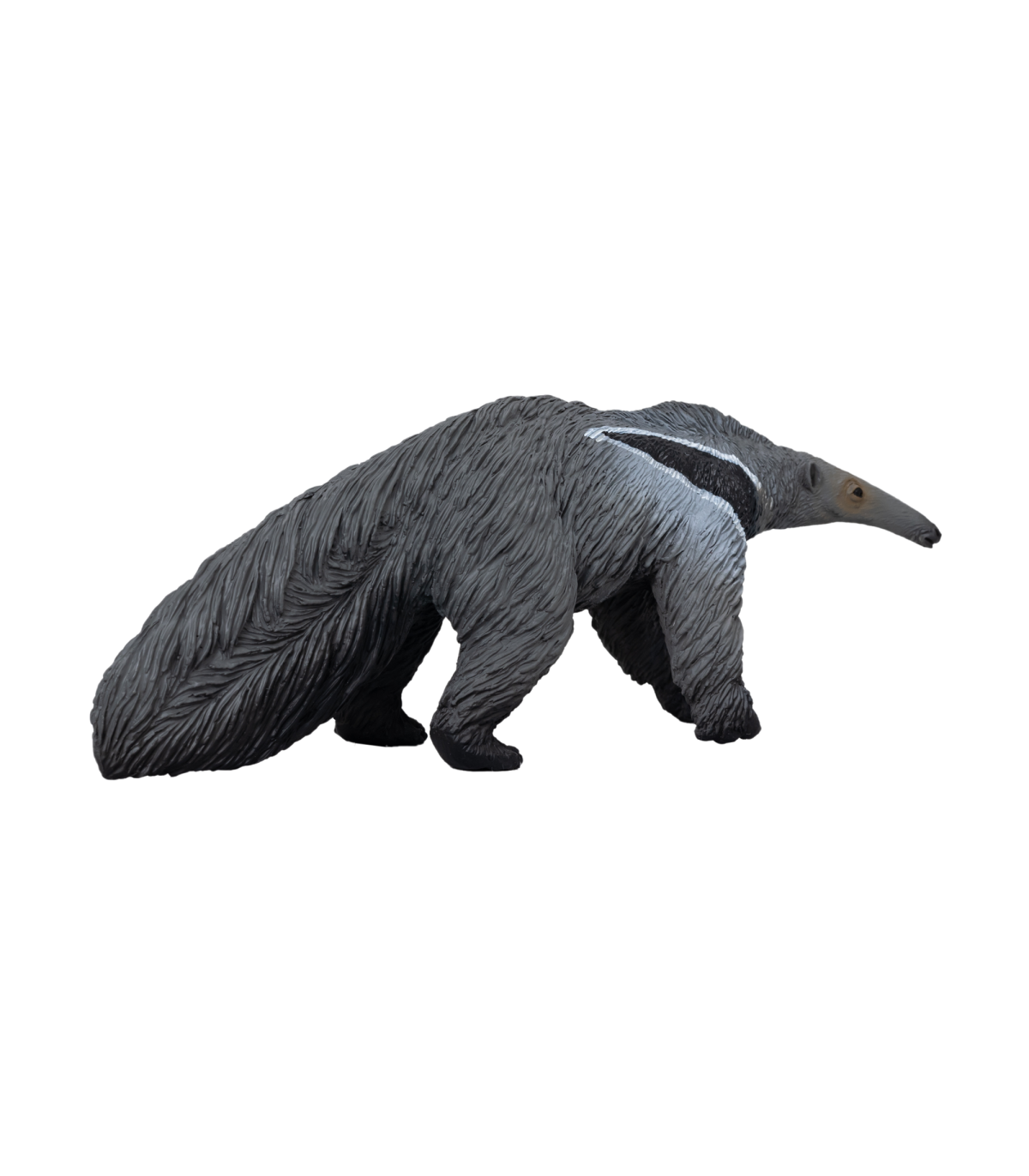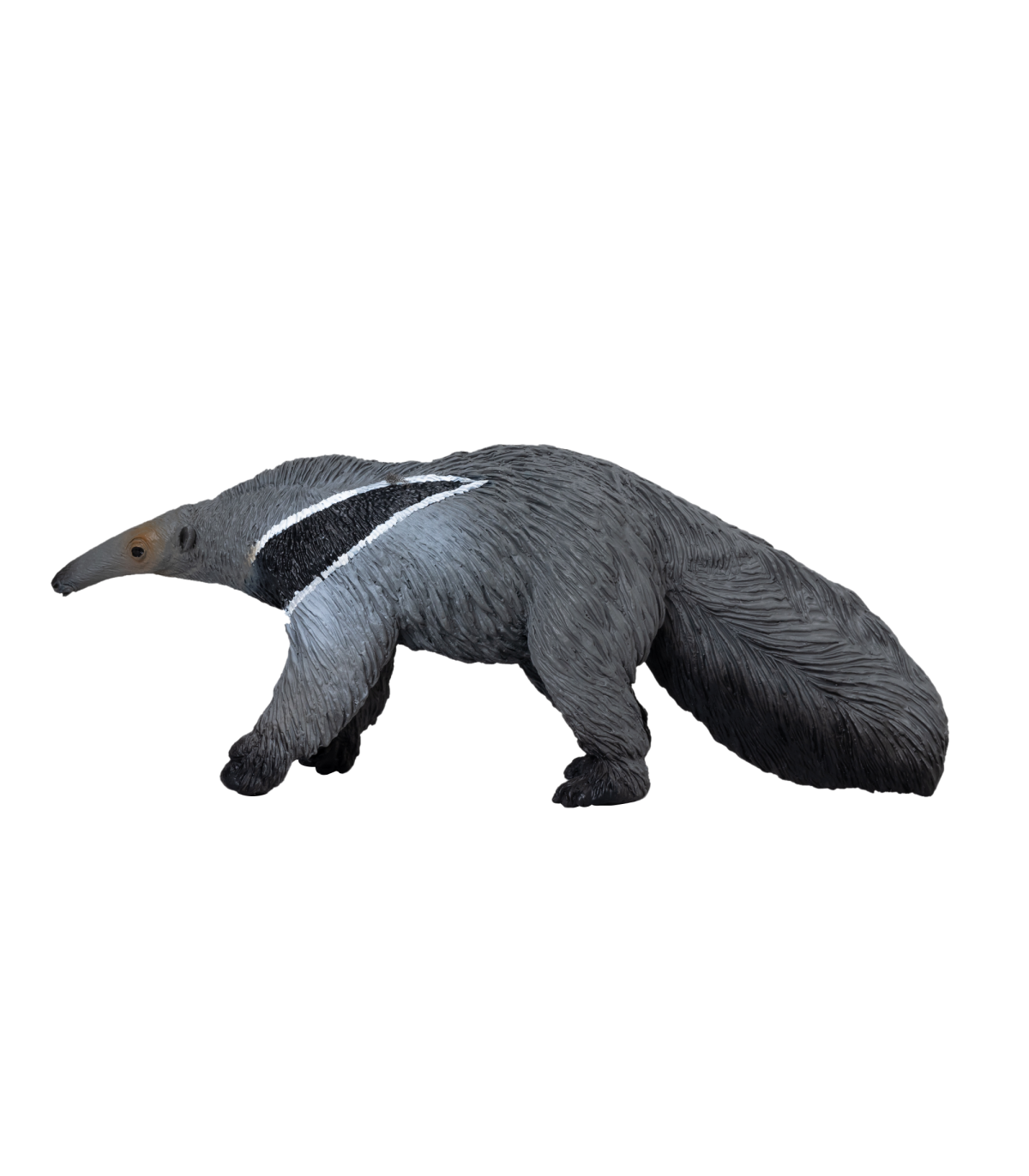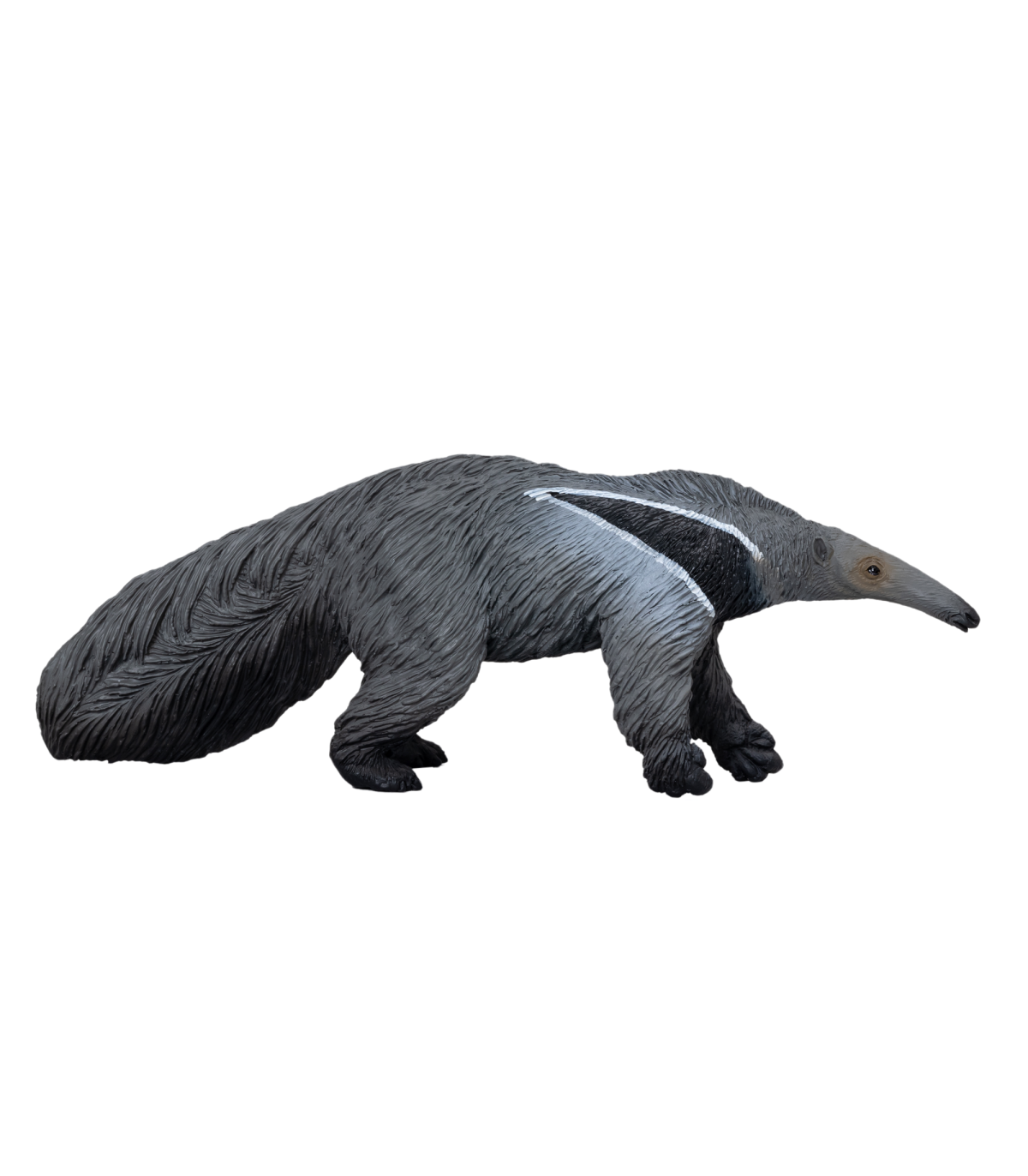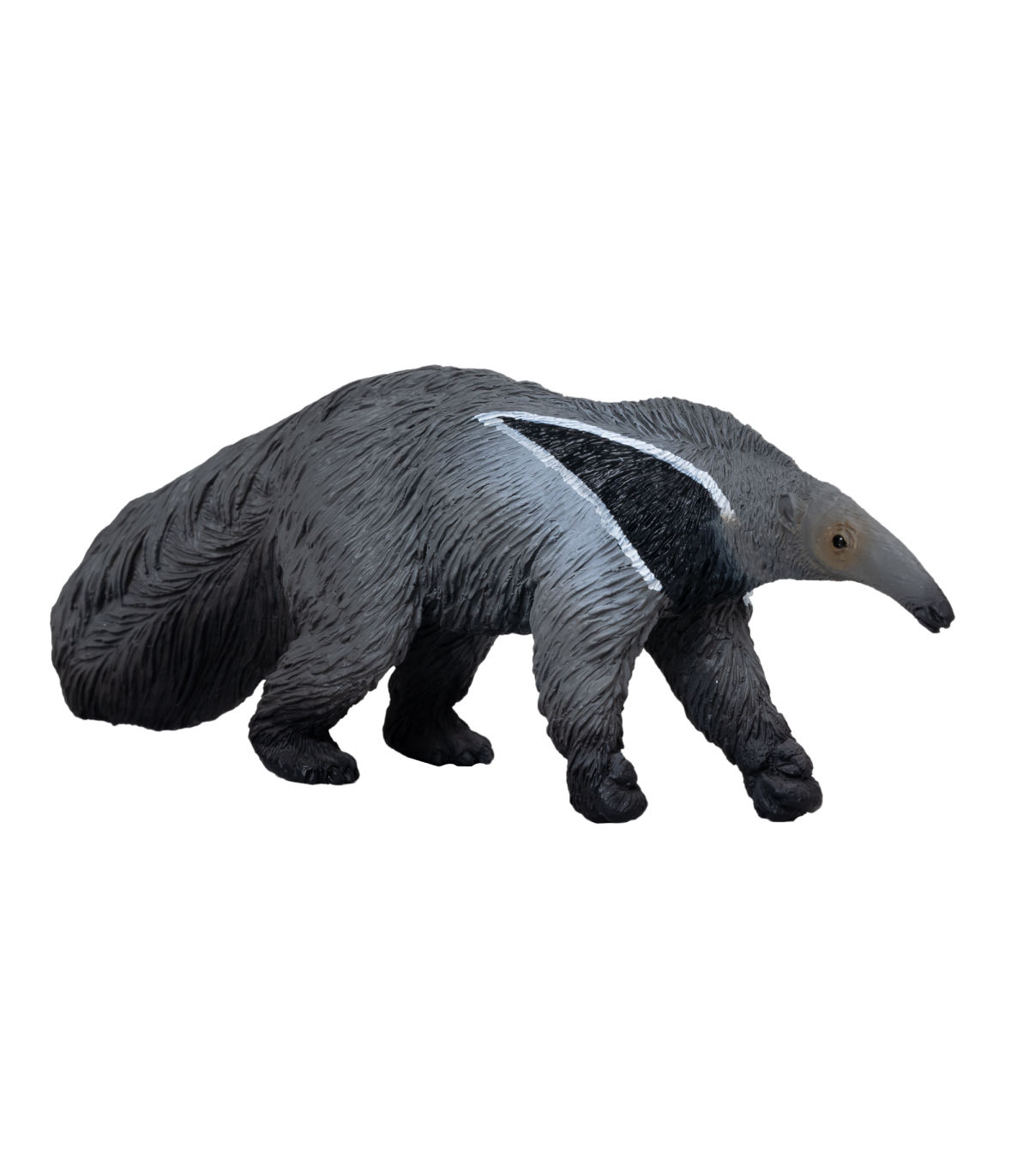 Anteaters are edentate animals meaning they have no teeth. But their long tongues are more than sufficient to lap up the 35,000 ants and termites they swallow whole each day. As the largest of all four anteater species, the giant anteater can reach eight feet long from the tip of its snout to the end of its tail. It is covered in grayish brown fur with white front legs, black stripes running from its chest to its back, and a bushy tail.