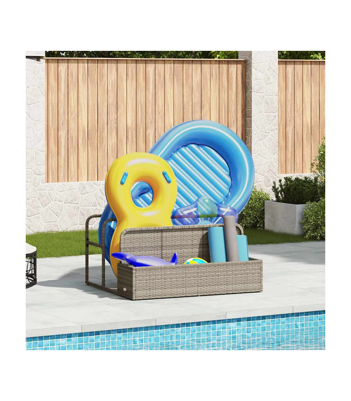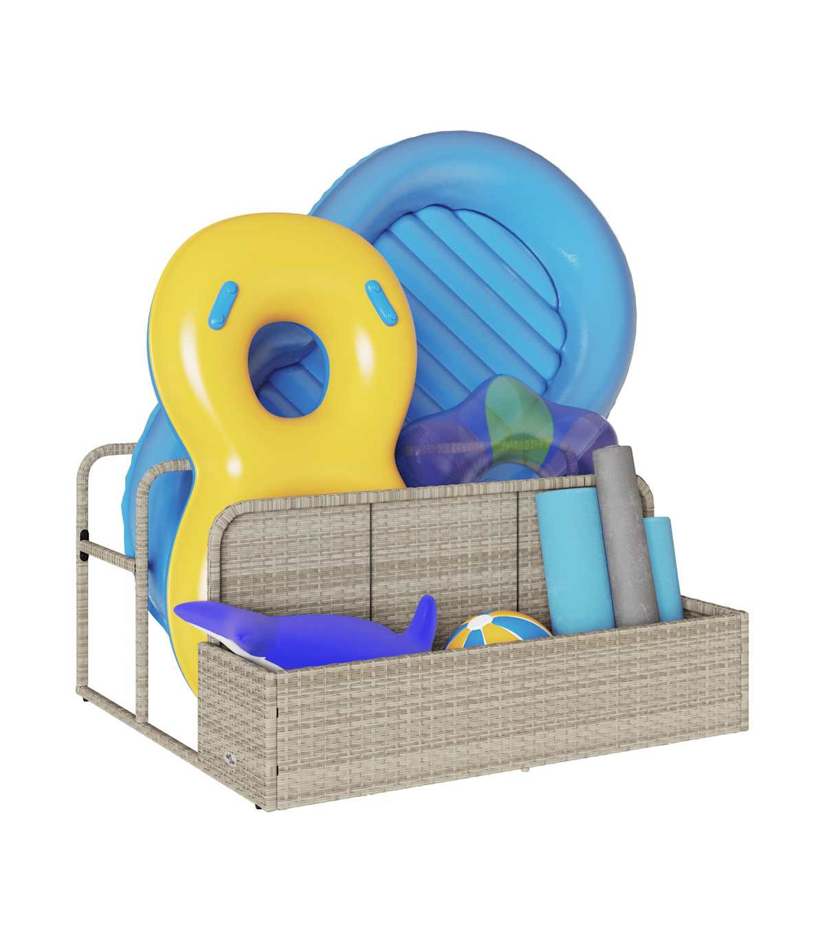 Create a neat outdoor space with this poolside float storage and enjoy a relaxing good time! Durable material: PE rattan, also known as poly rattan, is a strong, low-maintenance synthetic material that looks like natural rattan. It's lightweight, easy to clean, and commonly used for outdoor furniture due to its durability and weather-resistant properties.Ample storage space: Features a large storage basket and 2 open compartments with rails, this poolside storage makes it easy to organise pool toys, buoys, towels, or other essentials.Versatile use: This pool storage is lightweight and can be easily moved, perfect for poolside, patio, garden, balcony, etc., making your outdoor space neat and organised.Robust and stable frame: The powder-coated steel frame ensures that the garden furniture is strong and stable for daily outdoor use. Good to know:To make sure your outdoor furniture stays beautiful, we recommend protecting it with a waterproof cover.
