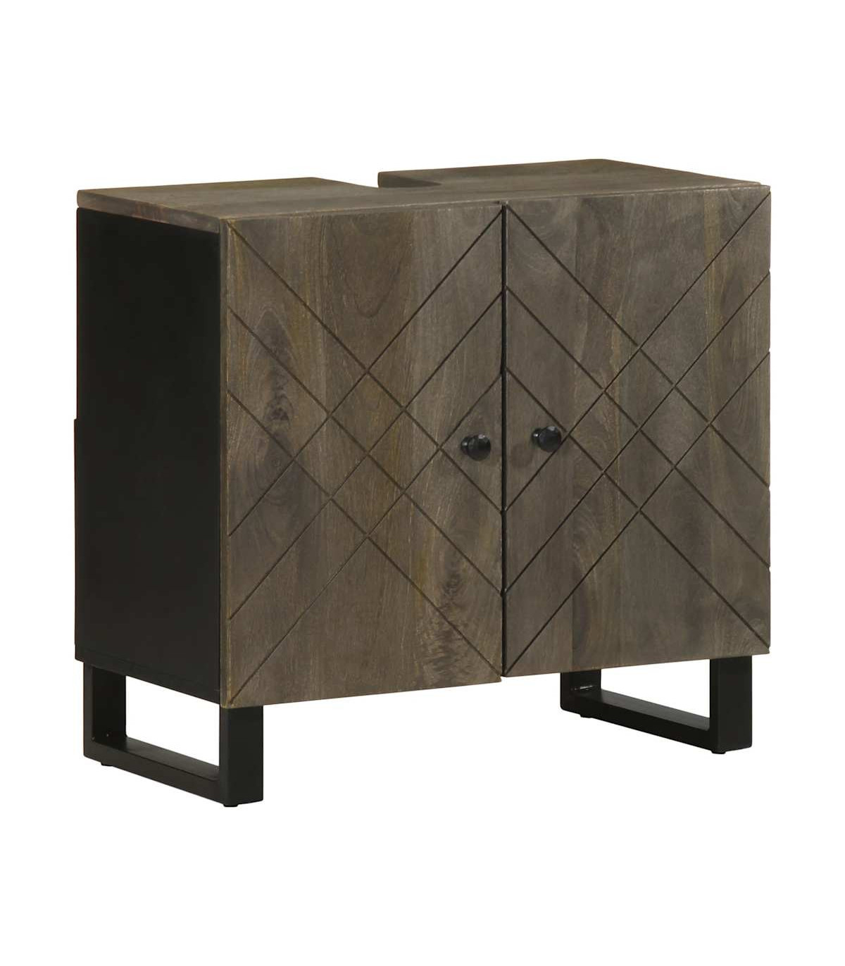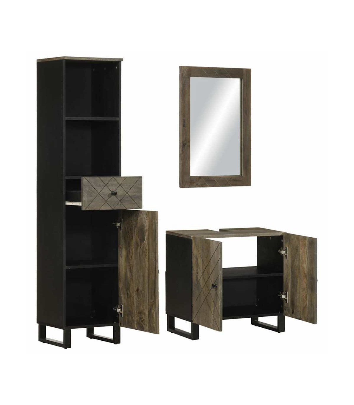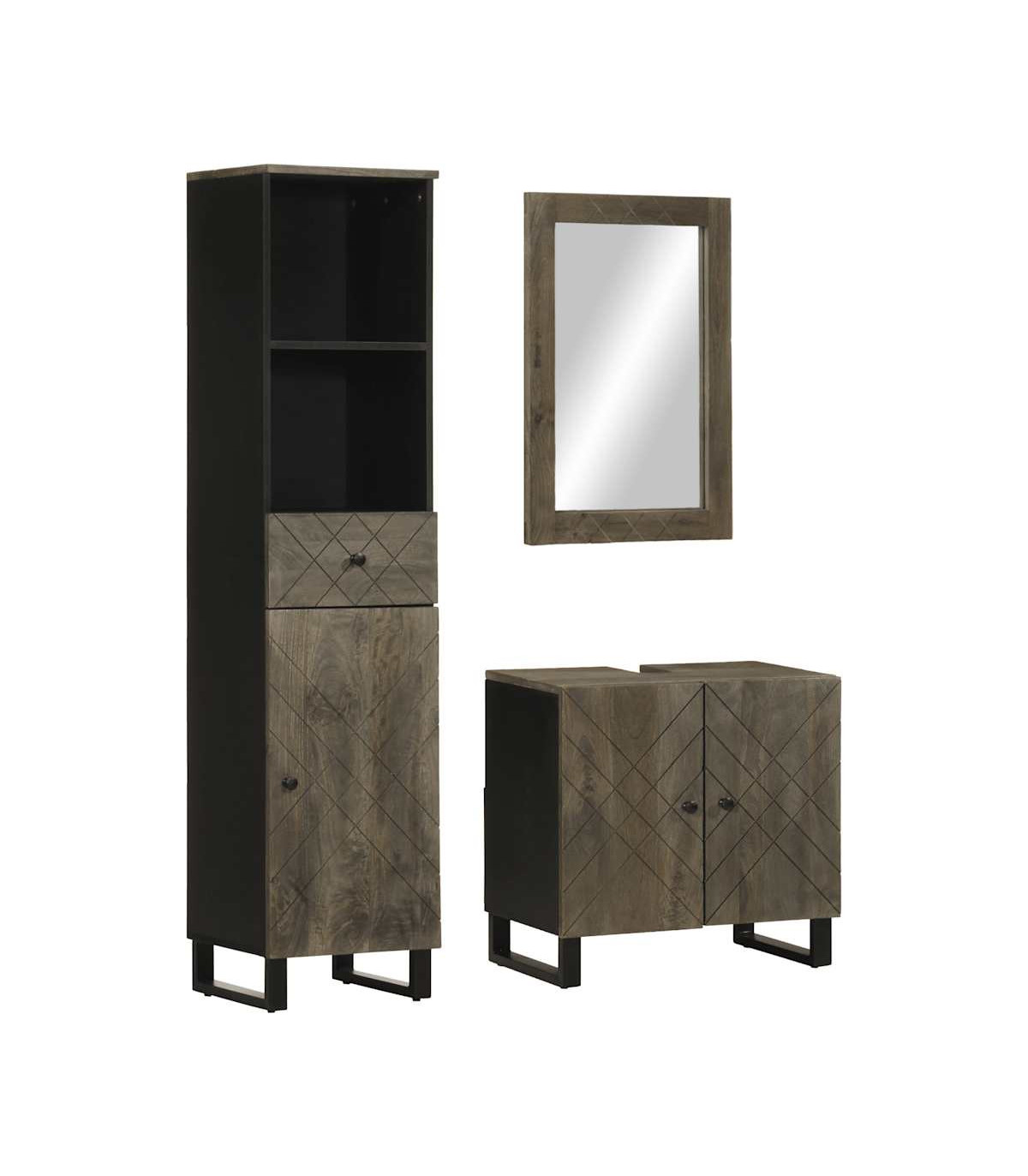 This stylish bathroom furniture set is an excellent addition to your bathroom, giving it a tidy and striking appearance! Robust and stable material: Solid mango wood, a robust tropical hardwood, is highly favoured for furniture making for its exceptional durability and strength. Its beautiful wood grains make every piece of furniture slightly different from the next.Durable material: This vanity mirror is made of glass surrounded by a solid mango wood frame, ensuring stability and durability.Metal feet: This cabinet is supported by sturdy metal feet to ensure stability, safety, and firmness.Ample storage space: This bathroom furniture offers ample storage space to keep your essentials well organised and within reach.Practical door: The door of the storage cabinet provides enclosed storage space to keep your belongings organised, protected and out of sight. Warning:To prevent it from tipping over, this product must be used with the provided wall attachment device. Good to know:Each item is unique with variations in colours and grains. The delivery is random, ensuring the exclusivity and individuality of your product.Screws and plugs for inside the wall are not included. We advise to find and use screws and plugs suitable specifically for your walls. If you're not sure, you can consult with a professional. Please read and follow each step of the instructions.