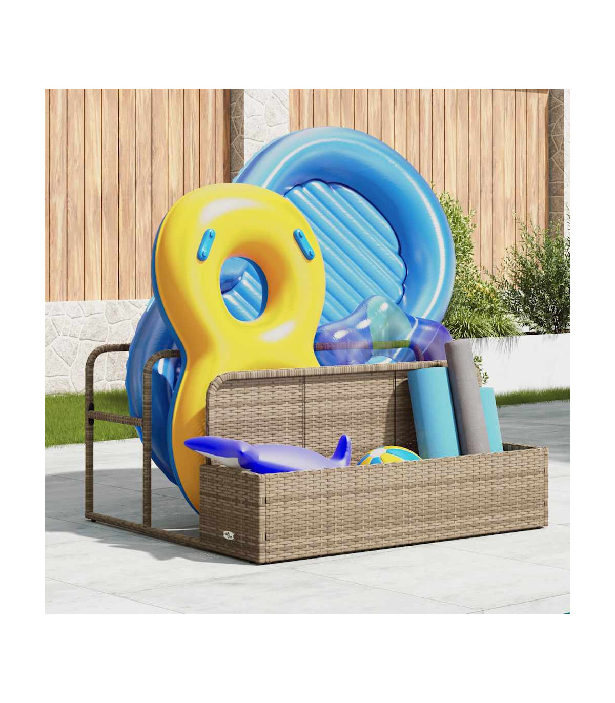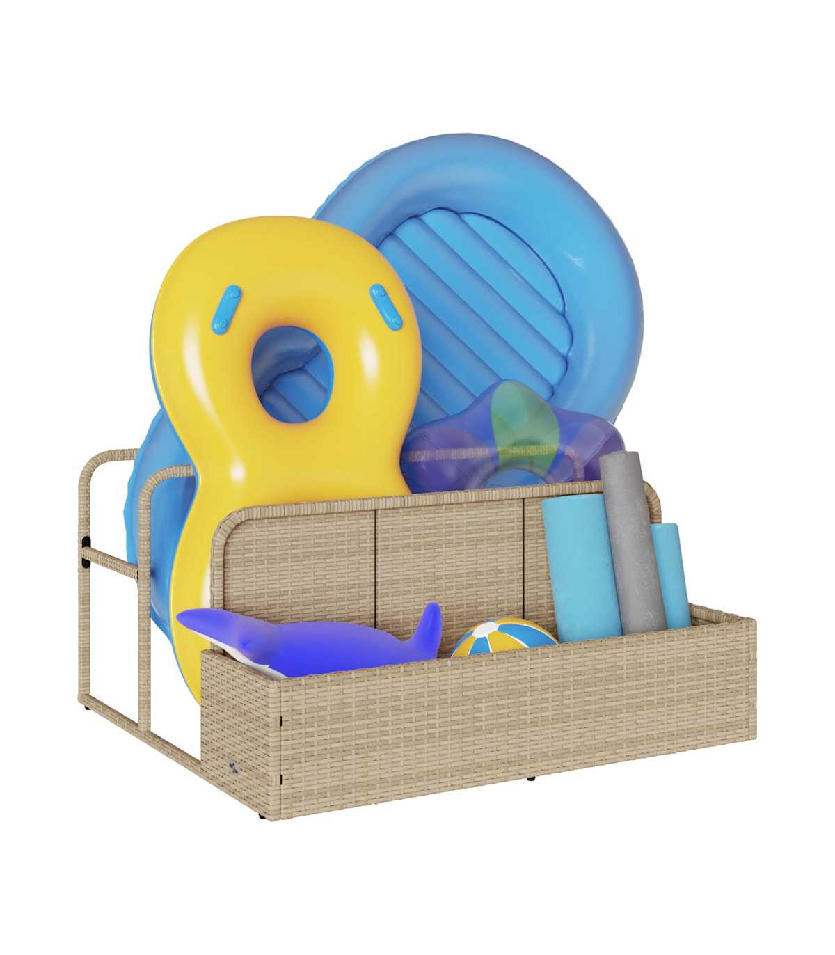 Create a neat outdoor space with this poolside float storage and enjoy a relaxing good time! Durable material: PE rattan, also known as poly rattan, is a strong, low-maintenance synthetic material that looks like natural rattan. It's lightweight, easy to clean, and commonly used for outdoor furniture due to its durability and weather-resistant properties.Ample storage space: Features a large storage basket and 2 open compartments with rails, this poolside storage makes it easy to organise pool toys, buoys, towels, or other essentials.Versatile use: This pool storage is lightweight and can be easily moved, perfect for poolside, patio, garden, balcony, etc., making your outdoor space neat and organised.Robust and stable frame: The powder-coated steel frame ensures that the garden furniture is strong and stable for daily outdoor use. Good to know:To make sure your outdoor furniture stays beautiful, we recommend protecting it with a waterproof cover.