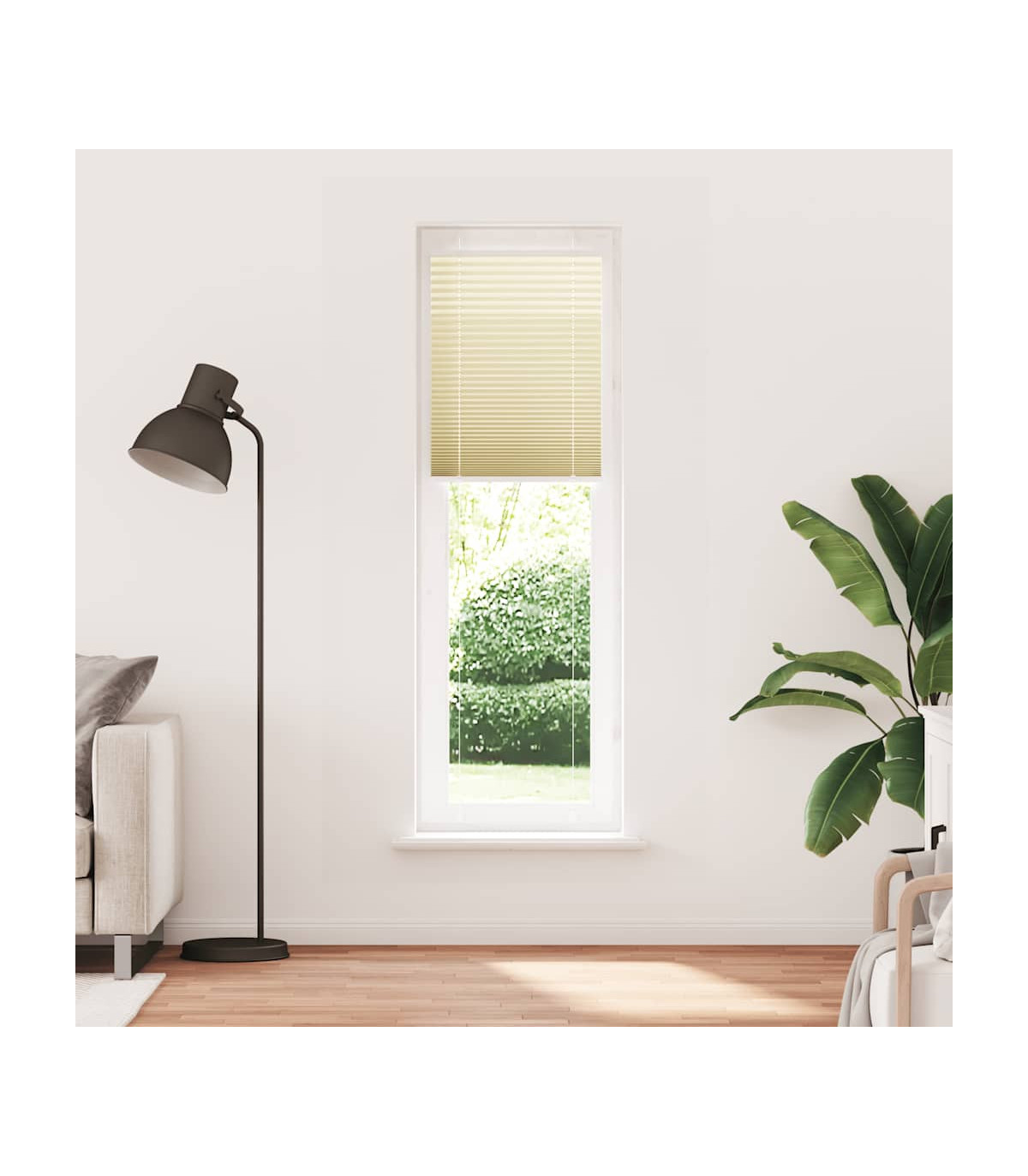 Elevate your room's style and functionality with this pleated blind, offering privacy and elegance. Durable and low maintenance: Made from 100% polyester, the pleated blind is built to last and resist wear and tear. They are also easy to clean, typically requiring light dusting or wiping with a damp cloth.Privacy and sun protection: The blind is not transparent but also not fully darkening, providing optimal privacy and glare protection with its pleated fabric. You can adjust the level of privacy by moving it up or down.Two assembly ways: You can attach the pleated blind to the wall or window with screws or without drilling using clamping brackets, depending on your needs.Elegant design: Thanks to its sleek and modern pattern design, this pleated blind effortlessly complements a variety of room decor. You can use it in the living room, bedroom, office, and so on. Warning:Keep cords out of the reach of young children. Cords may become wrapped around a child’s neck. Good to know:Before buying blinds, start by measuring your window glass. Just a friendly tip: the fabric is a bit narrower than the total width, including the brackets.To make sure your new blinds provide complete coverage, just add 0,6 cm to the width of the window glass when calculating what to order.