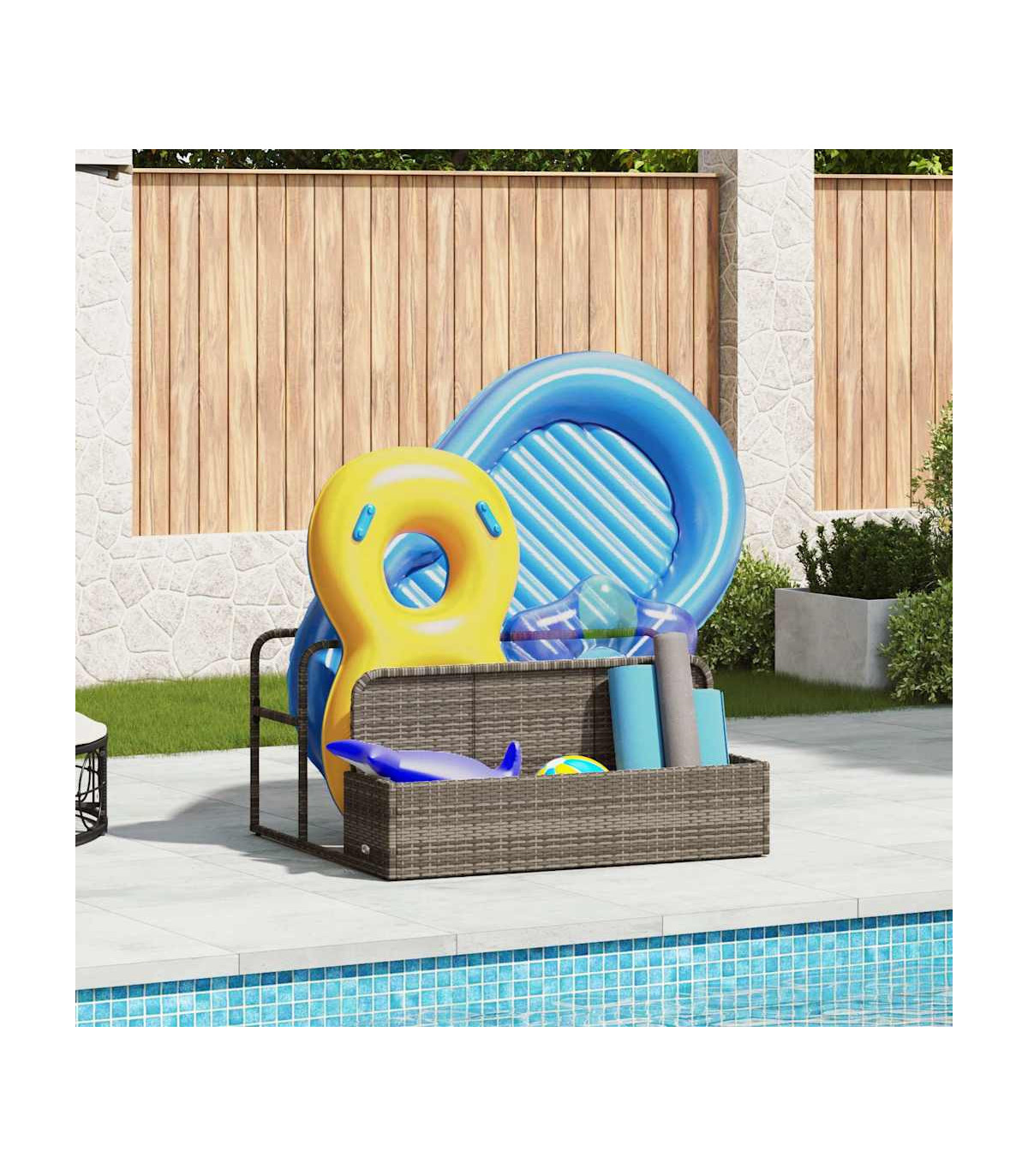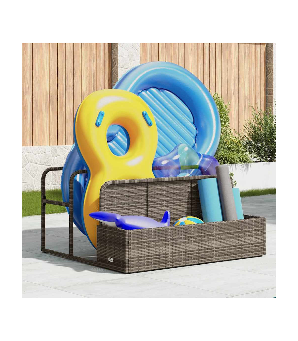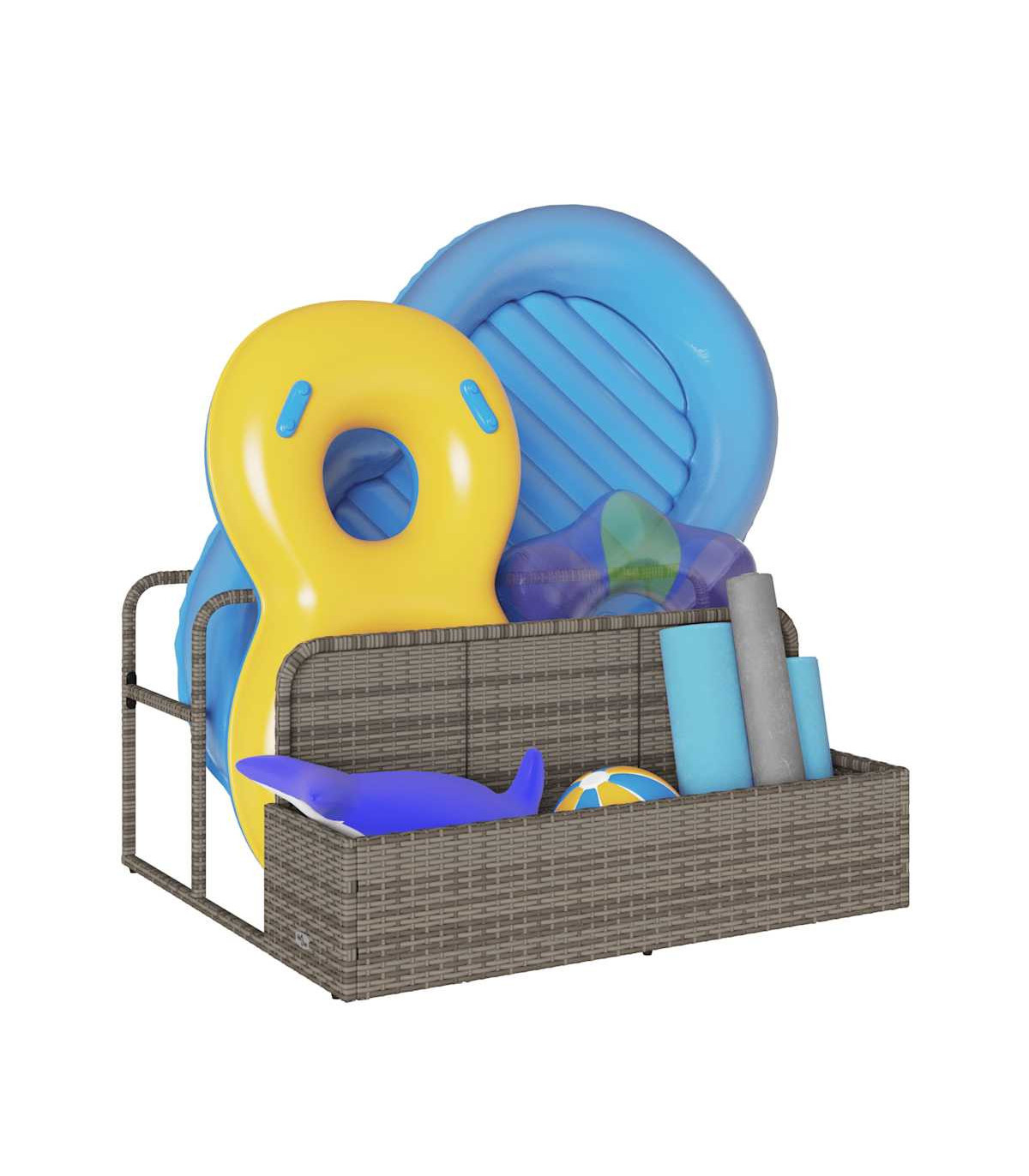 Create a neat outdoor space with this poolside float storage and enjoy a relaxing good time! Durable material: PE rattan, also known as poly rattan, is a strong, low-maintenance synthetic material that looks like natural rattan. It's lightweight, easy to clean, and commonly used for outdoor furniture due to its durability and weather-resistant properties.Ample storage space: Features a large storage basket and 2 open compartments with rails, this poolside storage makes it easy to organise pool toys, buoys, towels, or other essentials.Versatile use: This pool storage is lightweight and can be easily moved, perfect for poolside, patio, garden, balcony, etc., making your outdoor space neat and organised.Robust and stable frame: The powder-coated steel frame ensures that the garden furniture is strong and stable for daily outdoor use. Good to know:To make sure your outdoor furniture stays beautiful, we recommend protecting it with a waterproof cover.