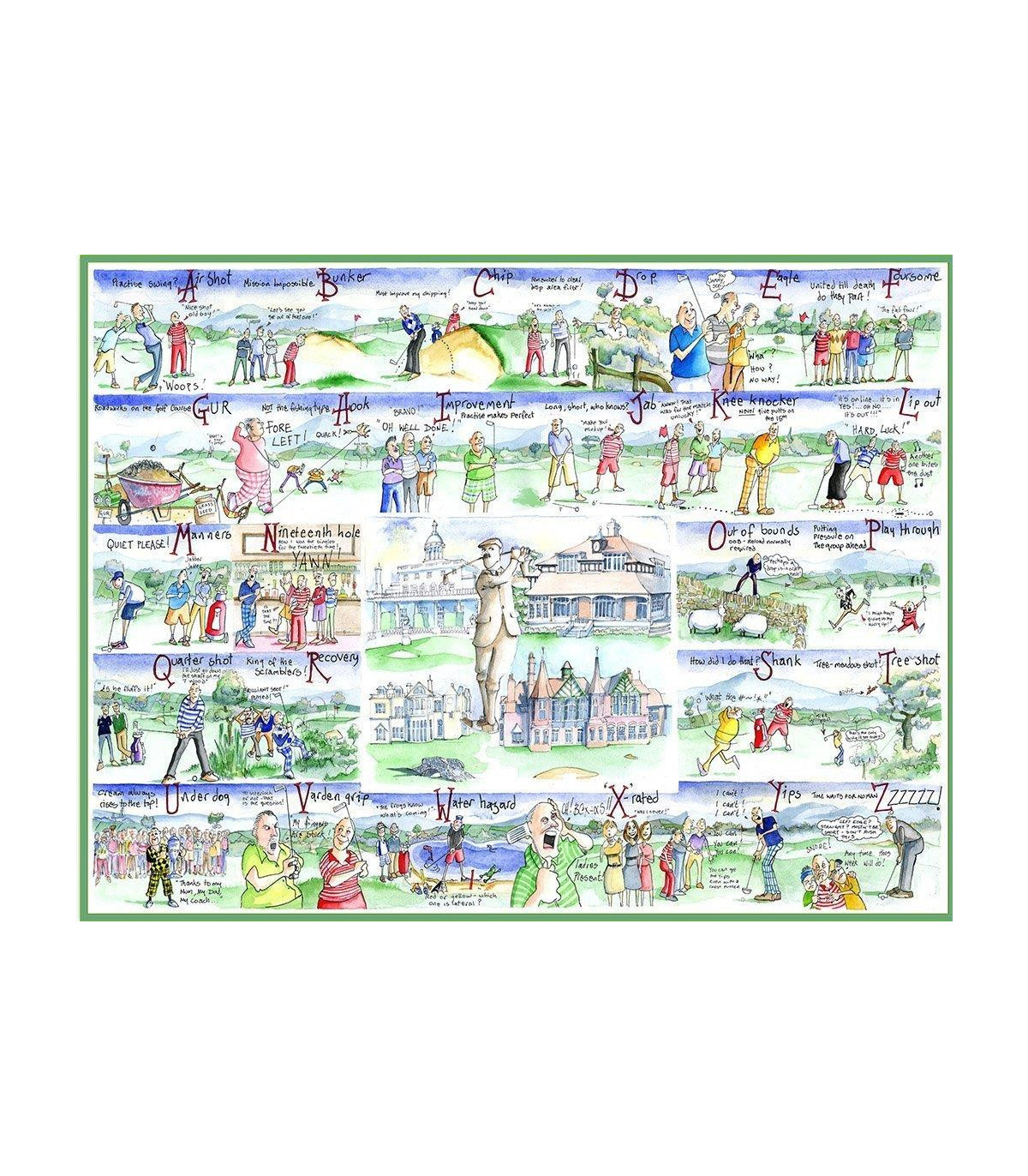 A brilliant A-Z of all things Golf; this jigsaw puzzle will humour you and may even teach you a thing or two about golfing terminology (some technical, some not so much!) You will find excellent illustrations next to each letter, such as H for Hook, Q for Quarter Shot and Z for Zzzzzz.