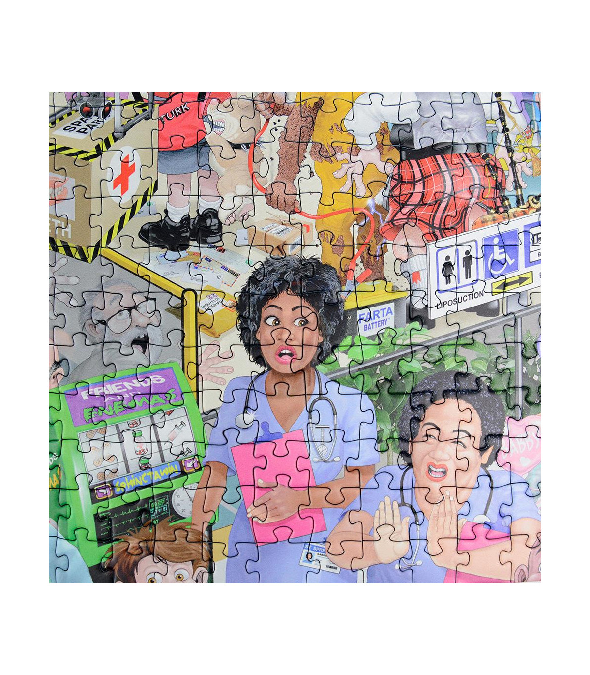 This isn’t your typical accident and emergency room; it’s a full-blown cartoon comedy explosion. An ambulance has just dropped off a fresh batch of patients and the hospital is now a whirlwind of accidental antics and an array of wild mishaps. Bursting with medicinal mirth, this puzzle will have you grinning from ear to ear and laughing through every twist and turn! This emergency room will leave you entertained for hours as you unravel the daily mayhem and mishaps inside this hilarious new healthcare jigsaw puzzle.