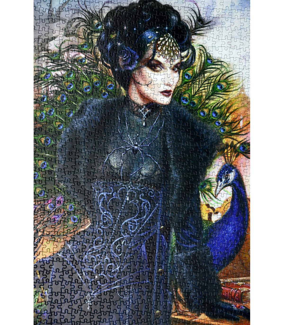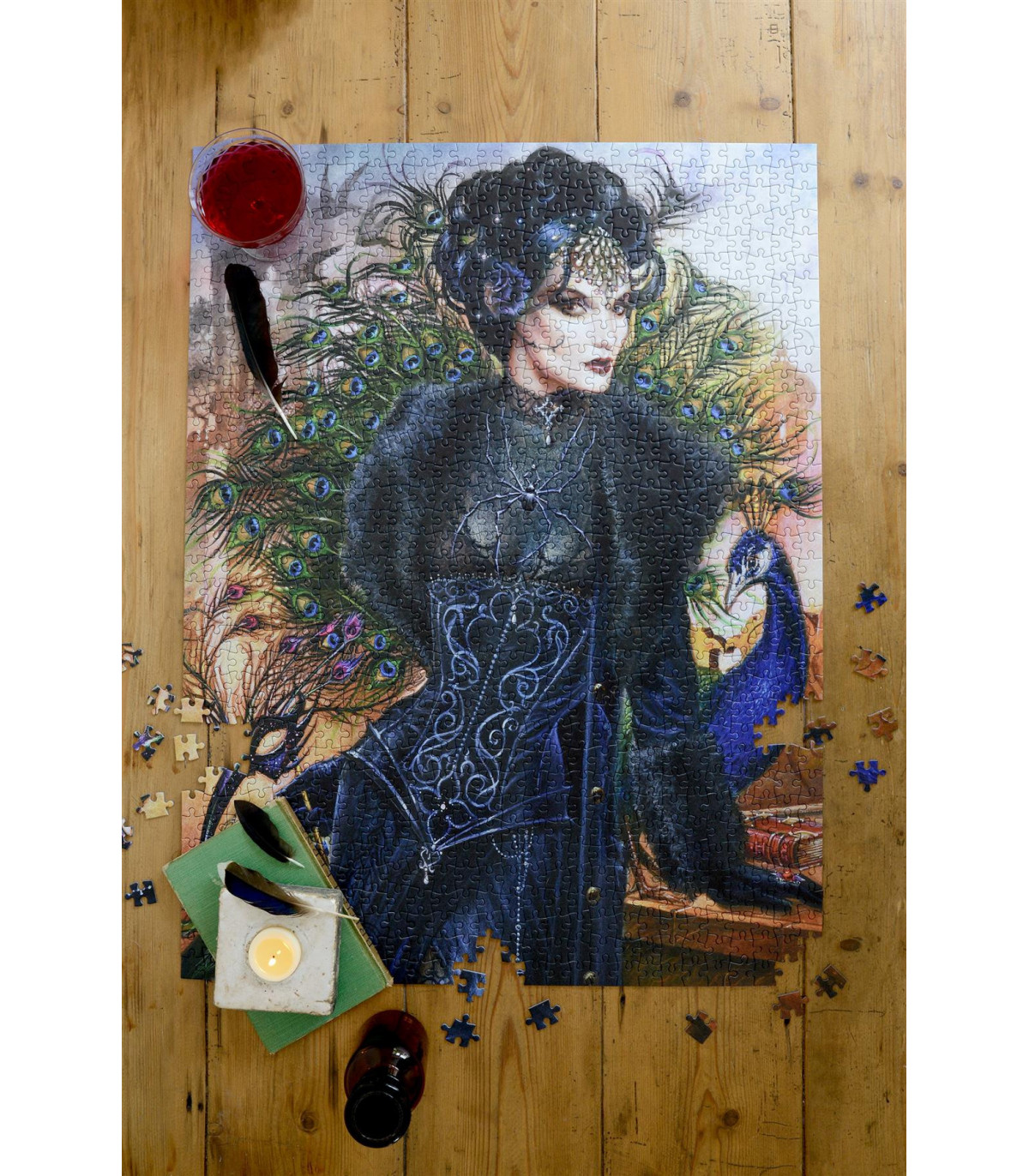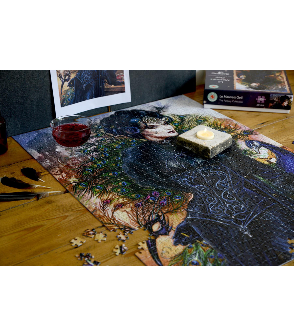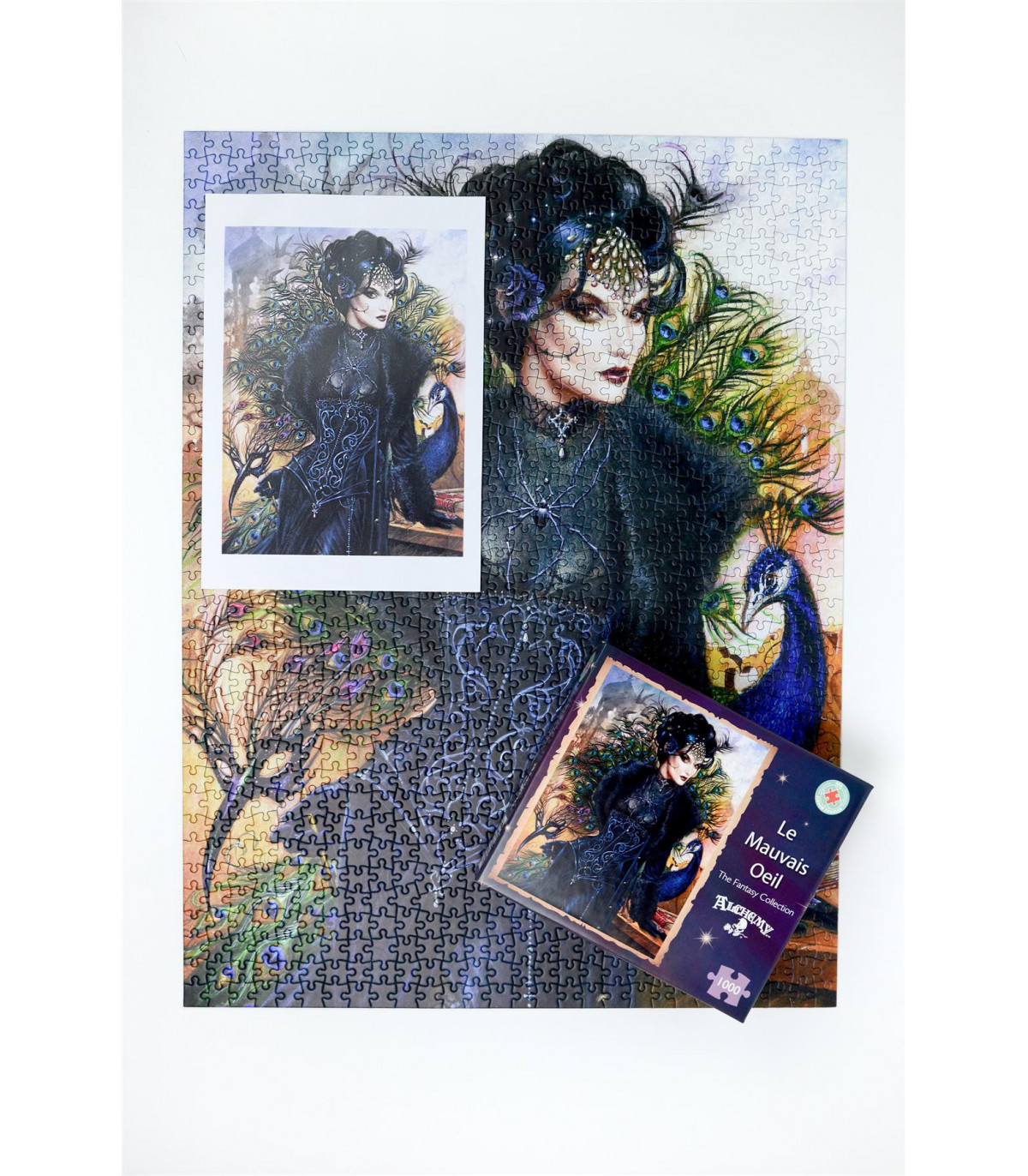 Piece together the malevolent glare of Le Mauvais Oeil with Alchemy's latest 1000 Piece Jigsaw Puzzle. A deliciously dark puzzle to make your friends envious of your puzzling table. Discover the magical world of Alchemy as you puzzle the spectacular stare of Le Mauvais Oeil, guarding her precious peacock. Dressed in a beautiful black bodice and dressed to impress it is hard to look away from this enchanting puzzle. Fantasy lovers will love piecing this puzzle together as they enter another world of fantasy and own a piece of Avalon in your home. Key Features: 1000 Pieces of mystical fun! Measures 50 x 66 cm when complete Part of the Alchemy Range The perfect gift for Fantasy Lovers!