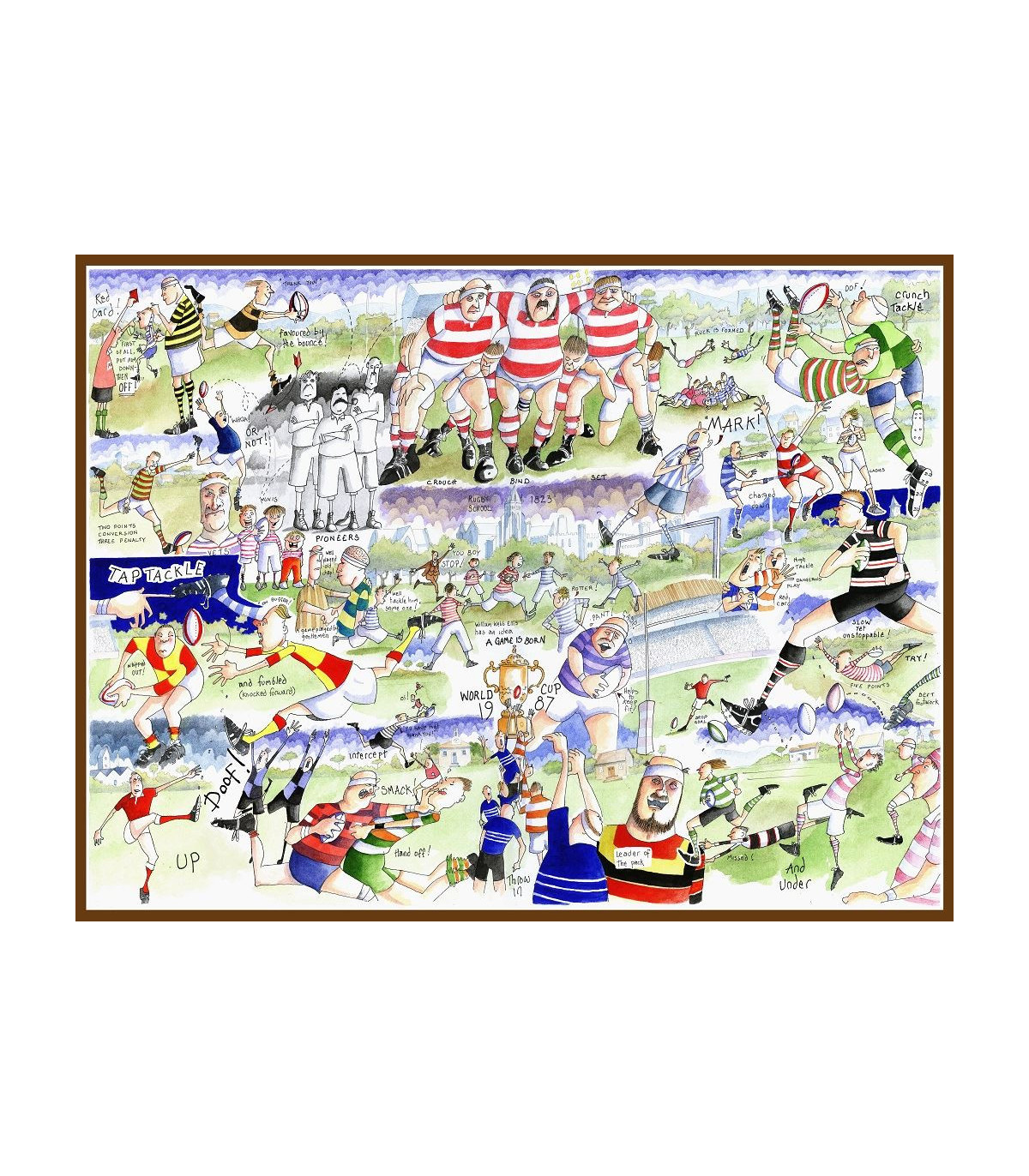 A fun illustration all about Rugby! This jigsaw puzzle by Tim Bulmer features this traditional and popular sport, highlighting idiosyncrasies associated with the game and fun illustrations. William Webb Ellis had an idea while playing a game of football... and an idea was born! This fact is depicted in an amusing way in this fun puzzle, as well as different Rugby terms, like tap tackle, try, crunch tackle and ruck. Find more fun and interesting Rugby facts in this wonderful puzzle, illustrated by Tim Bulmer. Tim Bulmer is a talented artist from the UK, known for this witty and humorous artwork and for not taking life too seriously! His artwork truly reflects his light-hearted attitude and his fantastic designs will leave you highly amused. Dimensions: 66 x 50cm Number of Pieces: 1000