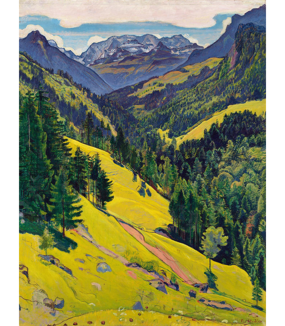 Ferdinand Hodler captures the essential structure of the landscape in this painting. Using vibrant colours in his artwork, Hodler has created a sense of timelessness and harmony in this piece.