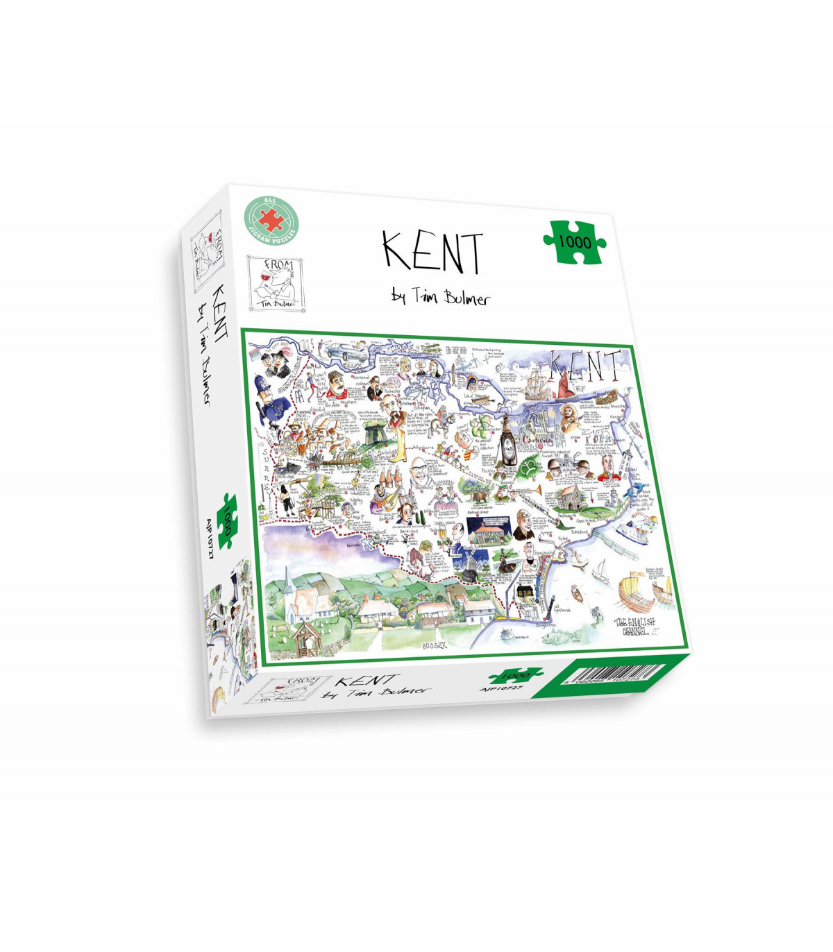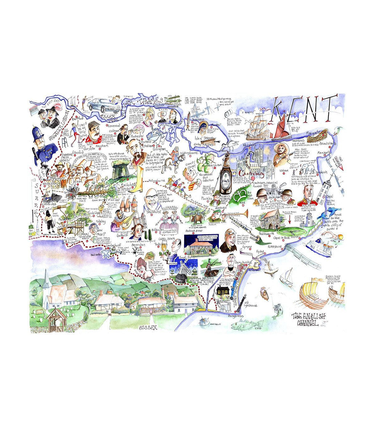 Within this map design you will find the channel tunnel, an Elephant that was gifted to King Henry III in 1255, the comedian Harry Hill and the Wye Crown.