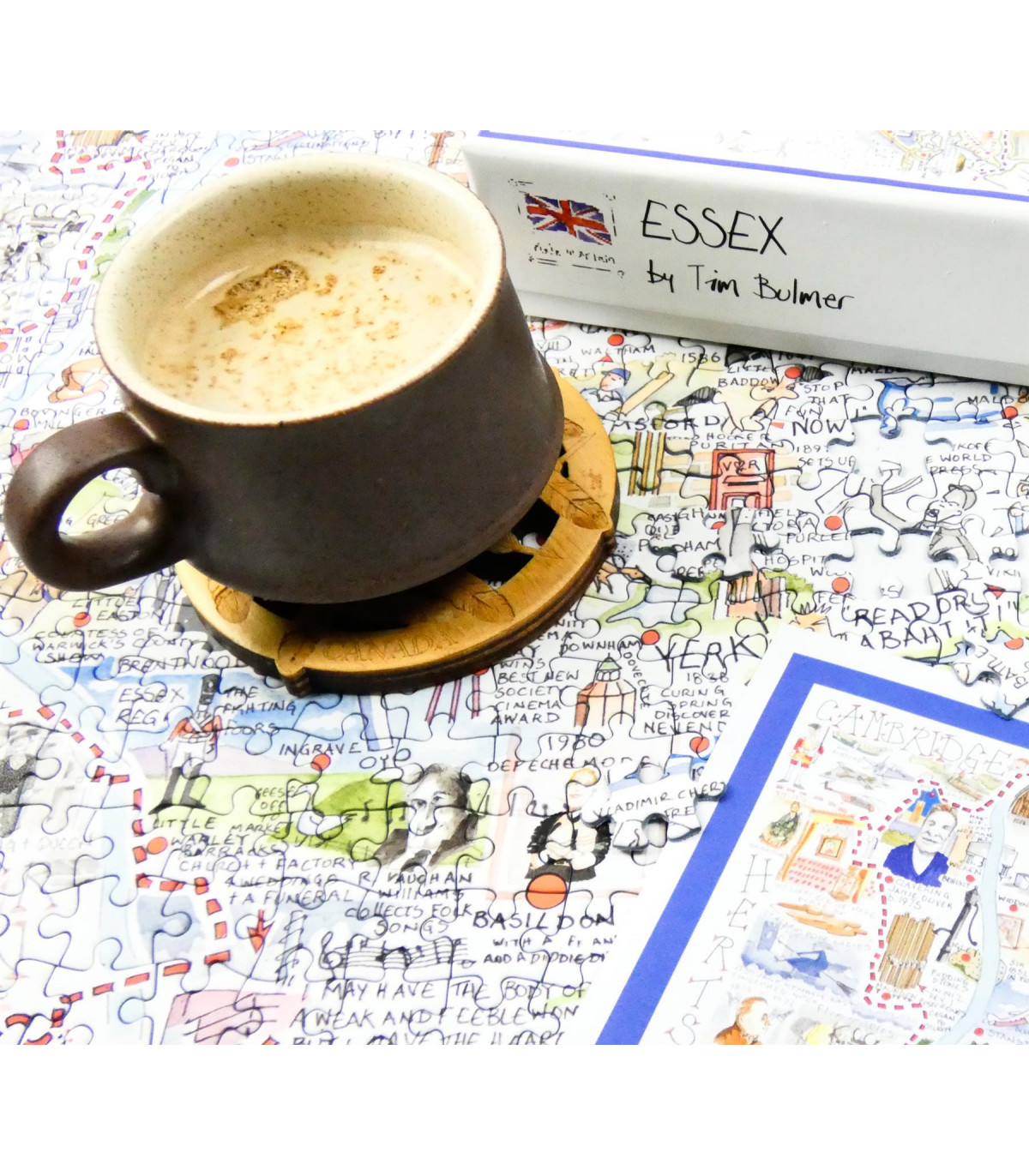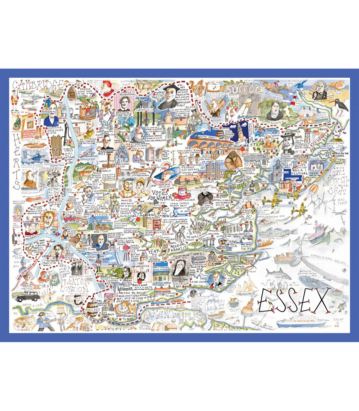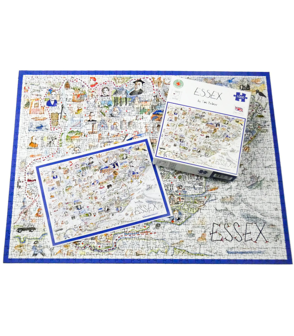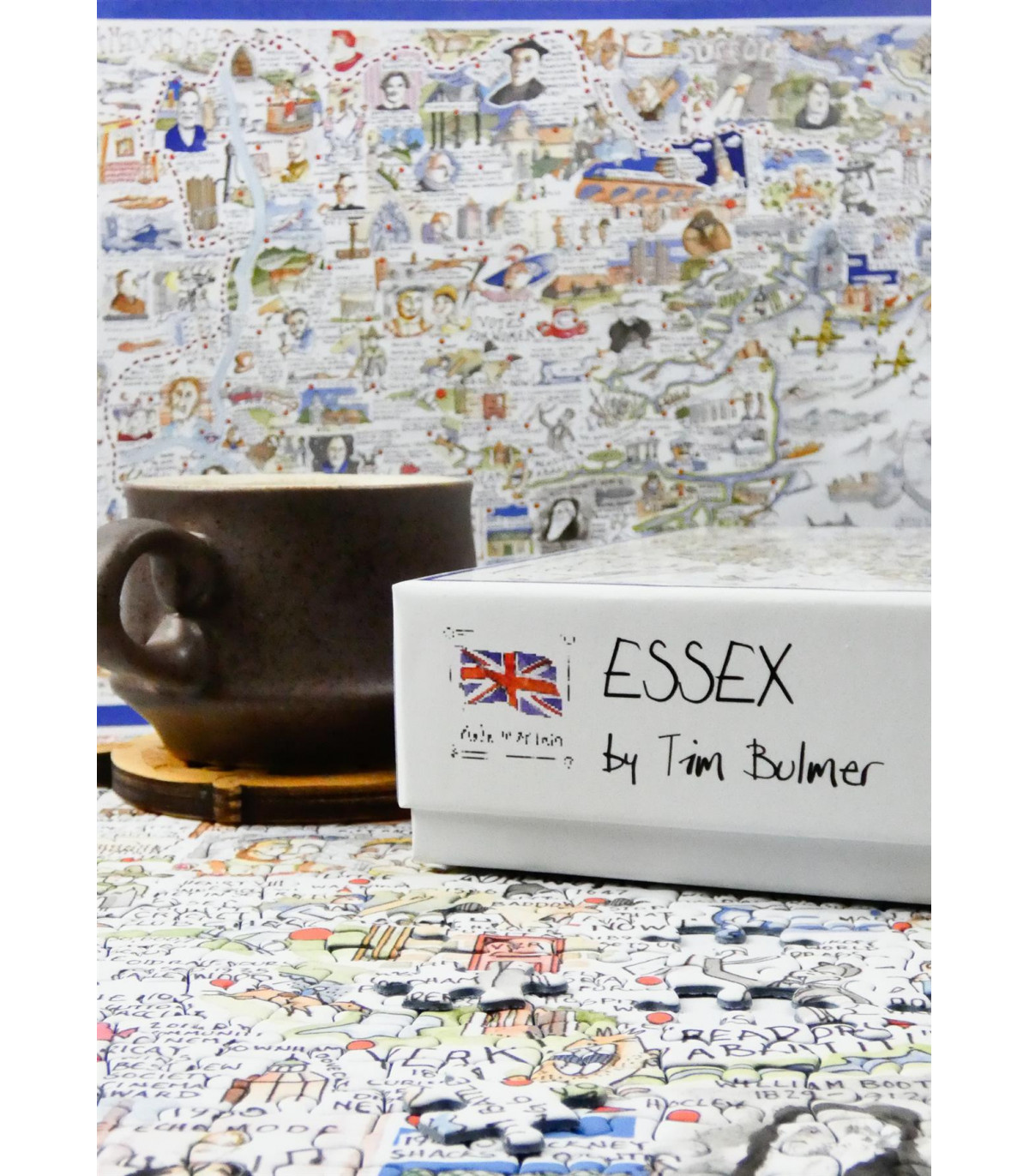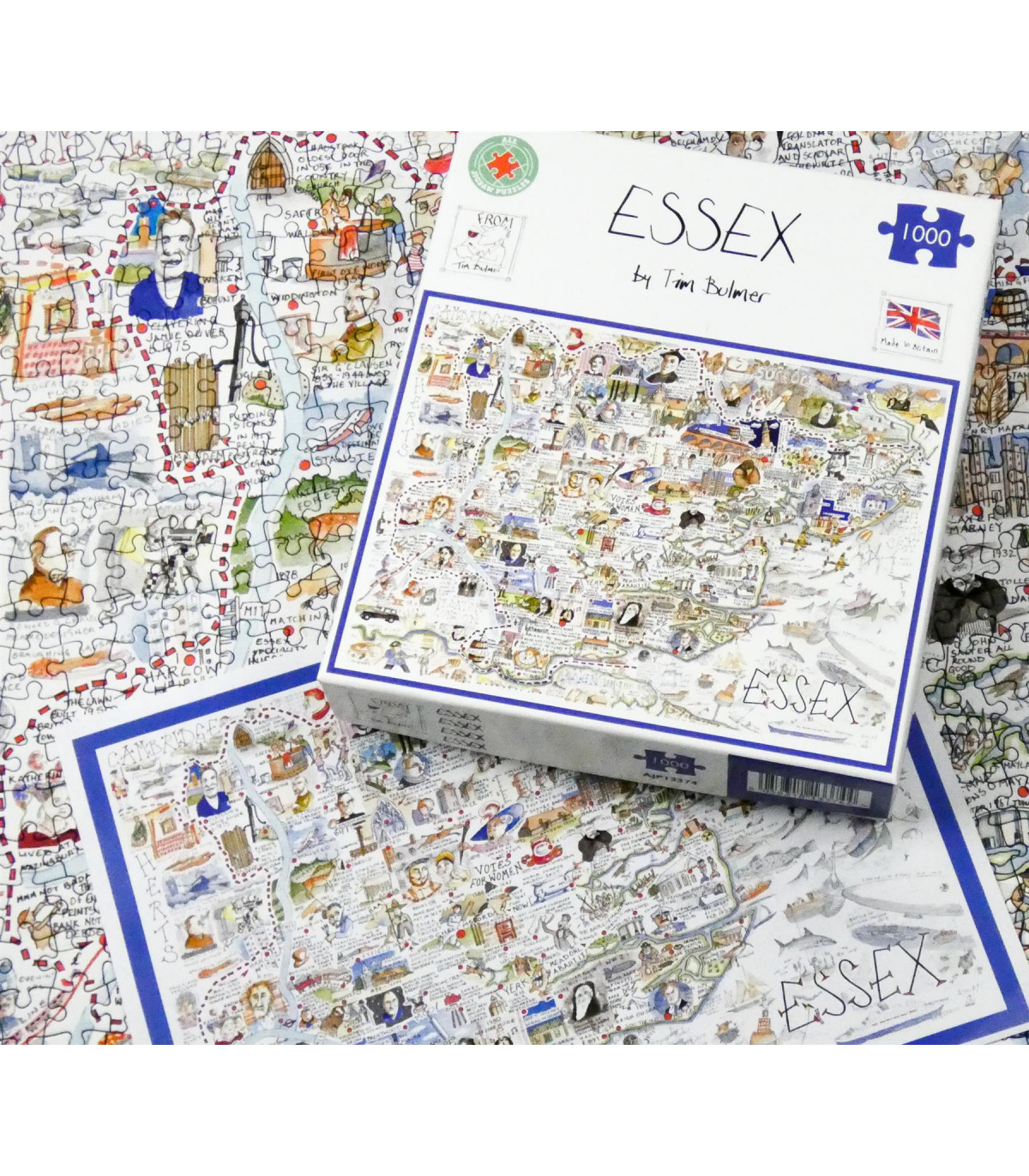 Get 'reem' with our latest regional map jigsaw from Tim Bulmer. Our exciting new Essex puzzle borders Greater London and Kent. Tim take's you on a tour like no other covering everything Essex, from fake tan to �Tiptree�jam! Full of fascinating facts and fun this puzzle will not disappoint. Clusteredwith celebrities and some of Britain�s most expensive homes. The magnificentmayflower was historically built here. Did you know Essex is famously home tono other than the naked chef Jamie Oliver? Or that it has longest pier in the world? So much to learn and explore in our ever expanding range. Get yours today!