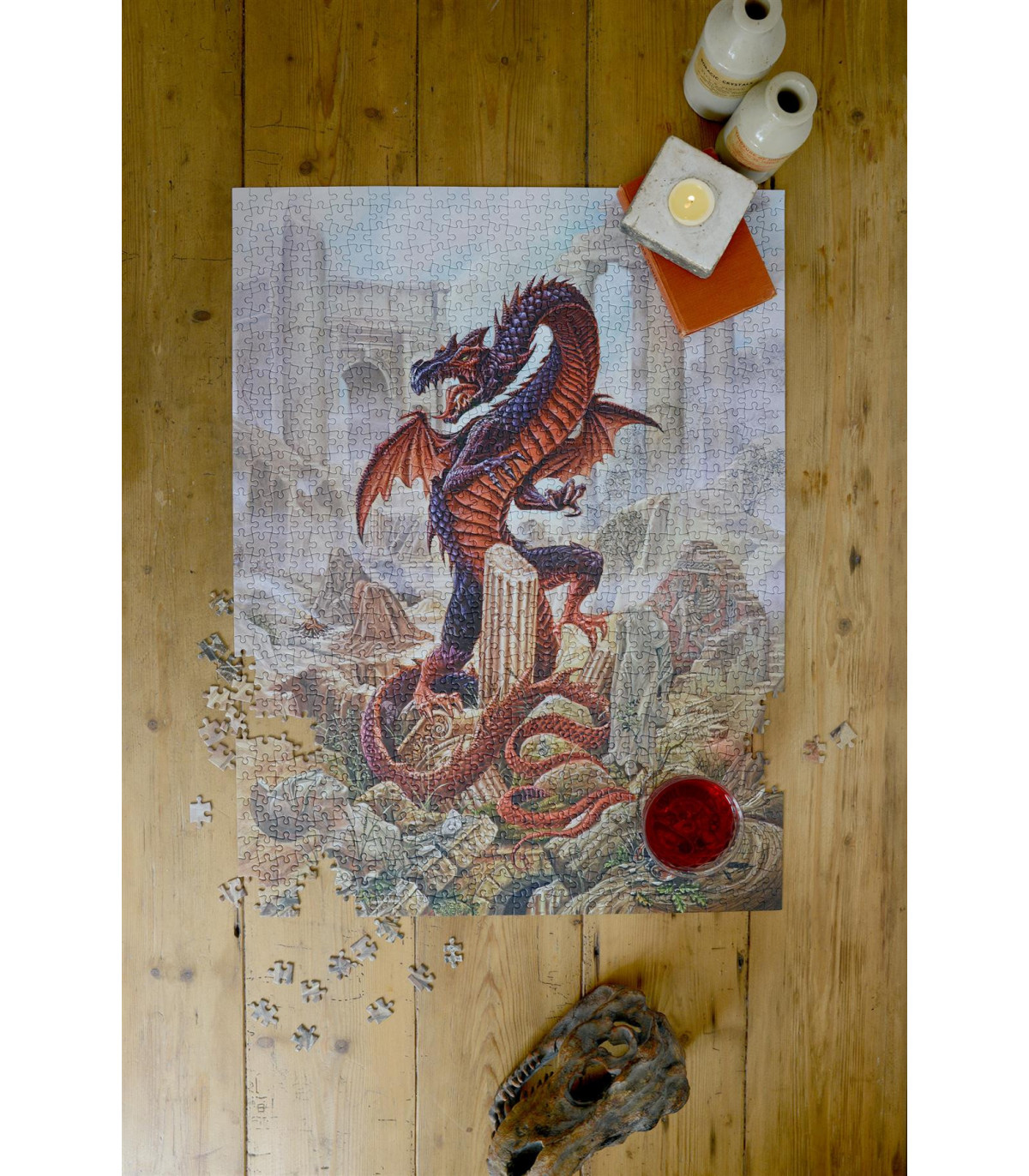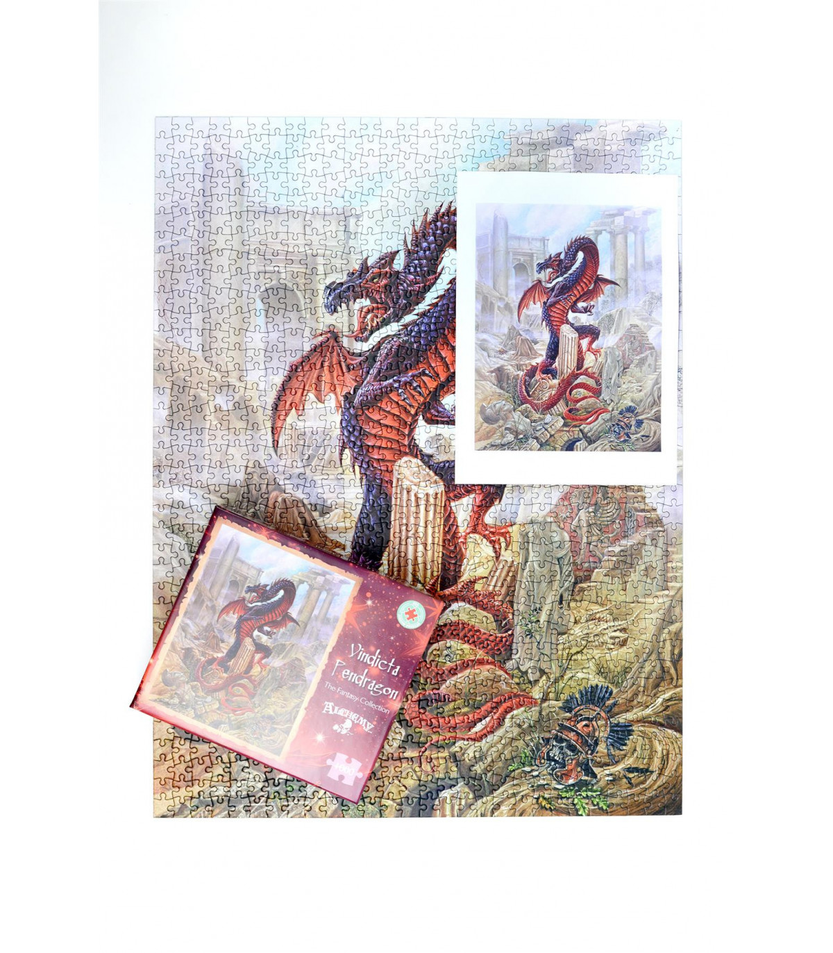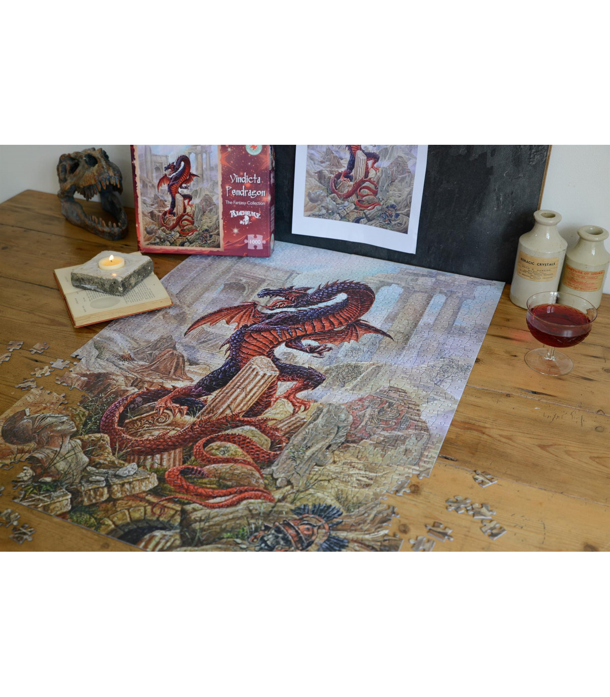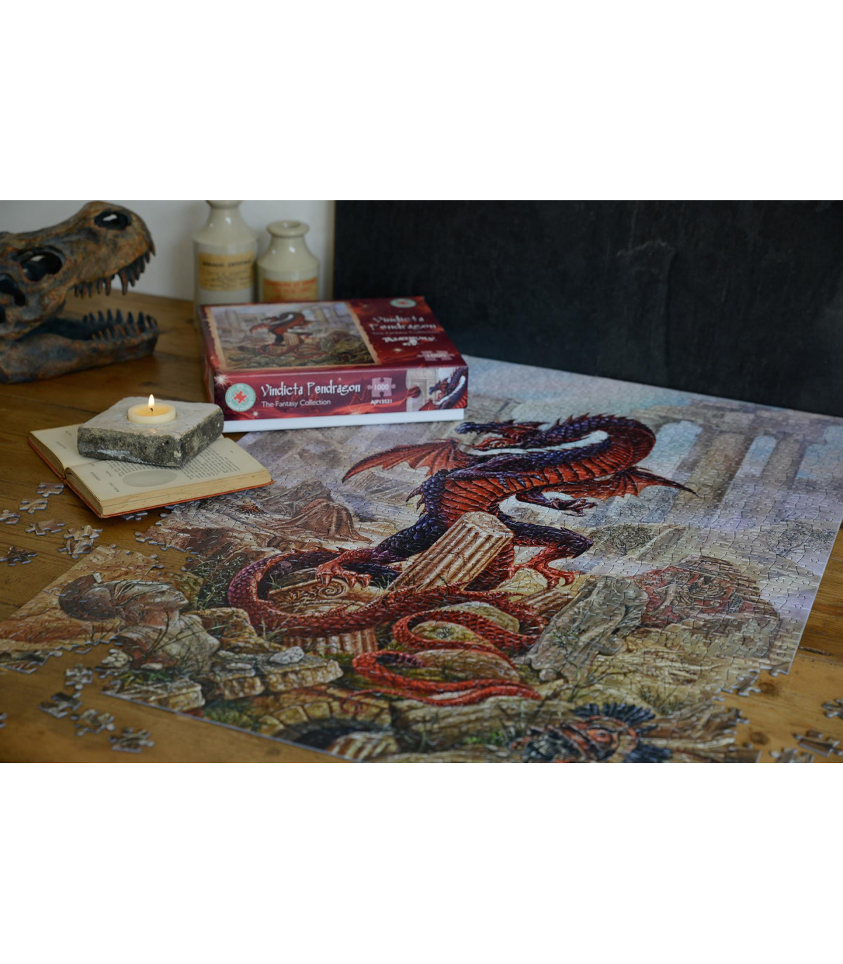 Embark on a whimsical adventure with the Vindicta Pendragon 1000 Piece Jigsaw Puzzle. Piece together a majestic dragon in a mystical ruins setting, evoking a sense of wonder and fantasy. Transport yourself into this magical realm and unleash your inner dragon with this fantasy jigsaw puzzle! Will you order this puzzle and slay the dragon?