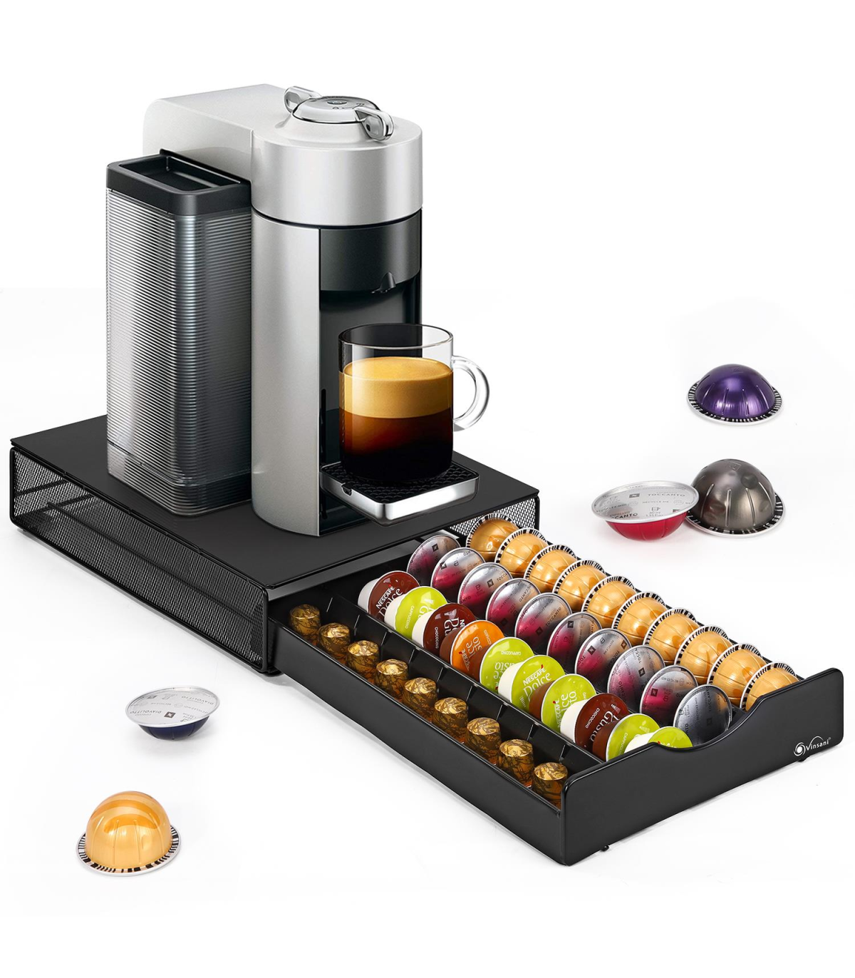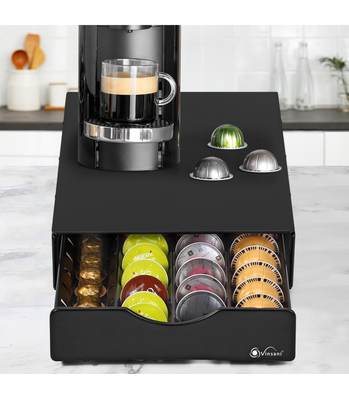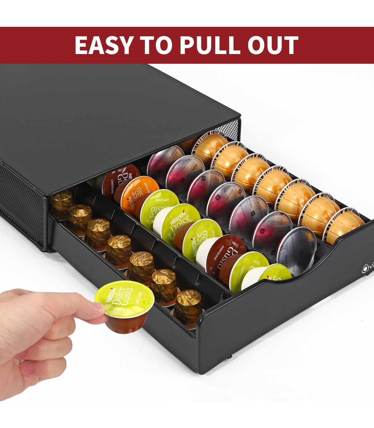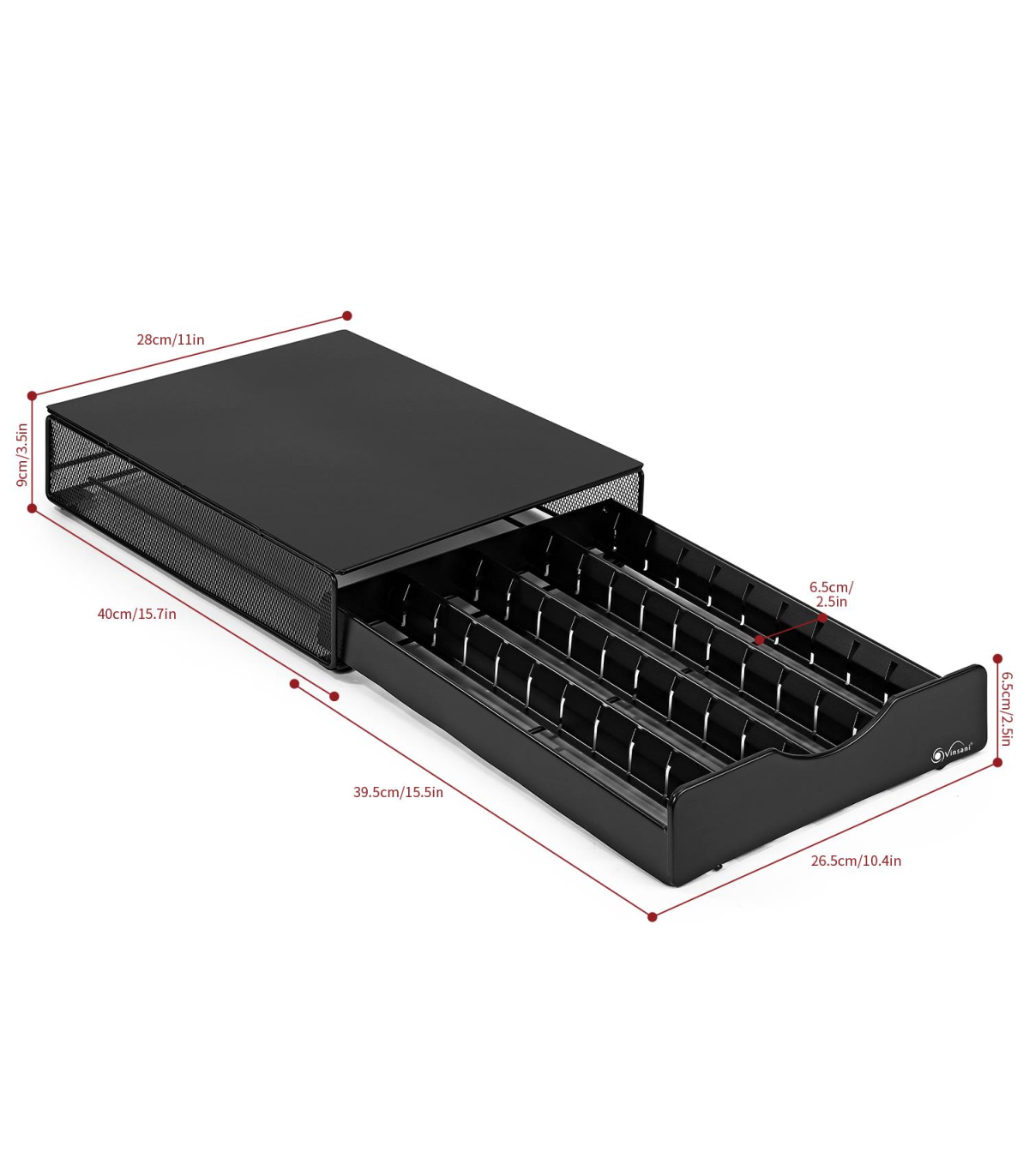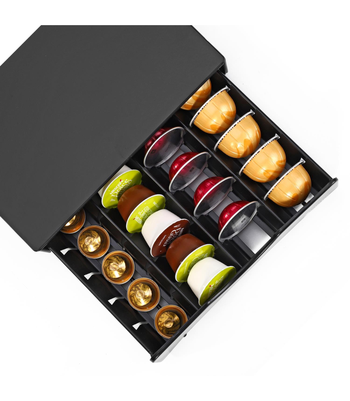 CAPSULES ORGANISER – This sliding coffee pod storage drawer is designed to hold up to 40 coffee capsules in fixed slots, keeping them neatly arranged and easily accessible. Compatible with Vertuoline, Dolce Gusto, K-Cup, and Nespresso pods. SPACE-SAVING DESIGN – The compact and sturdy design helps declutter your kitchen counter or workspace while providing a sleek and functional storage solution. Dimensions: L 40 x W 28 x H 9 cm Approx. EASY PUSH & PULL MECHANISM – Smooth gliding drawer action allows effortless access to your favourite coffee capsules with a simple pull, making coffee preparation quicker and easier. DURABLE BUILD WITH VENTILATION MESH – The breathable mesh design ensures proper airflow, keeping your coffee pods fresh while adding a modern touch to your setup. NON-SLIP FEET & PROTECTIVE SURFACE – Features a non-slip base for enhanced stability, preventing movement and protecting your countertops from scratches and spills.