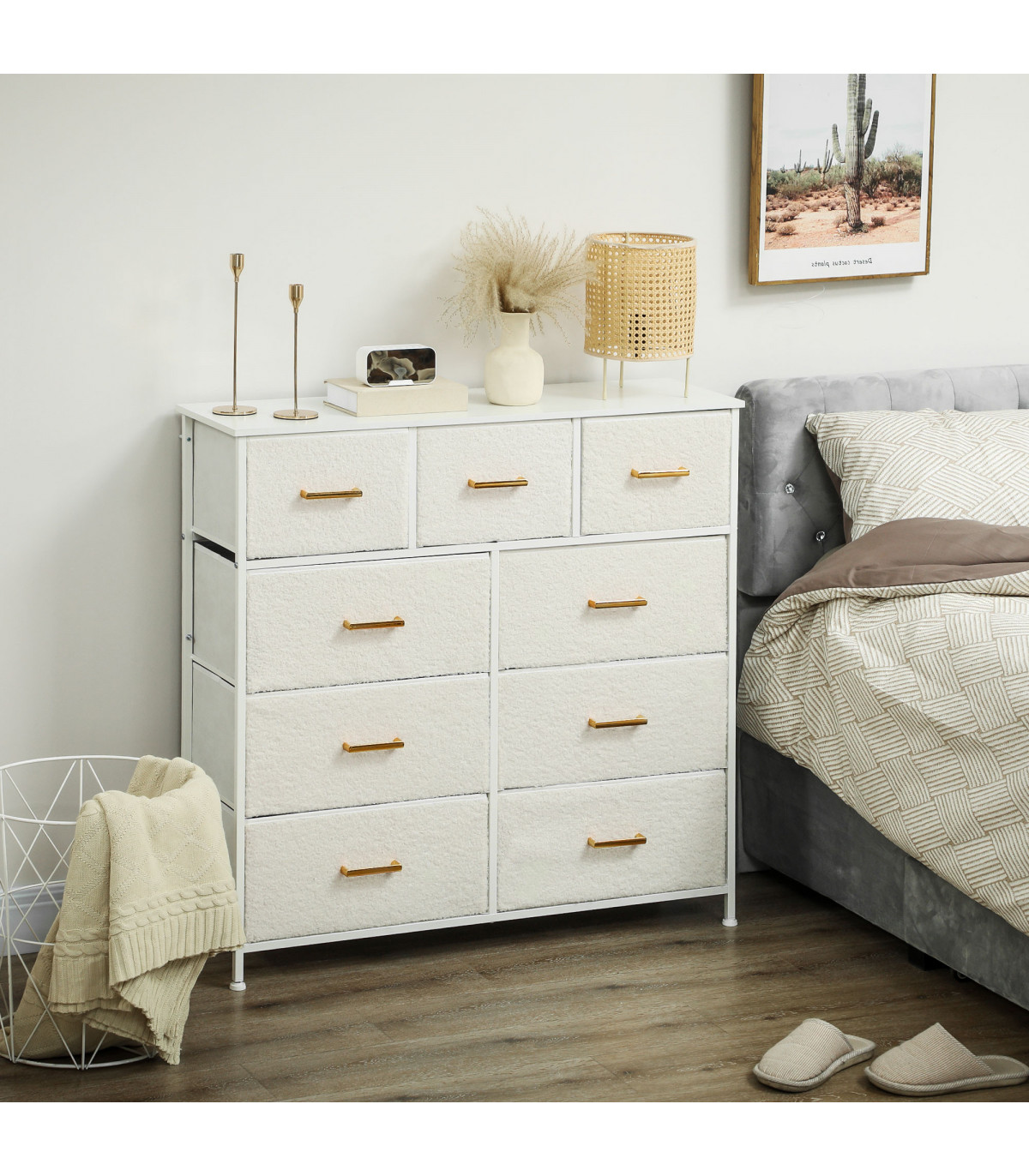 Introducing this stylish cream white storage unit, designed with boucle fabric drawers and elegant gold-tone handles, adding a chic touch to any interior. With nine spacious drawers, this unit offers versatile storage options for various items, making it ideal for living rooms, bedrooms, and entryways.