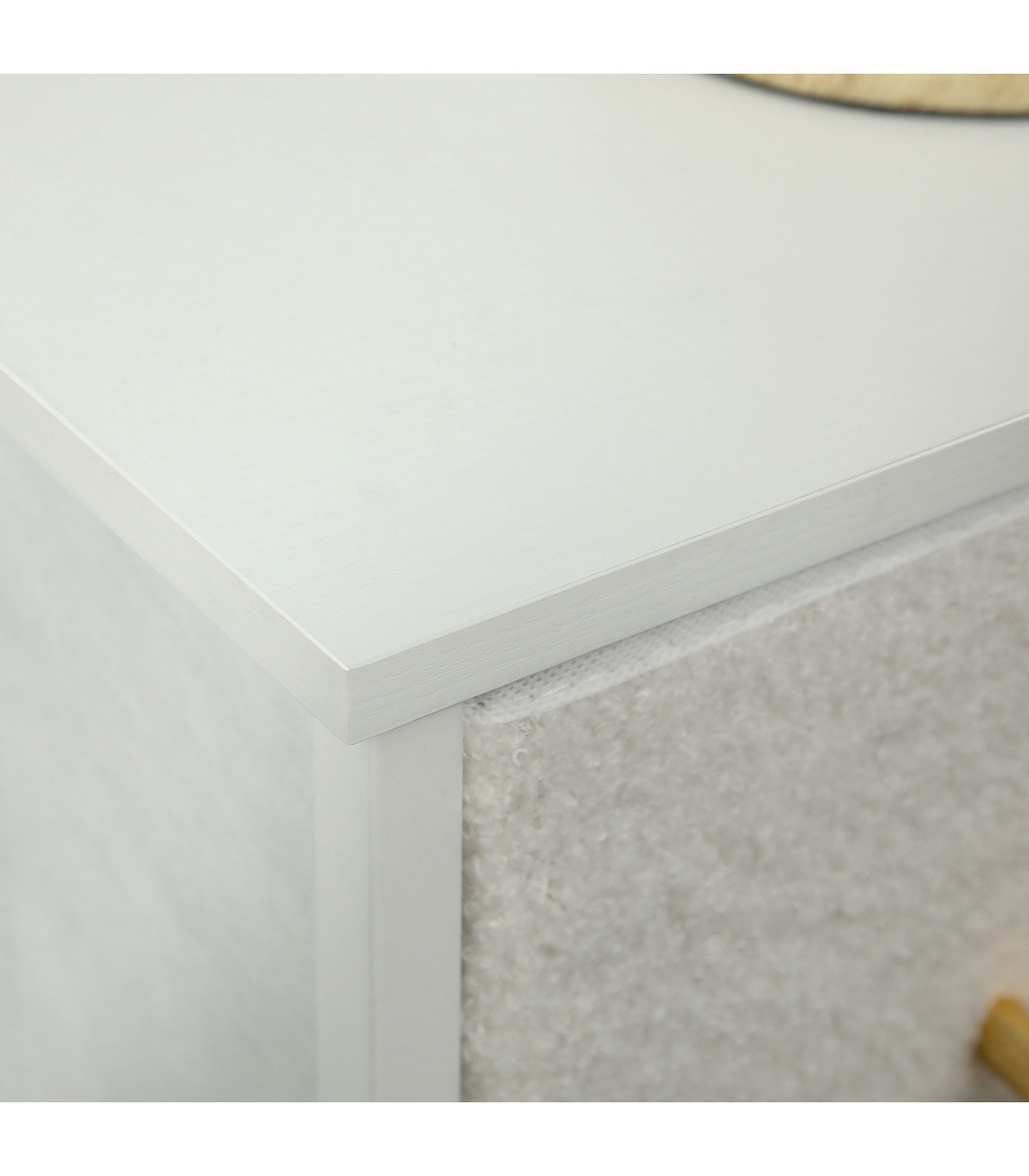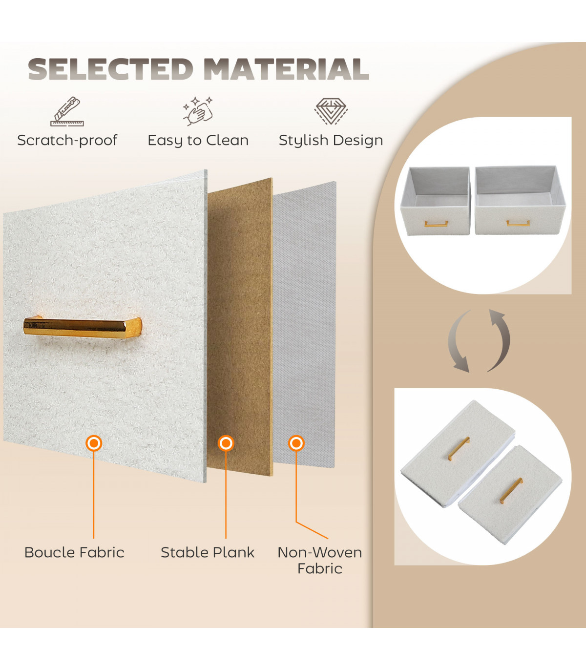 - Stylish Design: Boucle fabric drawers and gold-tone handles enhance aesthetics.