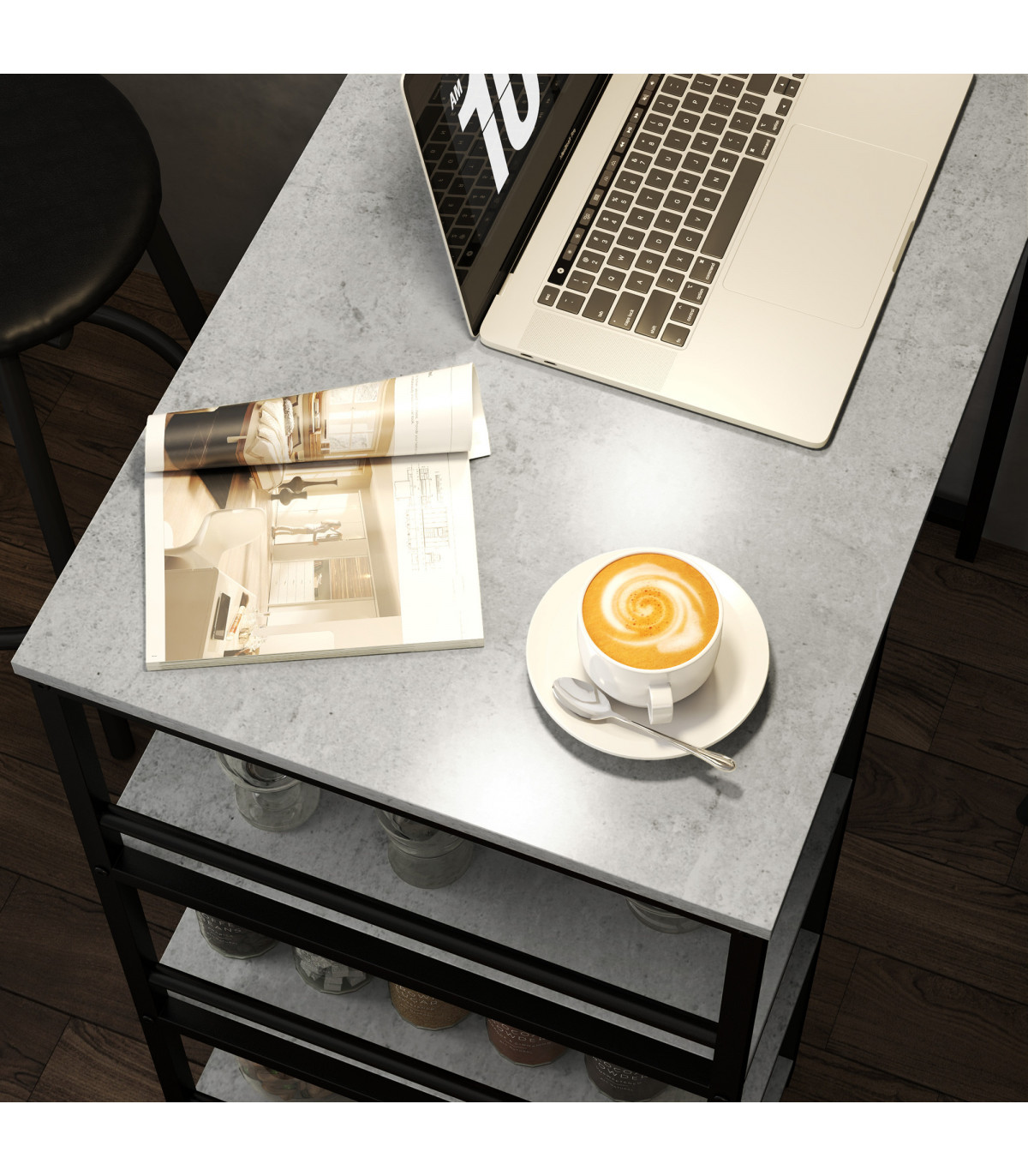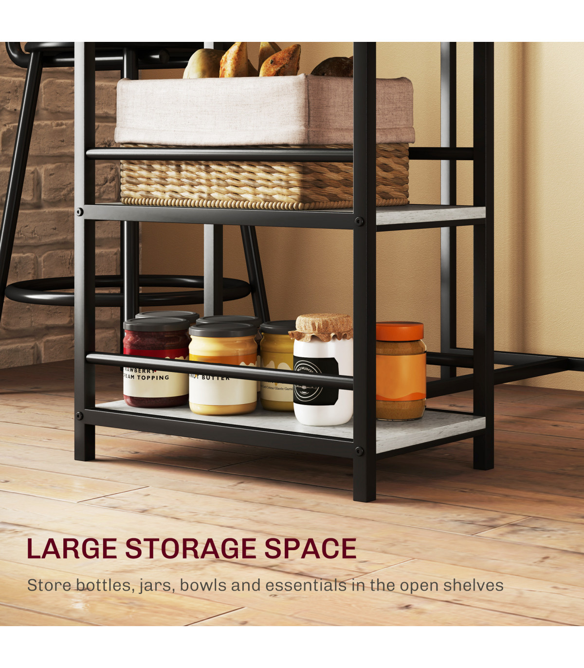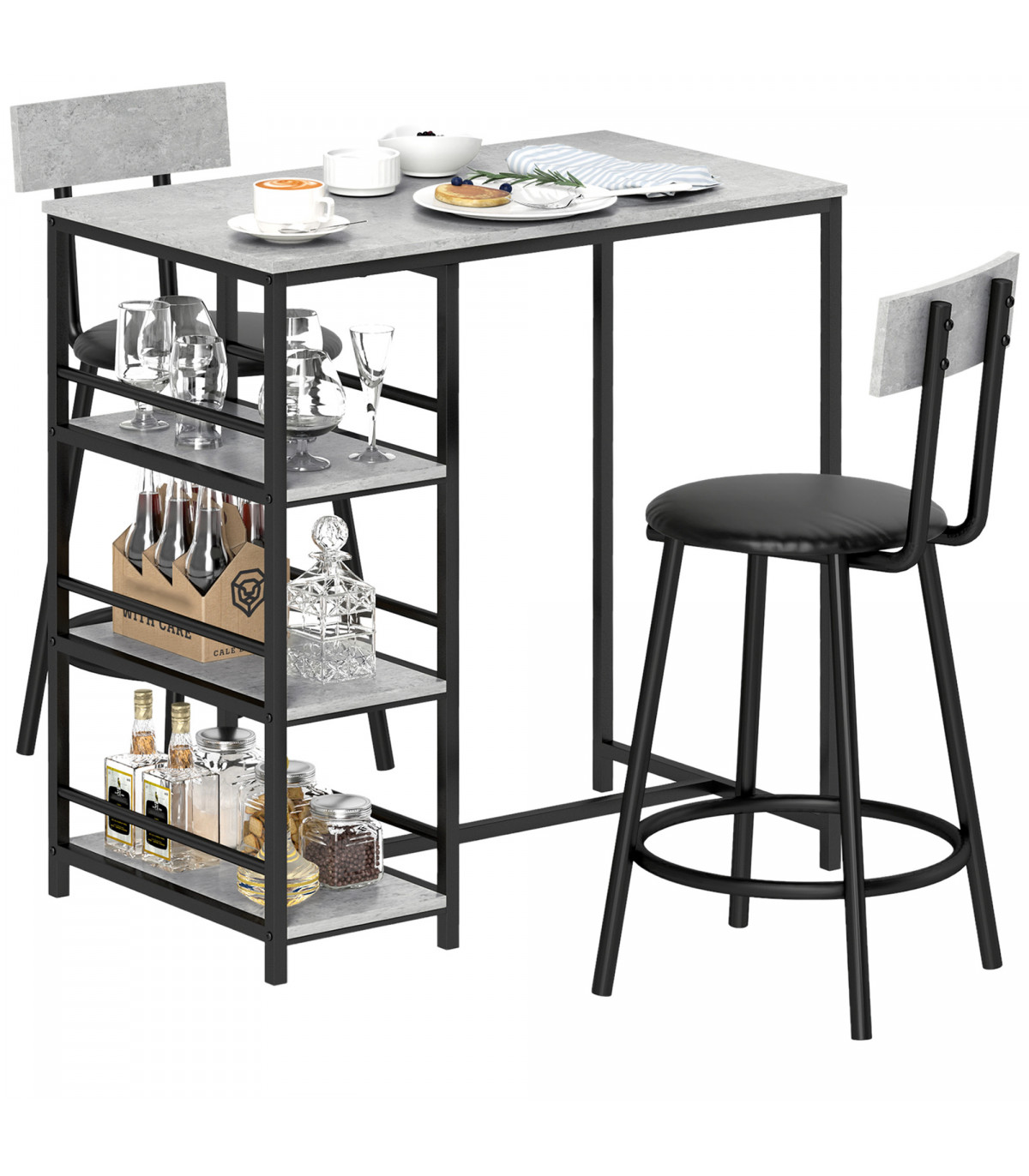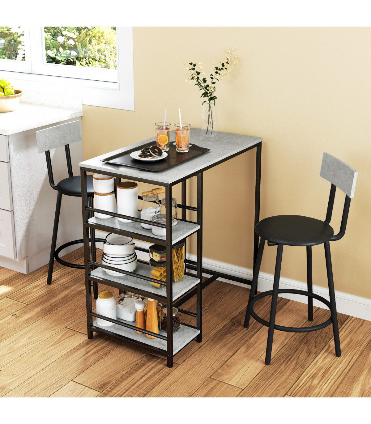 the table is fitted with three shelves to provide easy-reach space for tableware and more. When done, you can tuck the chairs into the table to save space.