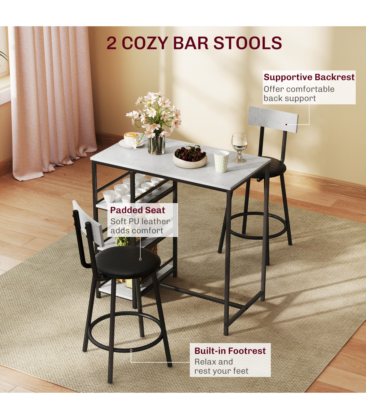 This elegant three-piece dining set comprises a stylish table and two tall chairs, designed to enhance your dining experience while optimising space. The chairs conveniently tuck under the table when not in use, making it perfect for compact areas.