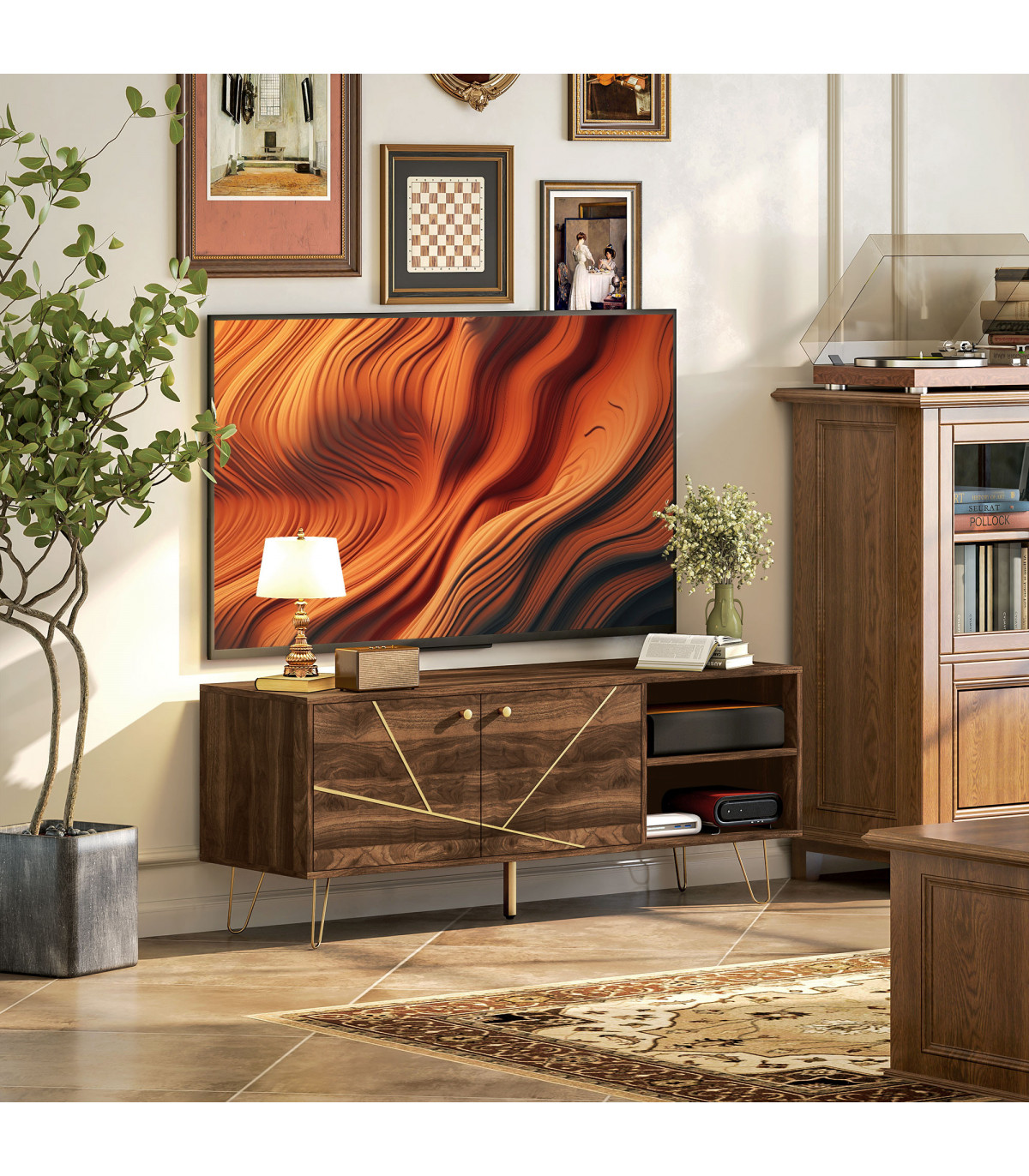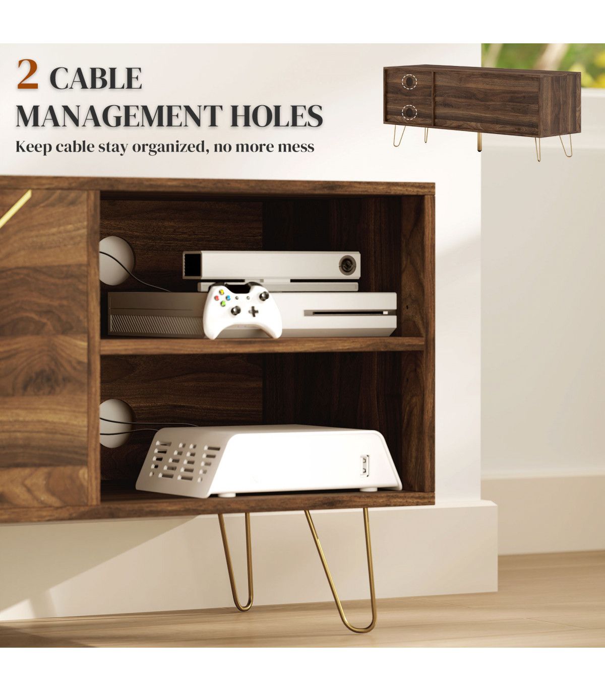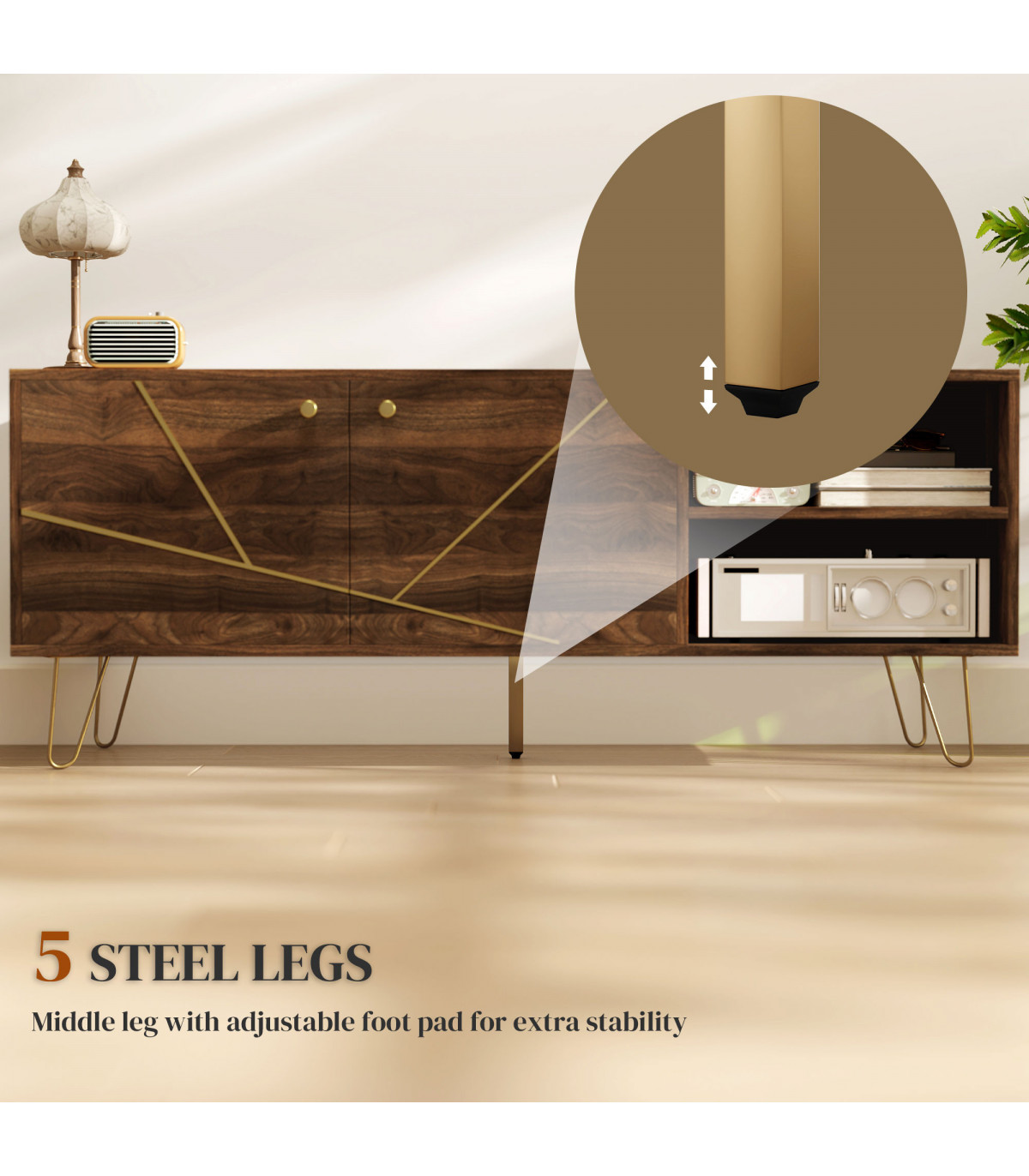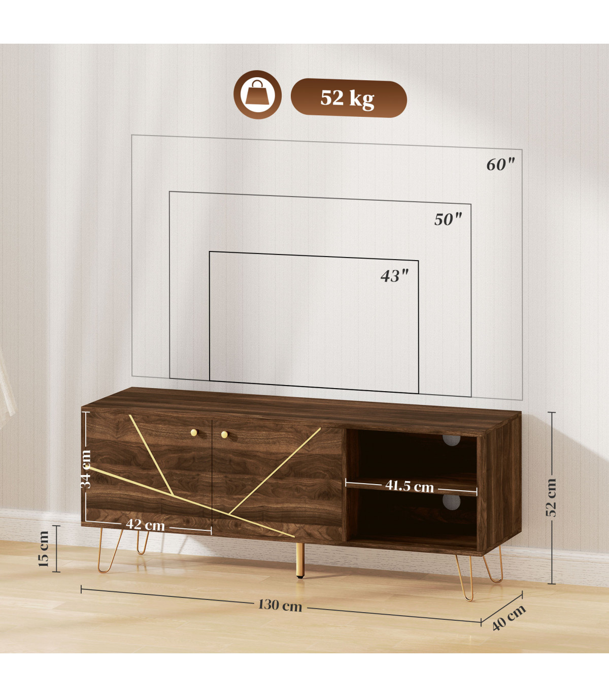 Transform your living space with this elegant TV stand designed to support televisions up to 60 inches. Featuring luxurious gold-tone accents and a modern wood effect, this piece seamlessly combines style and functionality.