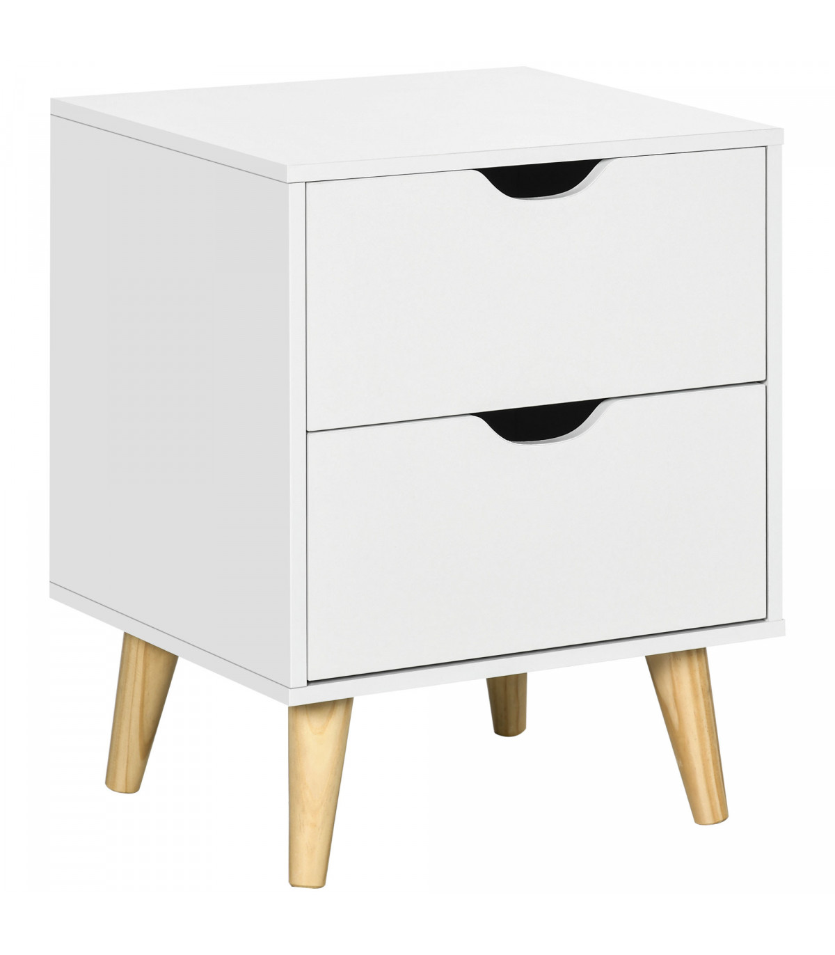 Introducing our elegant white nightstand, designed with cut-out handles and natural pine wood legs to add a sophisticated touch to your bedroom decor. This versatile piece serves beautifully as both a nightstand and an end table, providing functionality without sacrificing style.