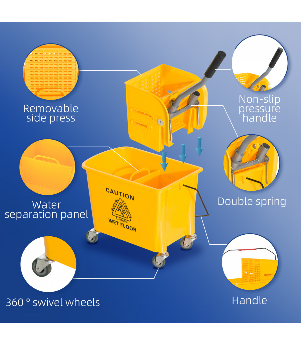 ● Handle to pick up bucket and carry ● Please note, mop is not included ● Assembly required