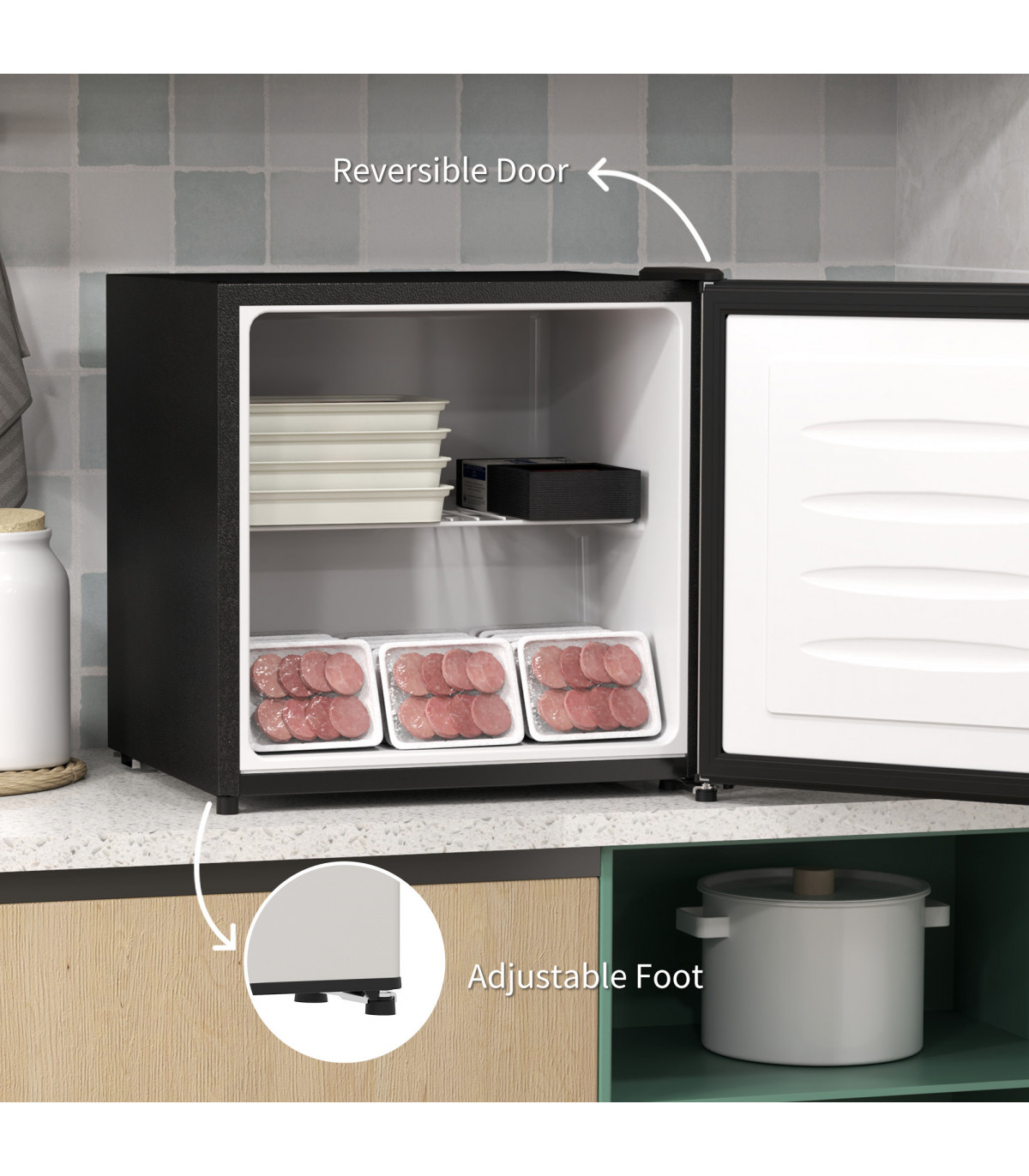 ● Reversible door, removable shelf and adjustable feet provide flexibility