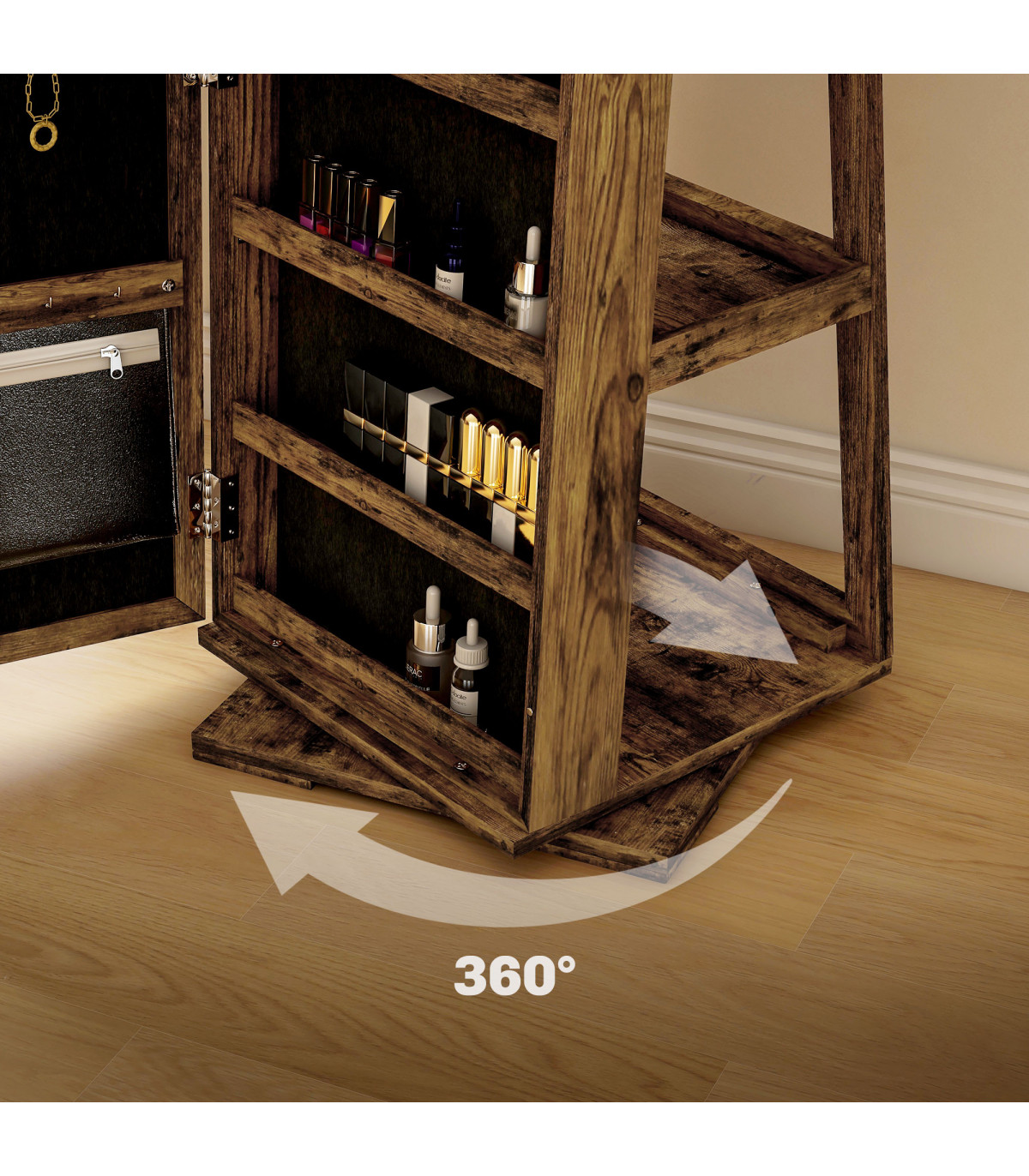 ● Inside features multiple earring slots, necklace and bracelet hooks, ring slots and shelves