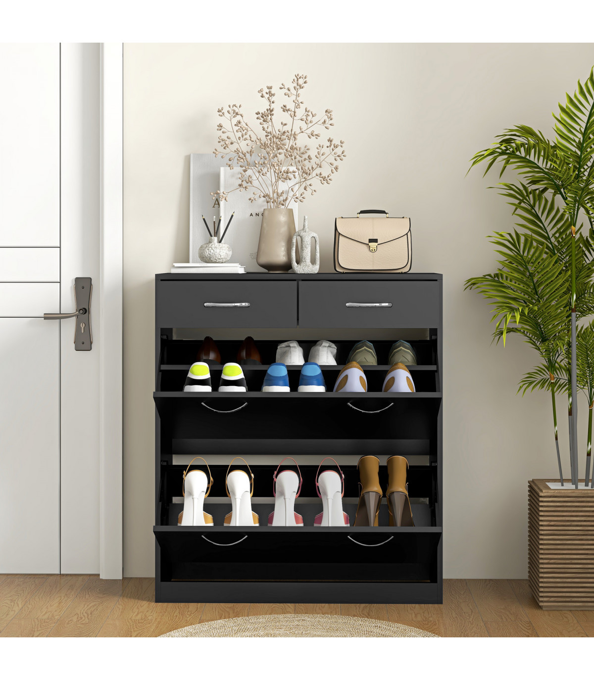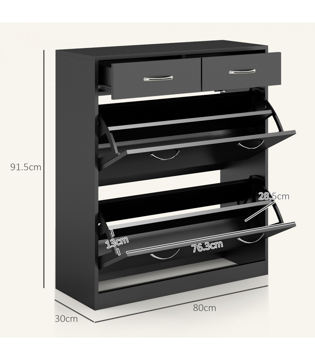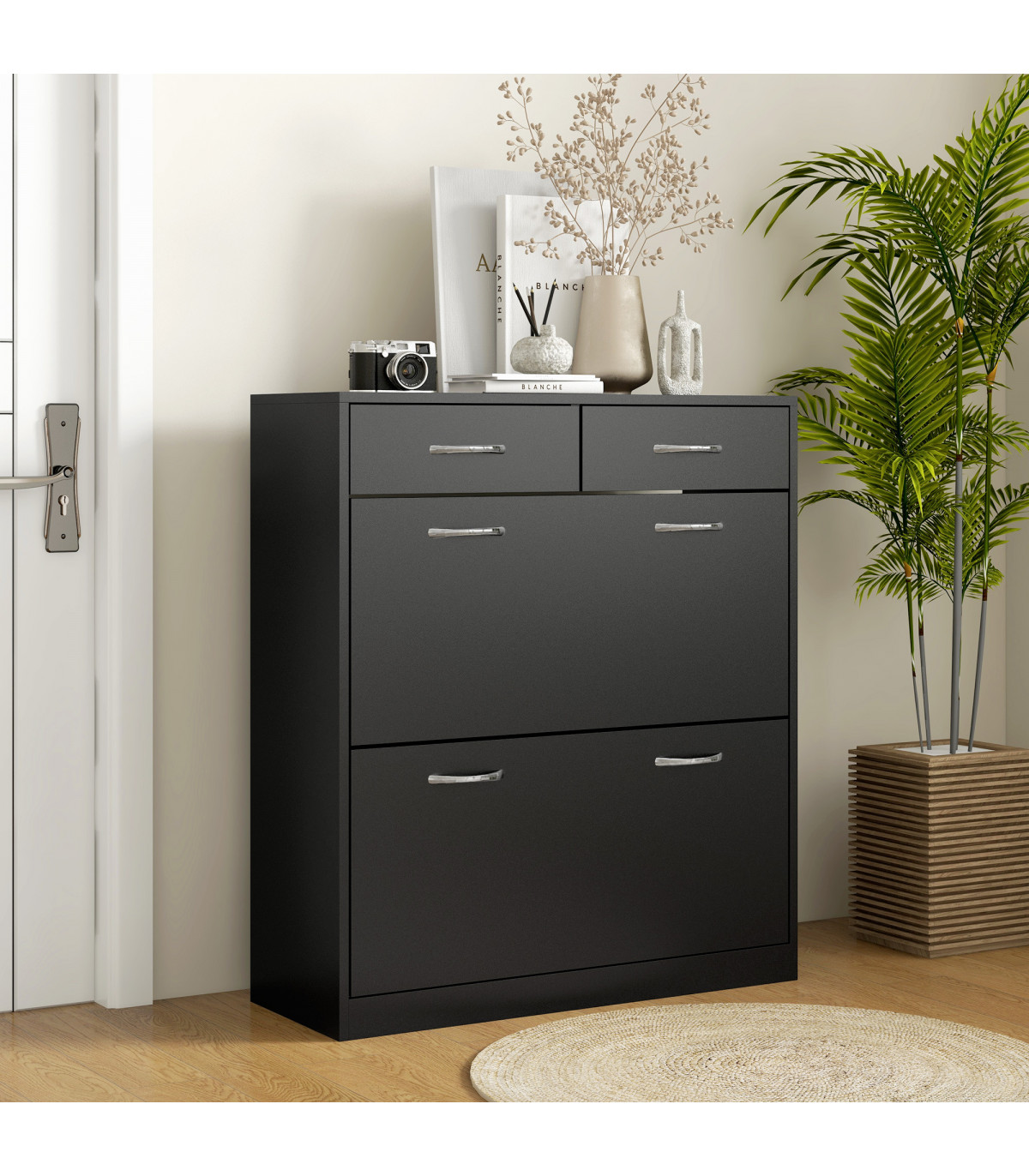 great for smaller spaces. Features two flip doors with a middle adjustable shelf: holds up to 12 shoe pairs, maximum UK size 9.5. Two top drawers and a flat top for extra display and holding room. Made from particle board, this is a solid piece for the everyday