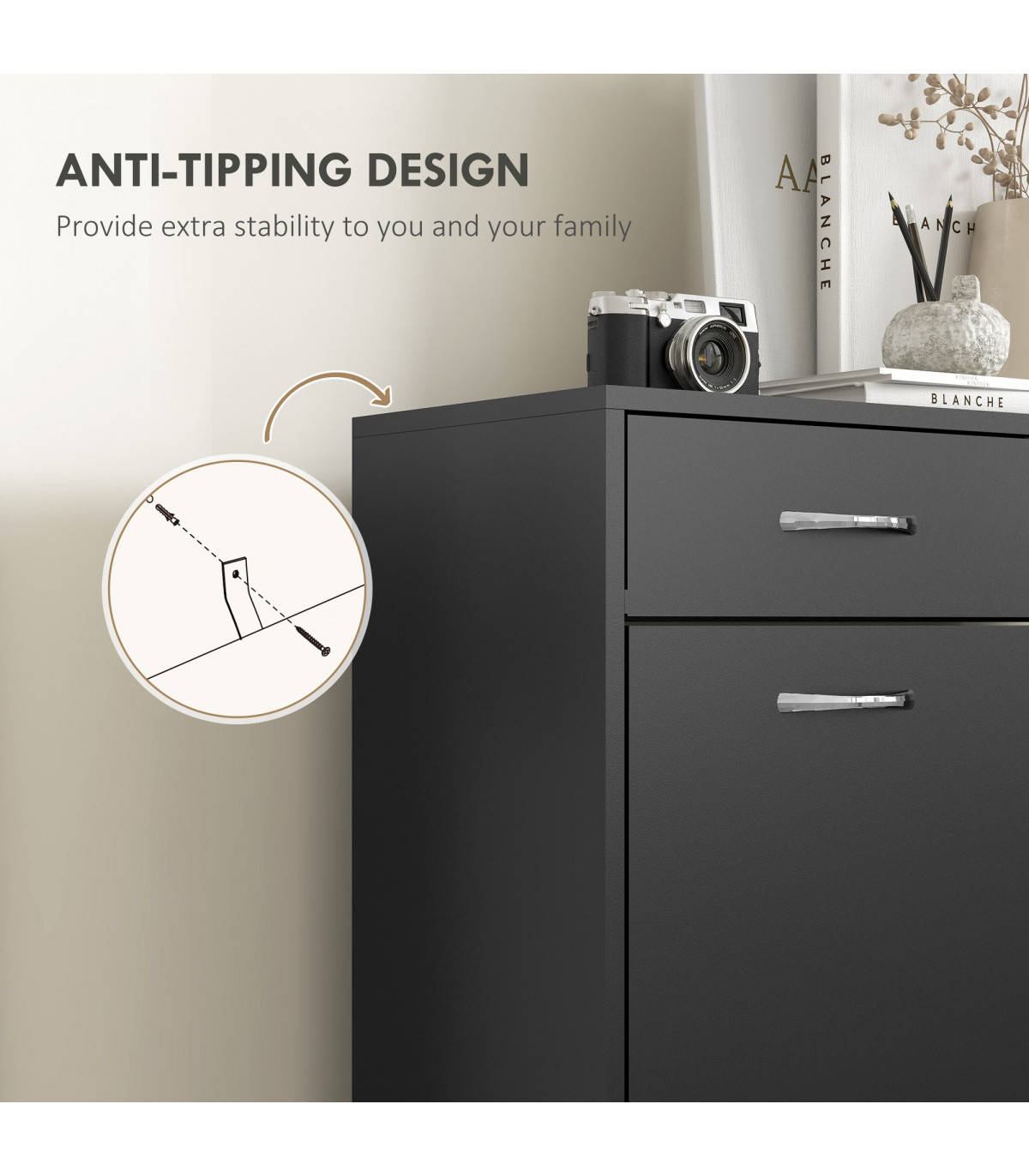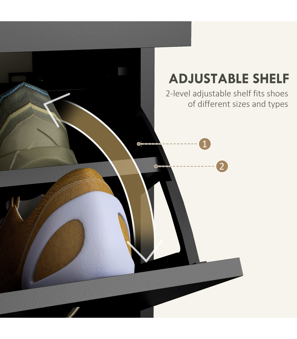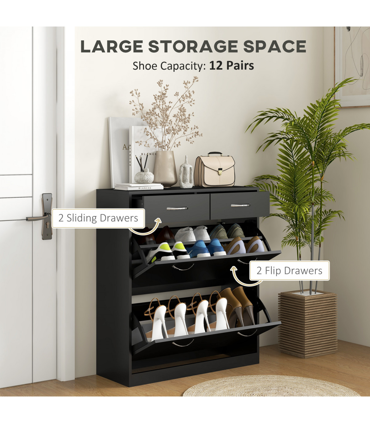 great for smaller spaces. Features two flip doors with a middle adjustable shelf: holds up to 12 shoe pairs, maximum UK size 9.5. Two top drawers and a flat top for extra display and holding room. Made from particle board, this is a solid piece for the everyday