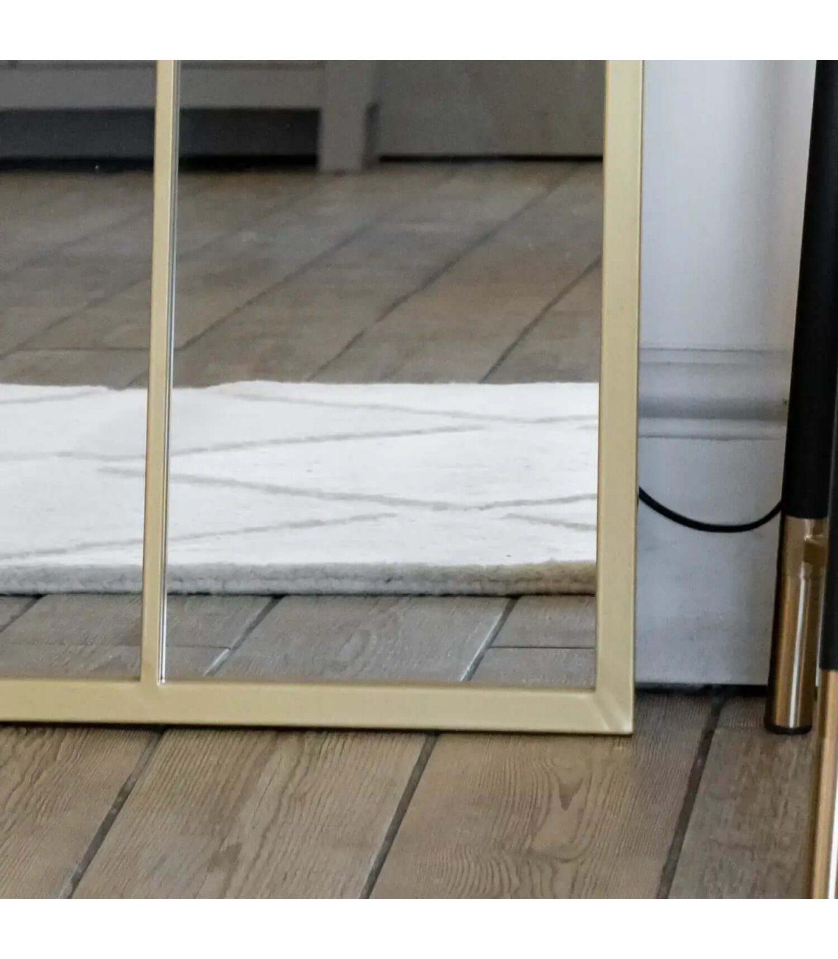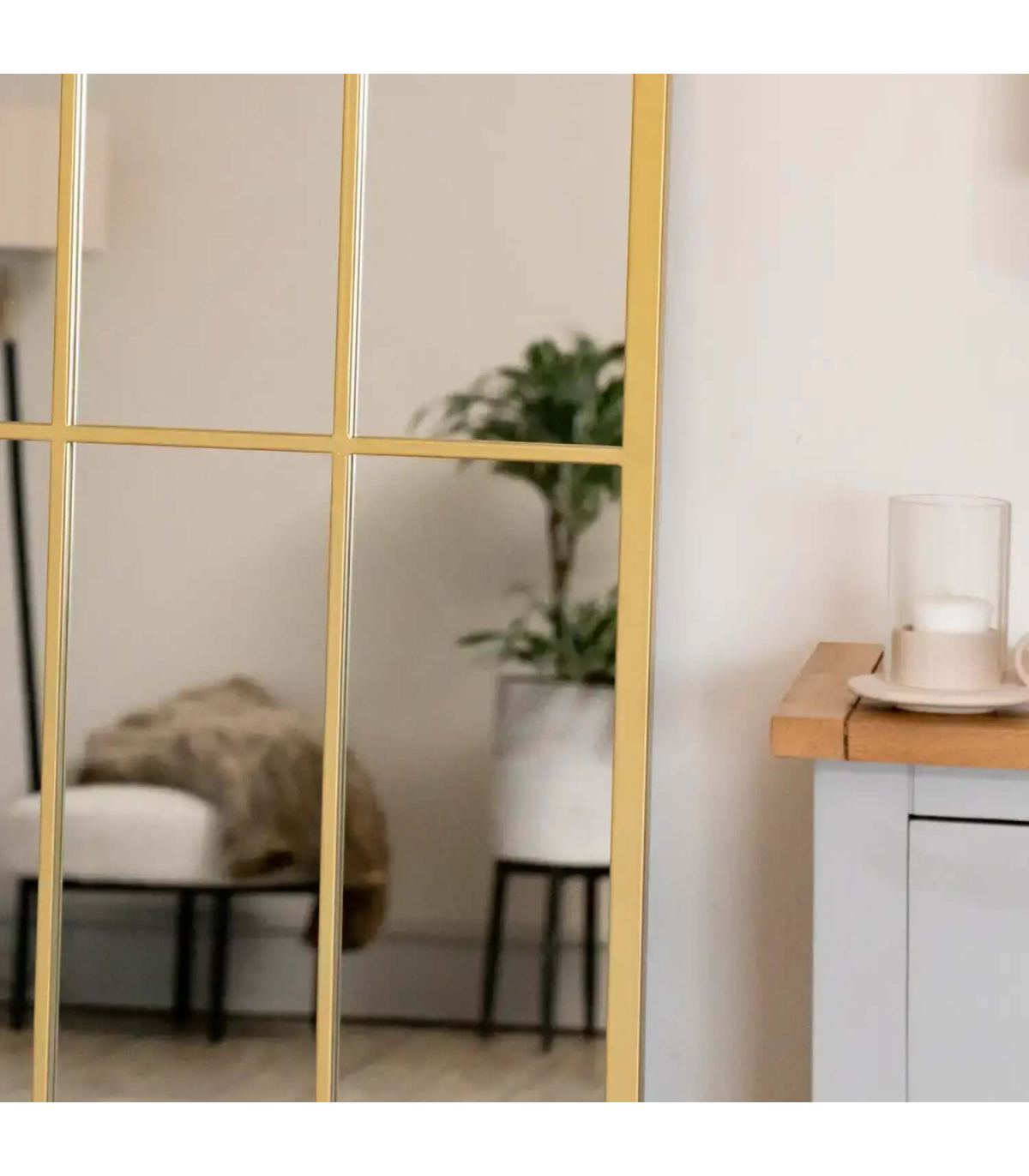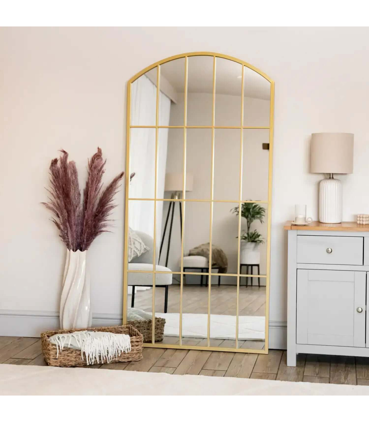 The Tomi mirror range is a fantastic addition to any home decor with a distinctive and timeless curved arched window pane design that enhances the ambiance with subtle gold metal arched accents. This refined design not only amplifies natural light and creates a spacious feel but also incorporates exquisite details reminiscent of a lattice window, underscoring the quality and sophistication of the piece. All our frames are hand welded to ensure barely visible joints, achieving a high-end finish that reflects meticulous craftsmanship, similar to the elegance of a length gold metal finish.