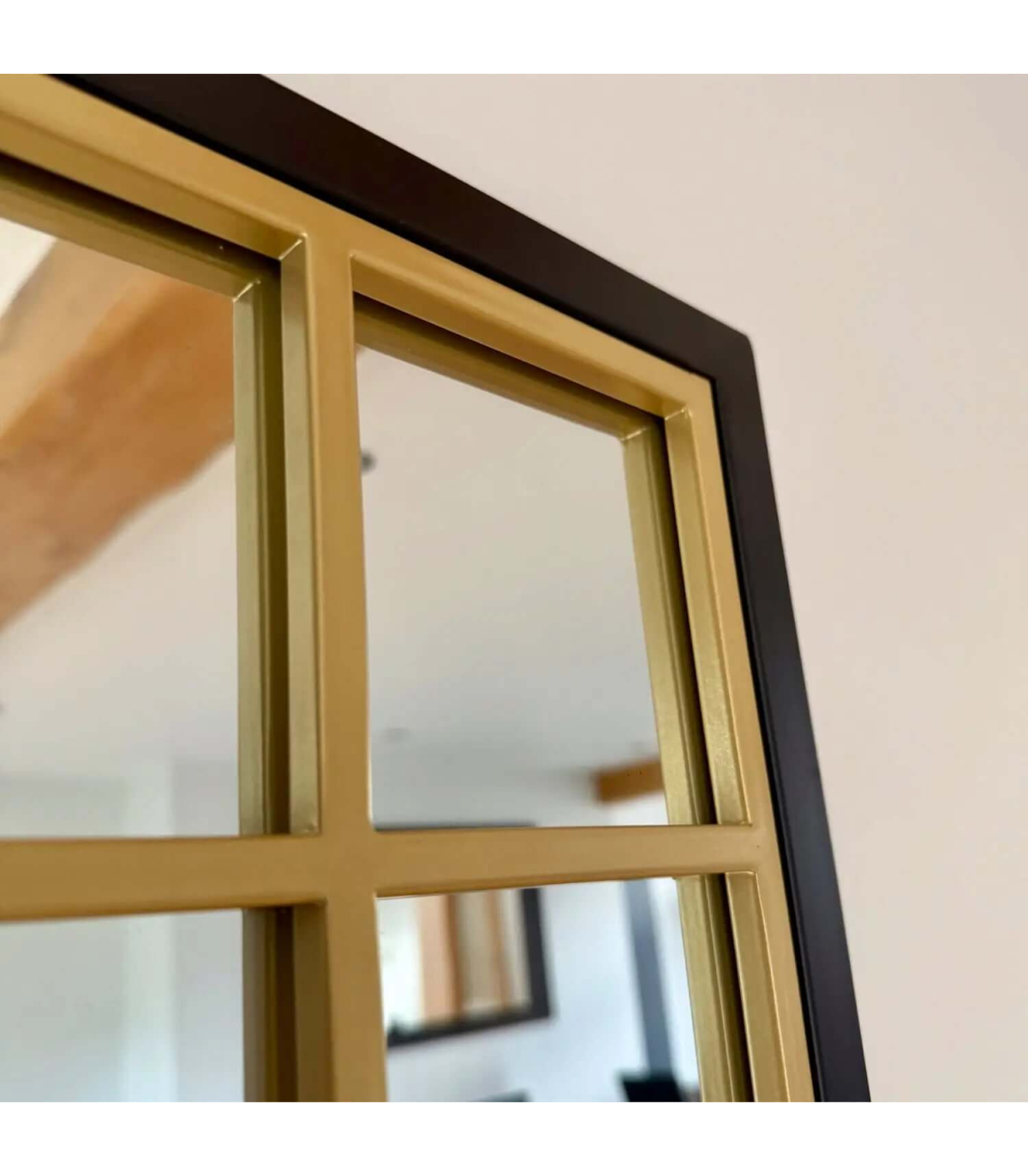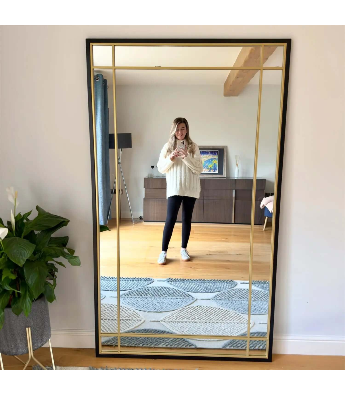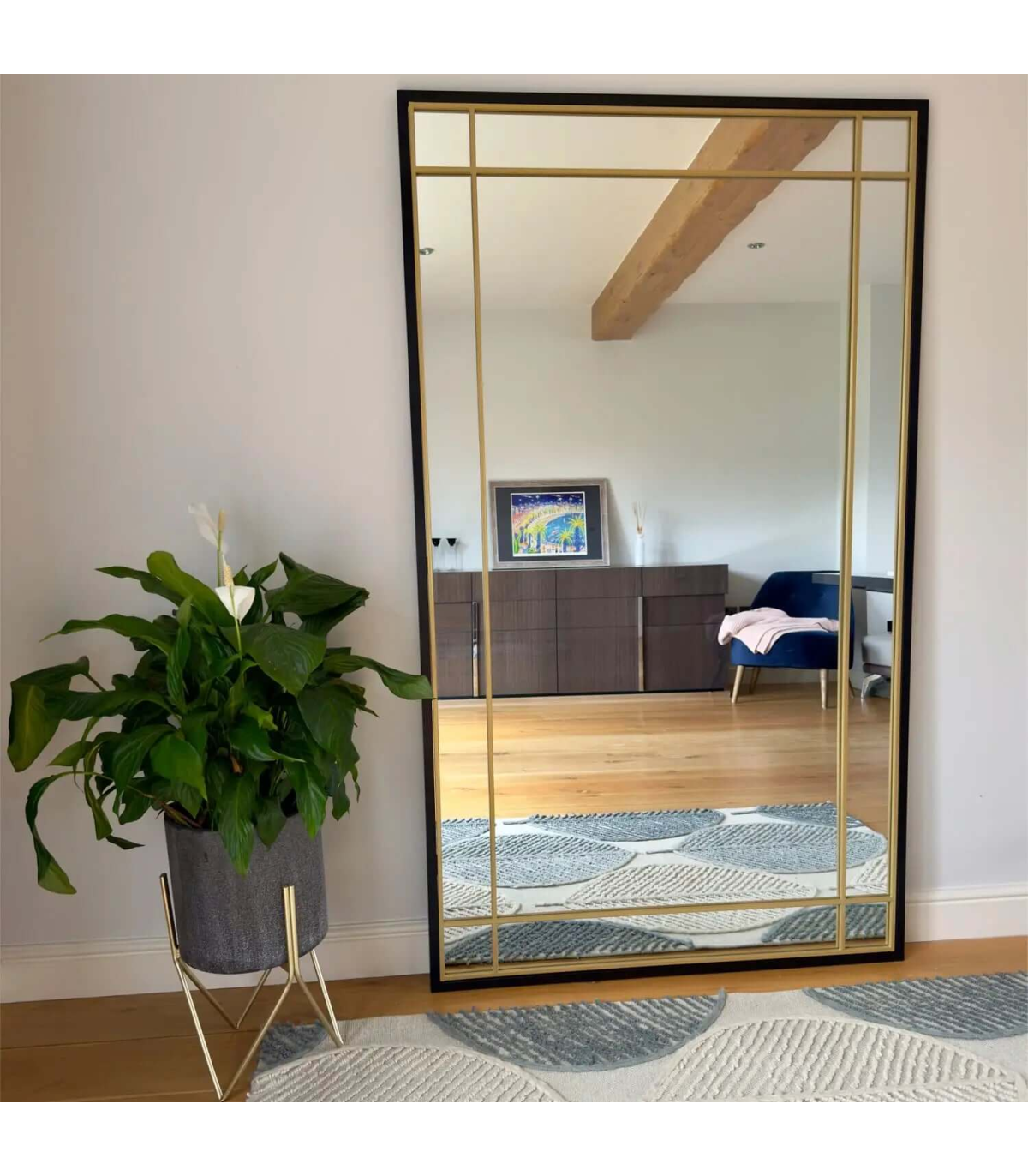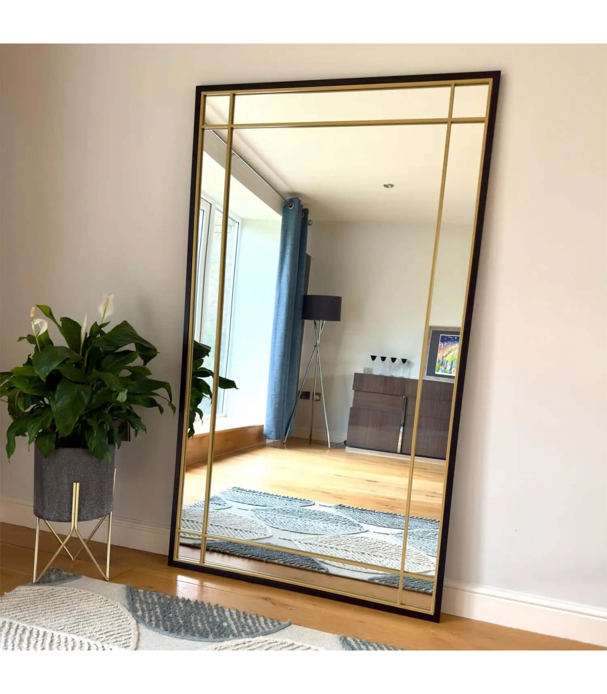 Oversized Leaner Mirror with a Bold Black & Gold Windowpane Design