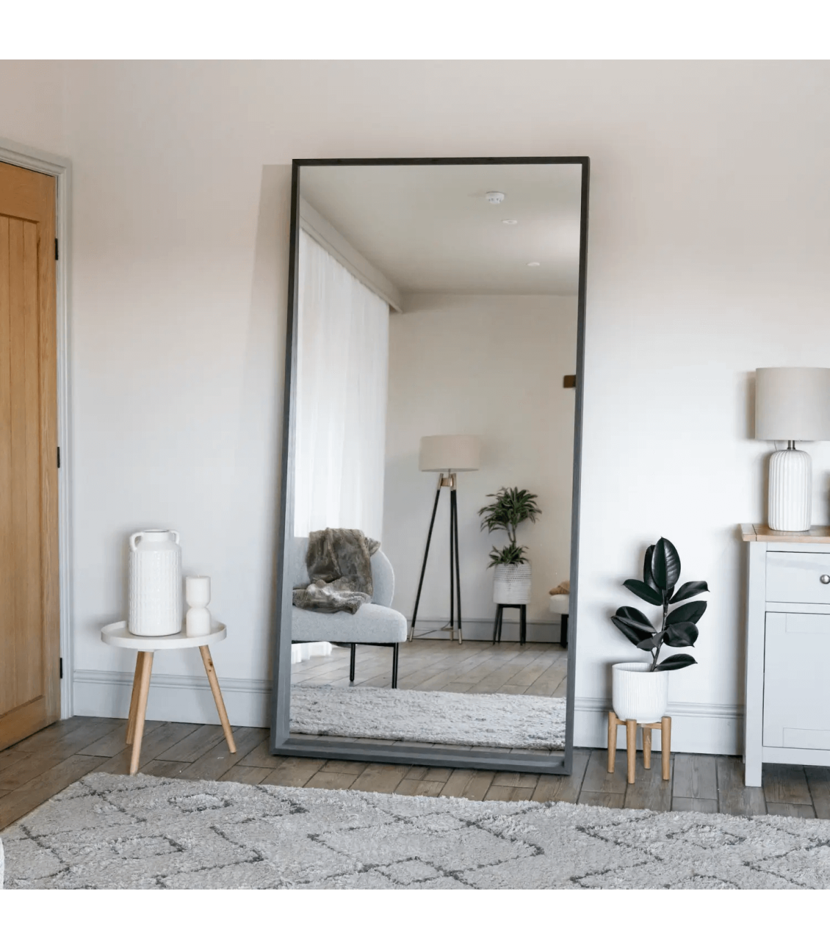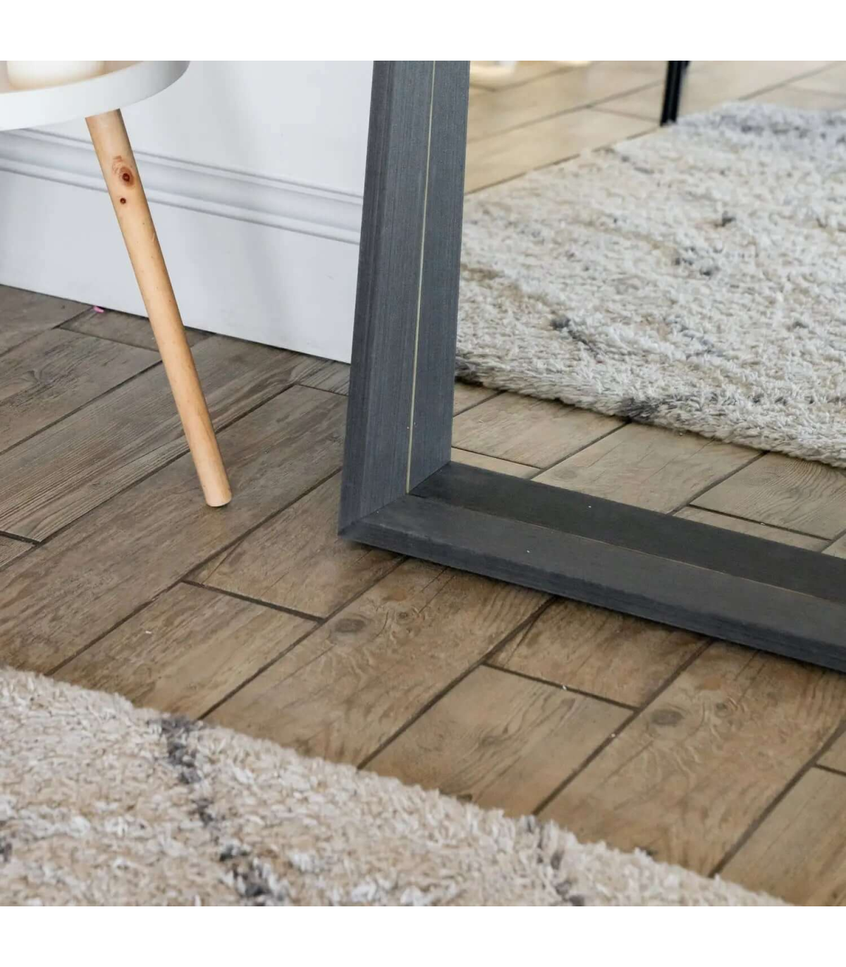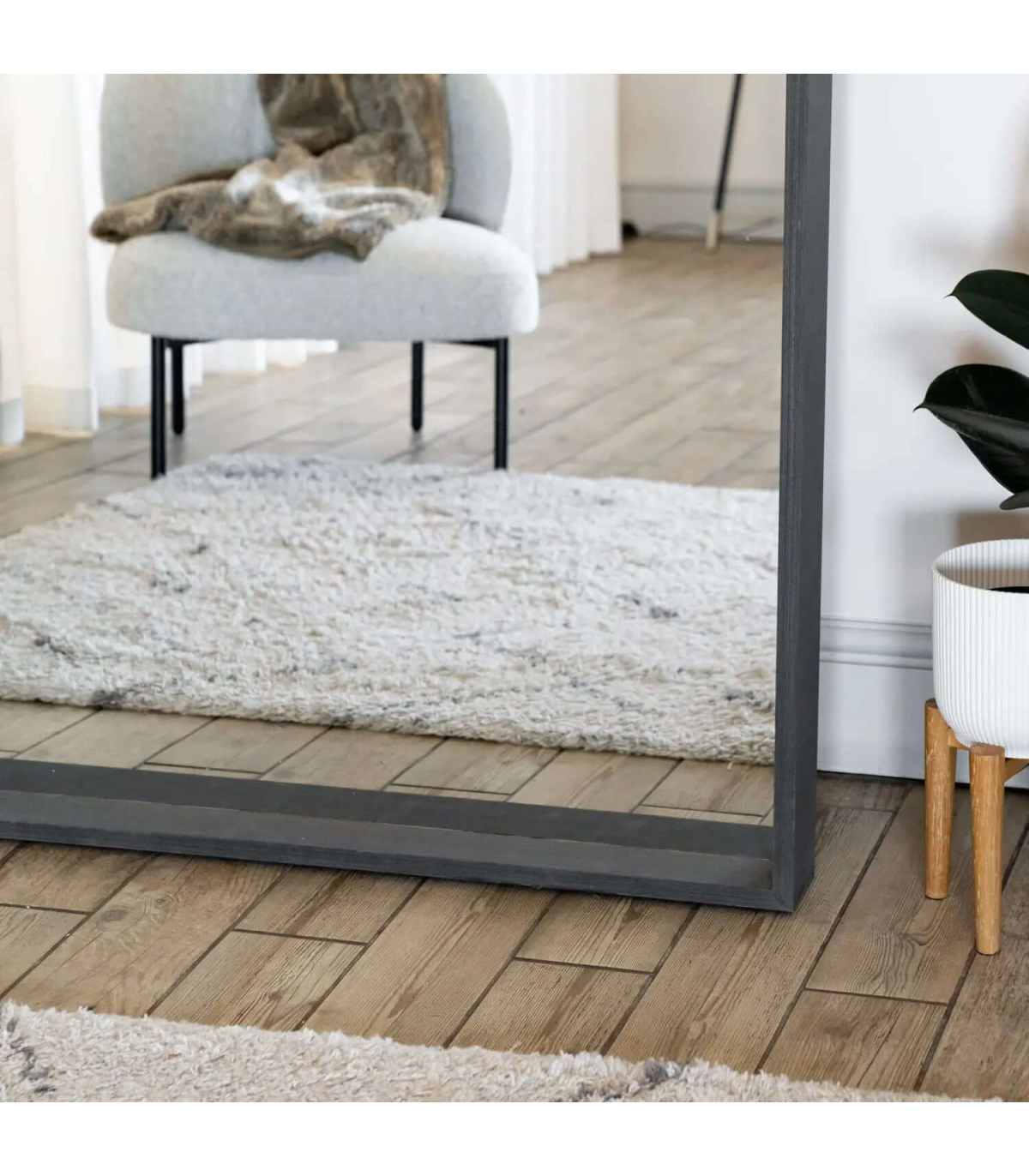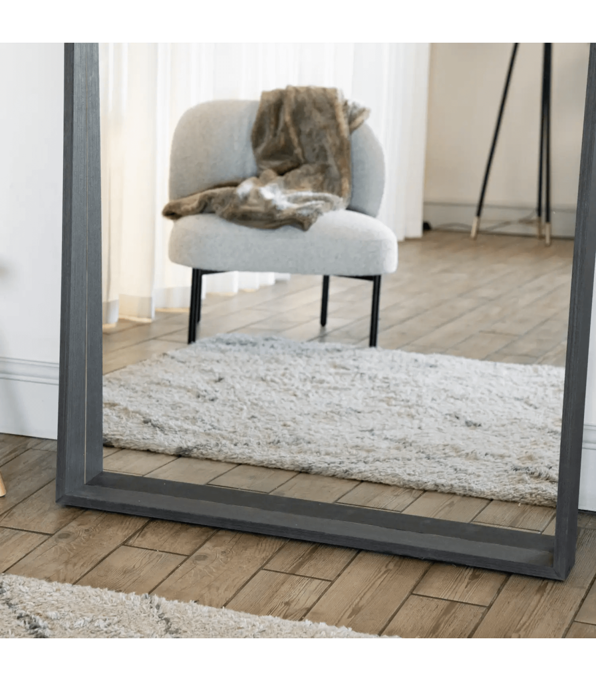 Designed with a custom angled frame, the mirror glass is set back at the bottom and forward at the top, ensuring it stands upright when leaned. This innovative design offers the stylish look of a leaner mirror with the practical benefits of a full, true-to-life reflection.