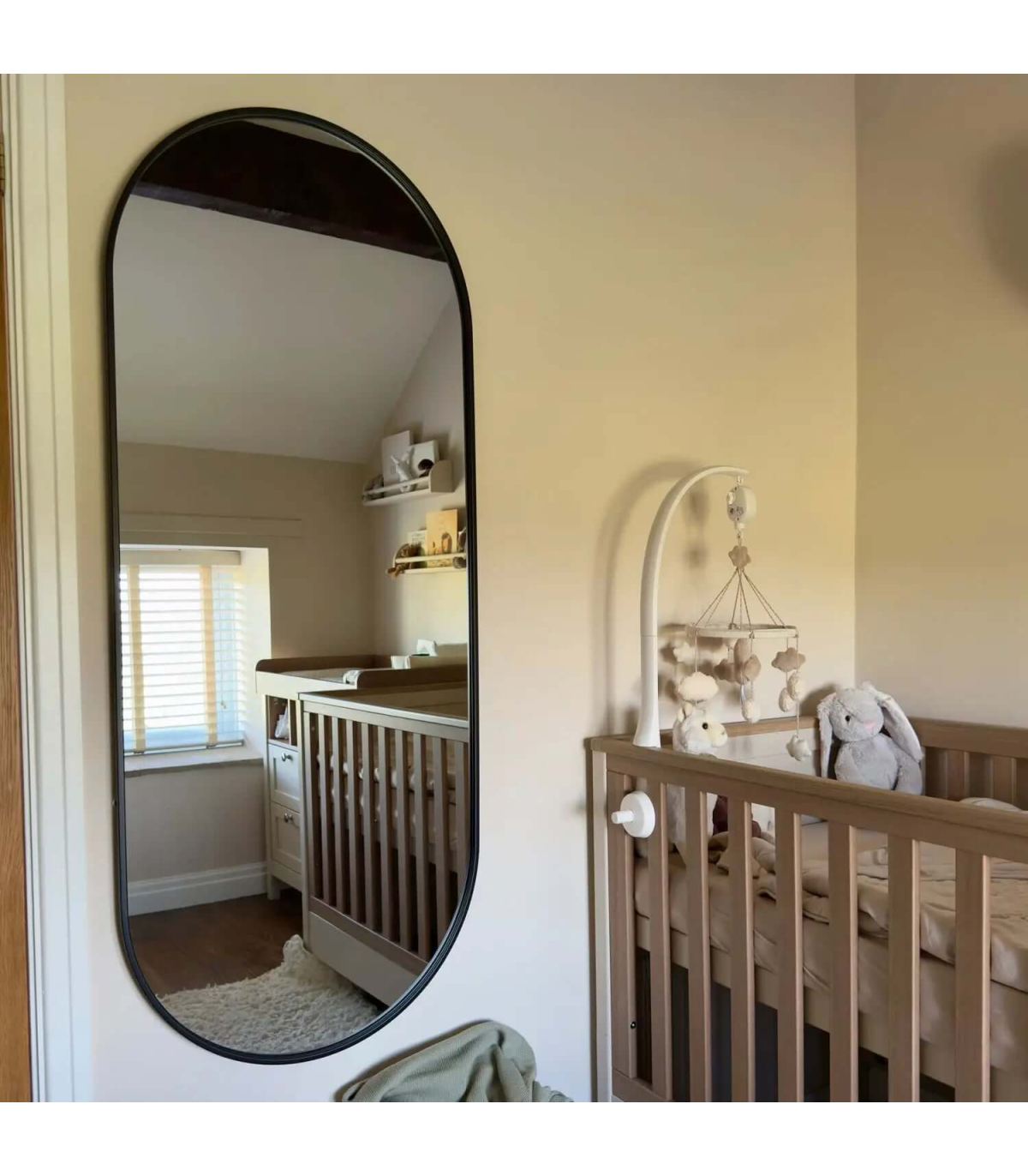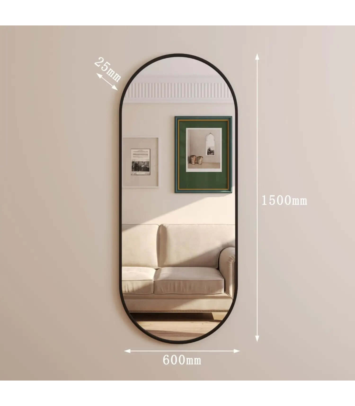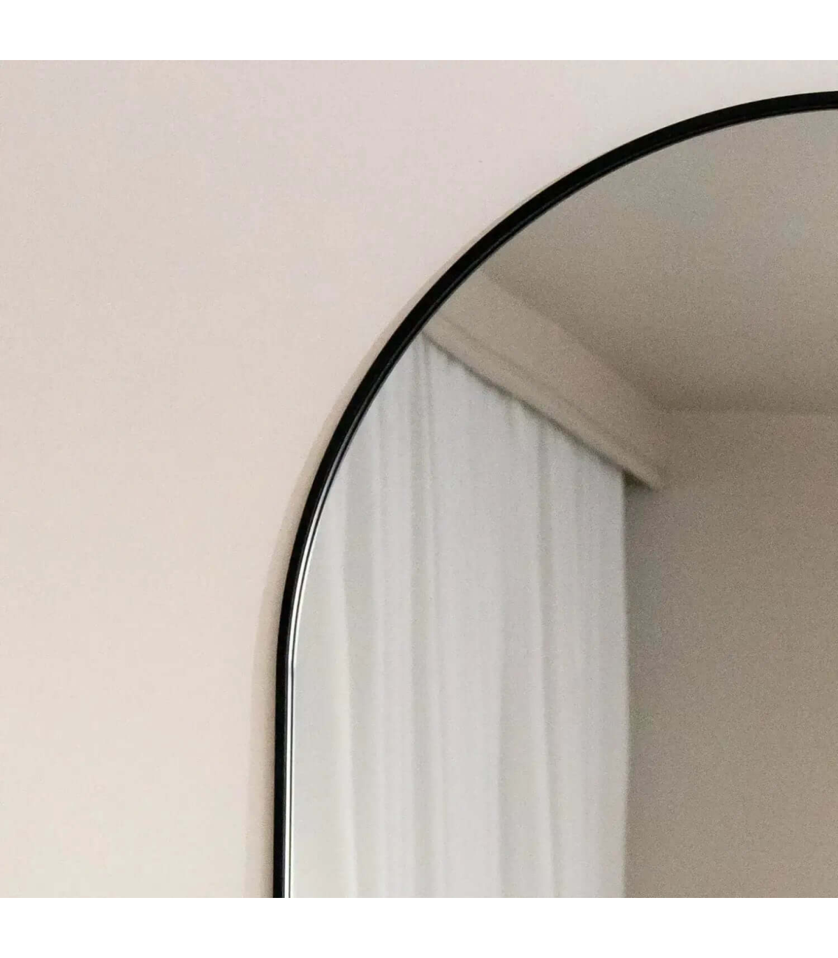 Elevate your living space with this modern black oval mirror from the Emi range. The high-definition 4mm glass and expertly crafted, barely visible welds combine to create a sleek, contemporary design. Its elongated form enhances room brightness while seamlessly integrating with any decor style, offering not just a mirror but a refined focal point for your interior with an almost imperceptible frame.