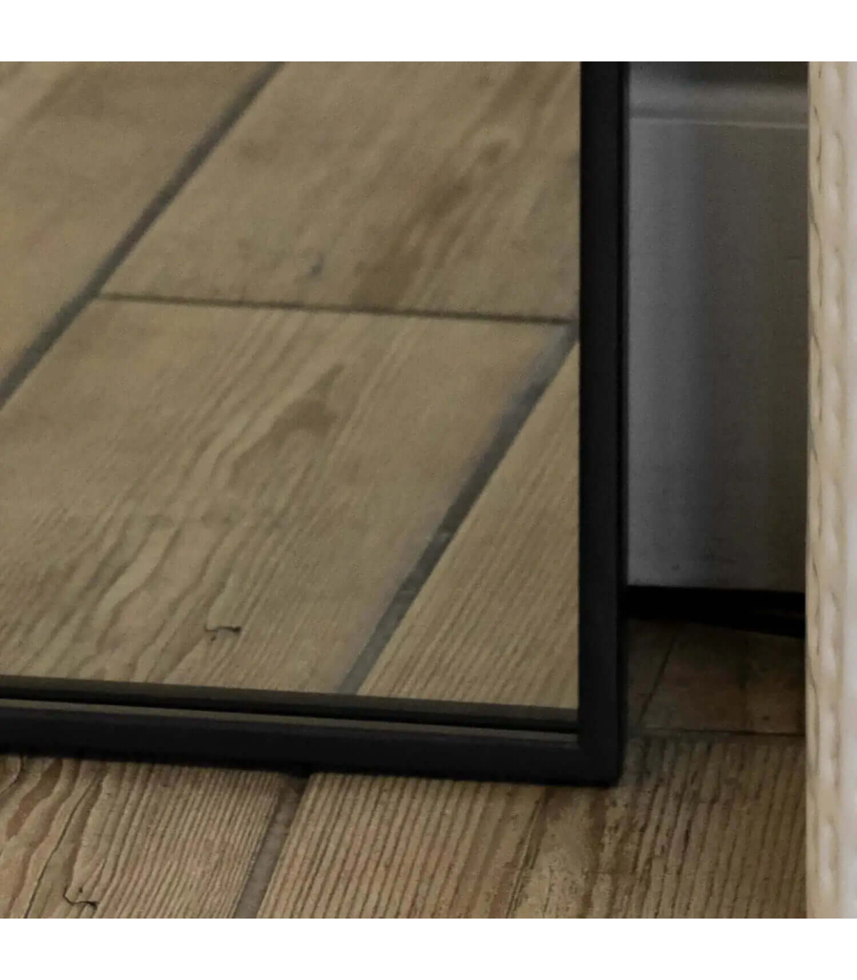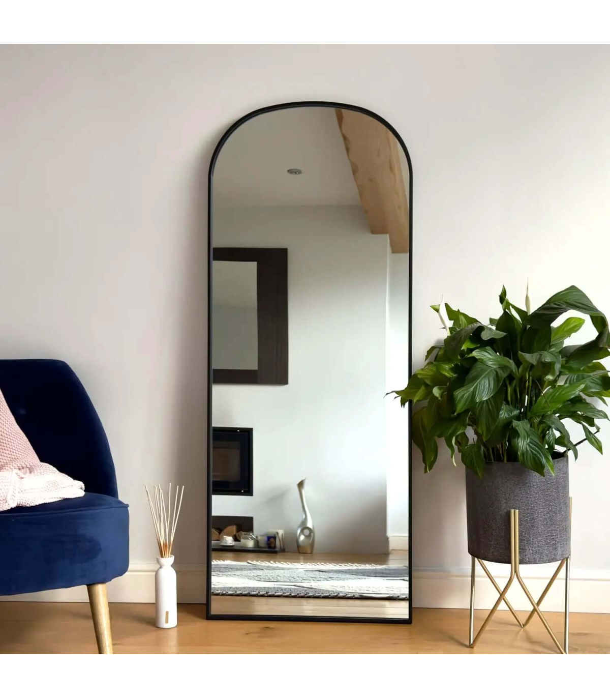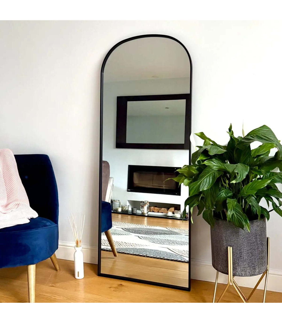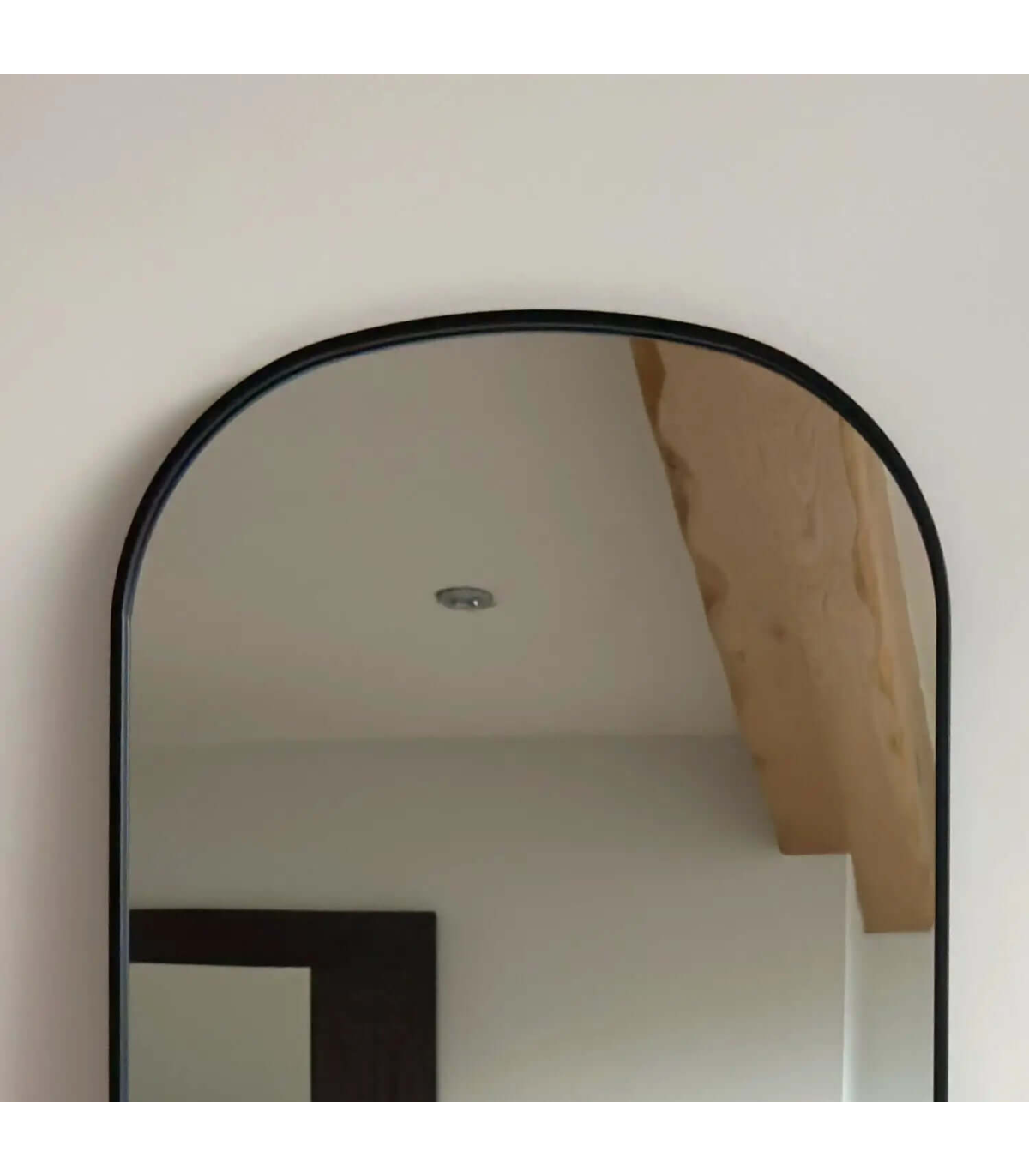 The mirror makes a distinguished statement by adding light and depth to any room. Expert welding techniques produce a virtually seamless finish, and premium components such as the 4mm HD glass with explosion-proof backing contribute to a long-lasting and safe product. The incorporation of a gentle arch, along with the robust black metal, reinforces its status as an exceptional design piece.