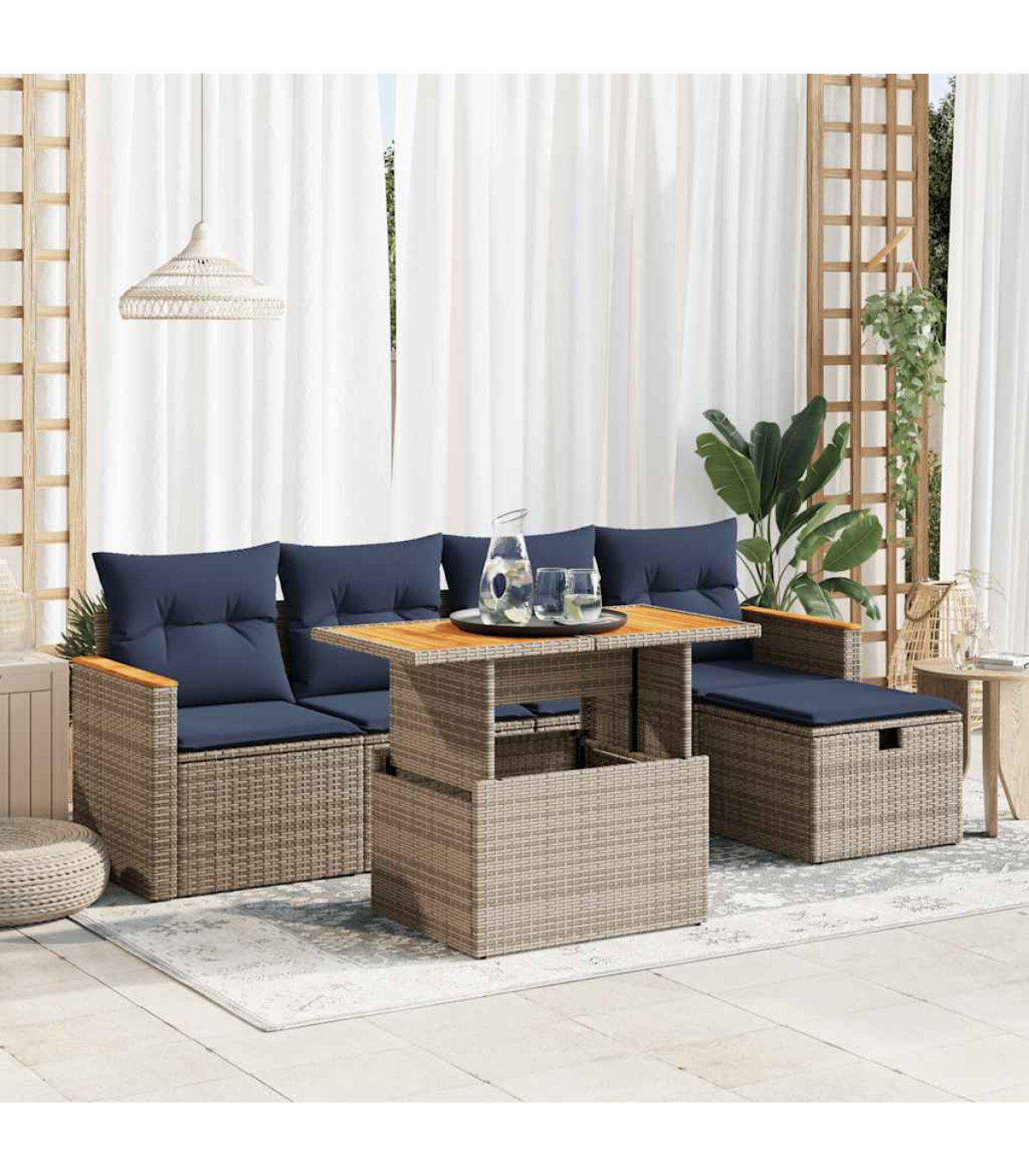 This garden sofa set is the perfect addition to your backyard, terrace, or patio, providing a comfortable and inviting space for chatting with family and friends or simply relaxing and enjoying the outdoors.Durable material: PE rattan, also known as poly rattan, is a strong, low-maintenance synthetic material that looks like natural rattan. It's lightweight, easy to clean, and commonly used for outdoor furniture due to its durability and weather-resistant properties.Storage function with water-resistant bag: Each garden seat features storage space under the seat, complete with a water-resistant bag for storing cushions, toys, and other items. The inner bags have a top cover and can be securely fastened to the seats with hook-and-loop fasteners for added stability.Removable and washable cover: These seat cushions feature removable covers for easy washing and maintenance.Modular design: This outdoor furniture set has a modular design, making it completely flexible and easy to move around, so you can create a customised outdoor furniture arrangement.Good to know:To make sure your outdoor furniture stays beautiful, we recommend protecting it with a waterproof cover.