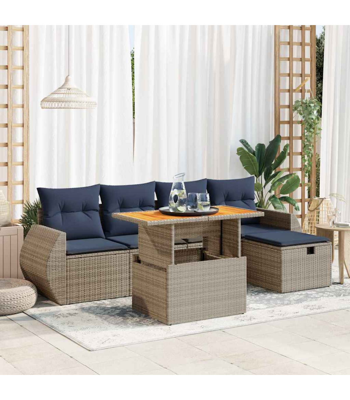 This garden sofa set is the perfect addition to your backyard, terrace, or patio, providing a comfortable and inviting space for chatting with family and friends or simply relaxing and enjoying the outdoors.Durable material: PE rattan, also known as poly rattan, is a strong, low-maintenance synthetic material that looks like natural rattan. It's lightweight, easy to clean, and commonly used for outdoor furniture due to its durability and weather-resistant properties.Storage function with water-resistant bag: Each garden seat features storage space under the seat, complete with a water-resistant bag for storing cushions, toys, and other items. The inner bags have a top cover and can be securely fastened to the seats with hook-and-loop fasteners for added stability.Removable and washable cover: These seat cushions feature removable covers for easy washing and maintenance.Modular design: This outdoor furniture set has a modular design, making it completely flexible and easy to move around, so you can create a customised outdoor furniture arrangement.Good to know:To make sure your outdoor furniture stays beautiful, we recommend protecting it with a waterproof cover.