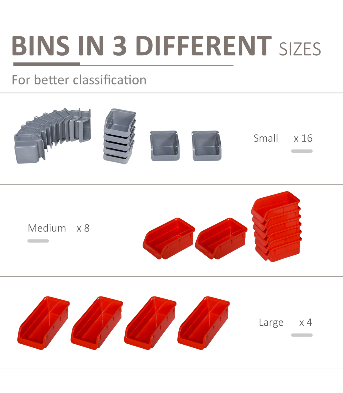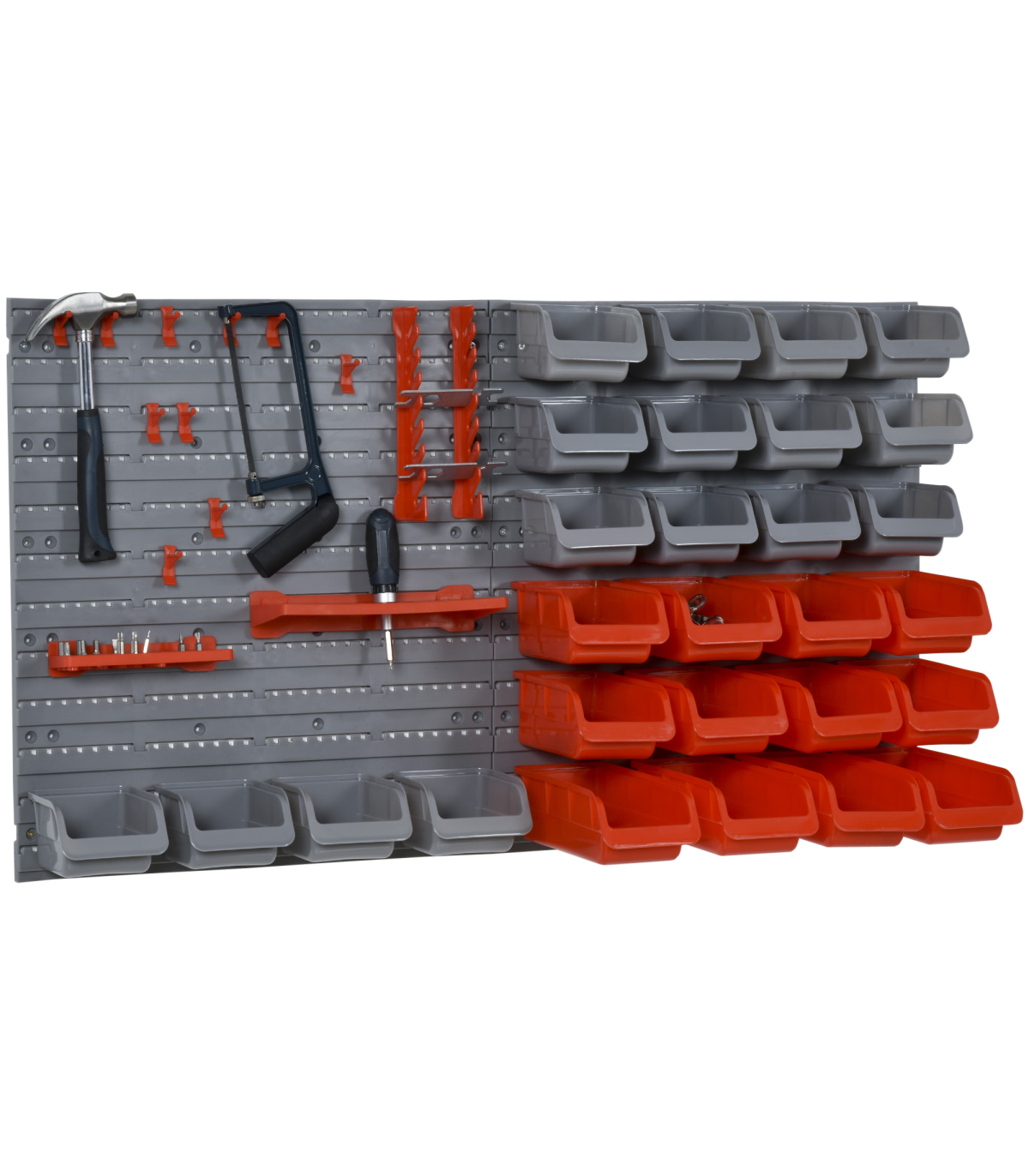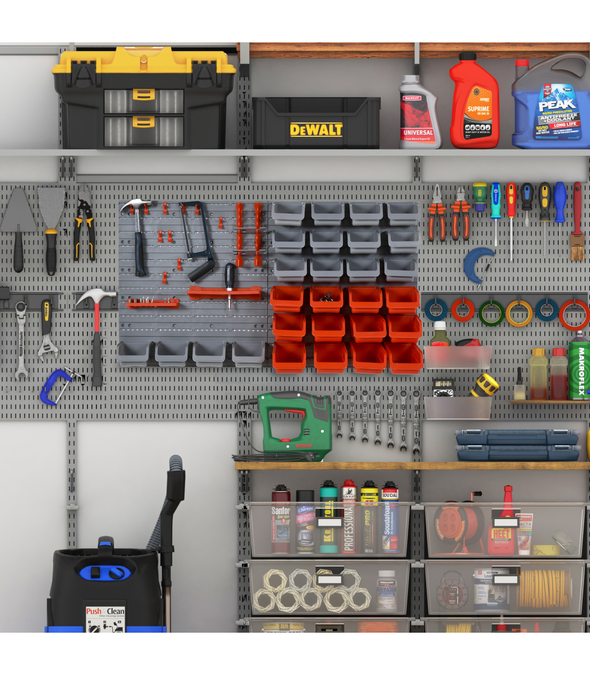 - • Tool Organizer with 2 pegboards and bins in 3 different sizes, ideal for workshops, garages and home workstations