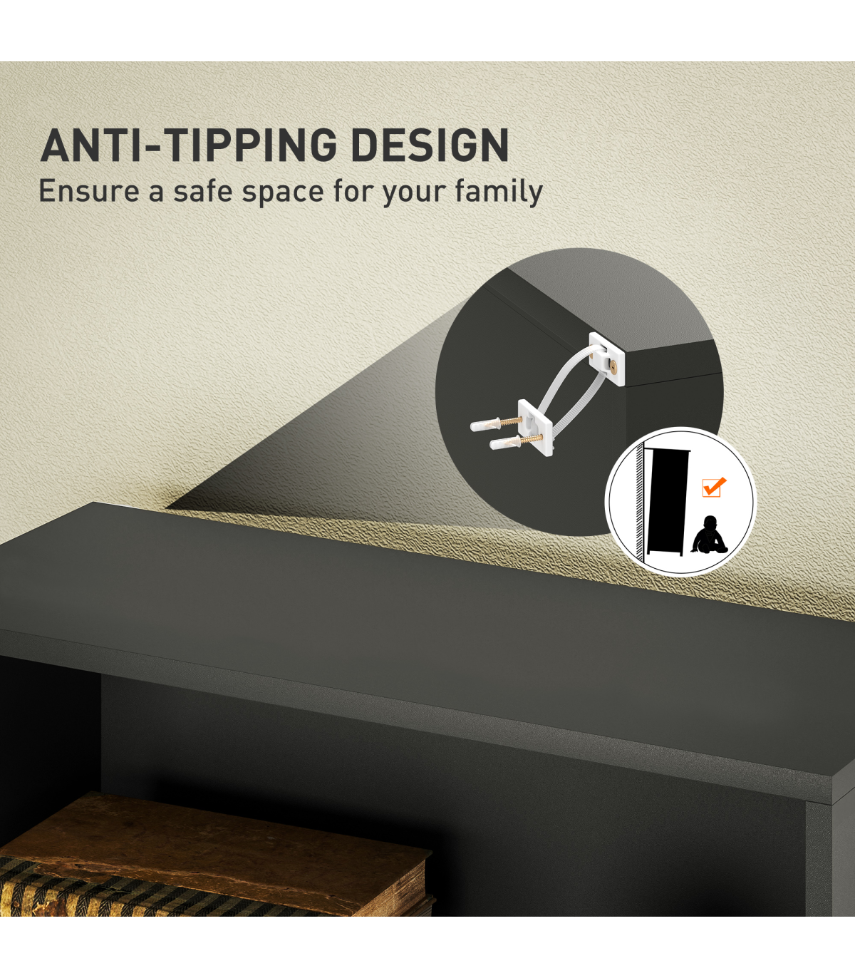 ● Anti tipping straps to fix unit to a wall for safety
