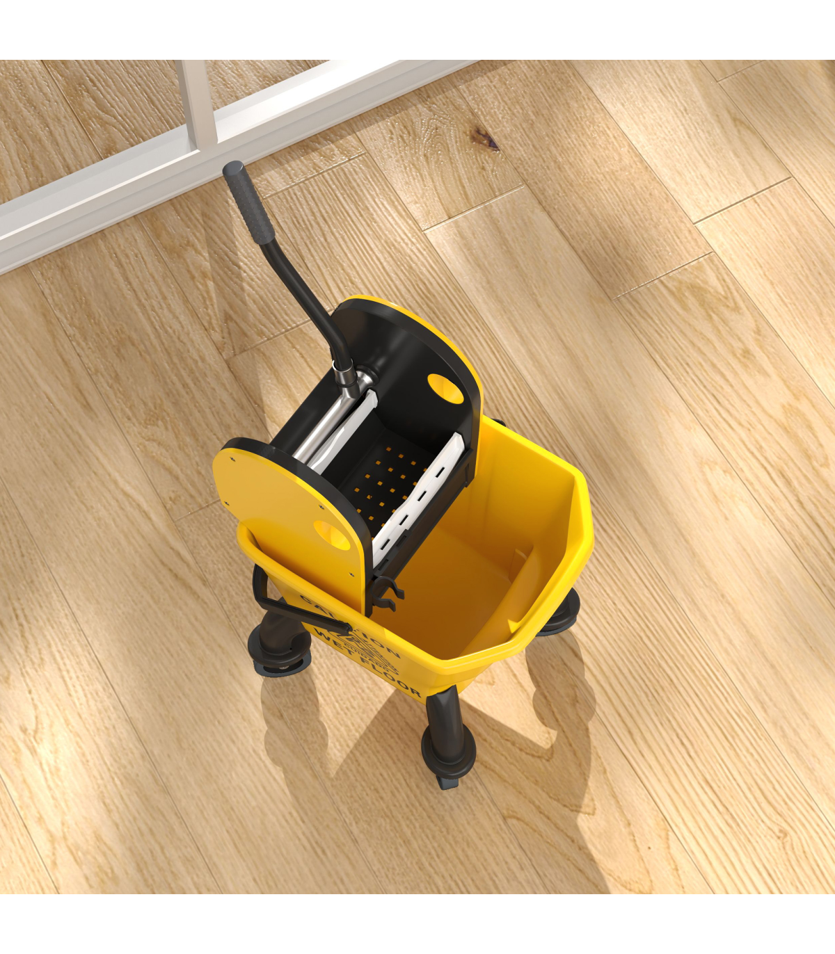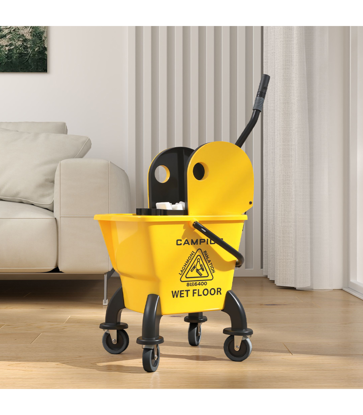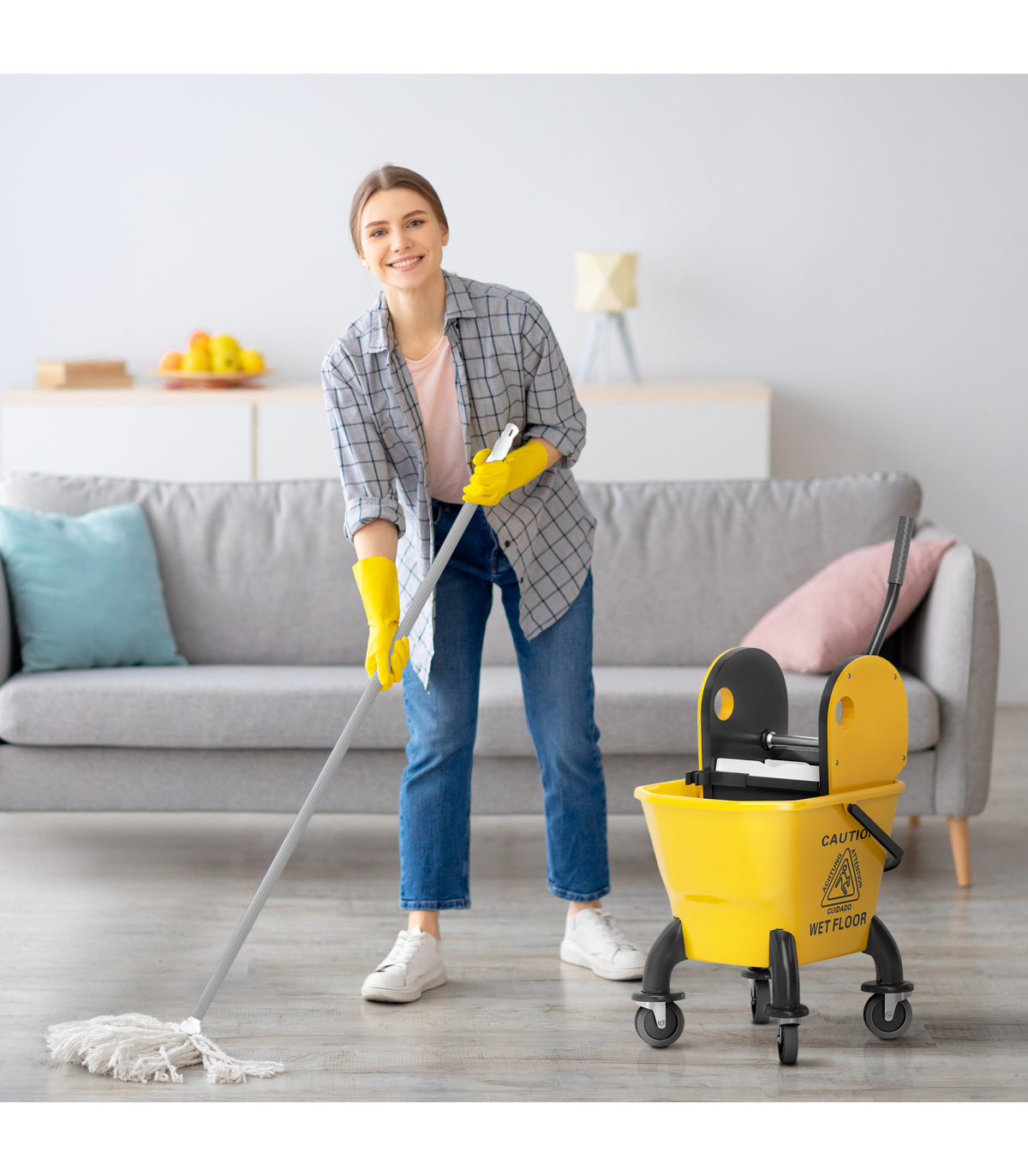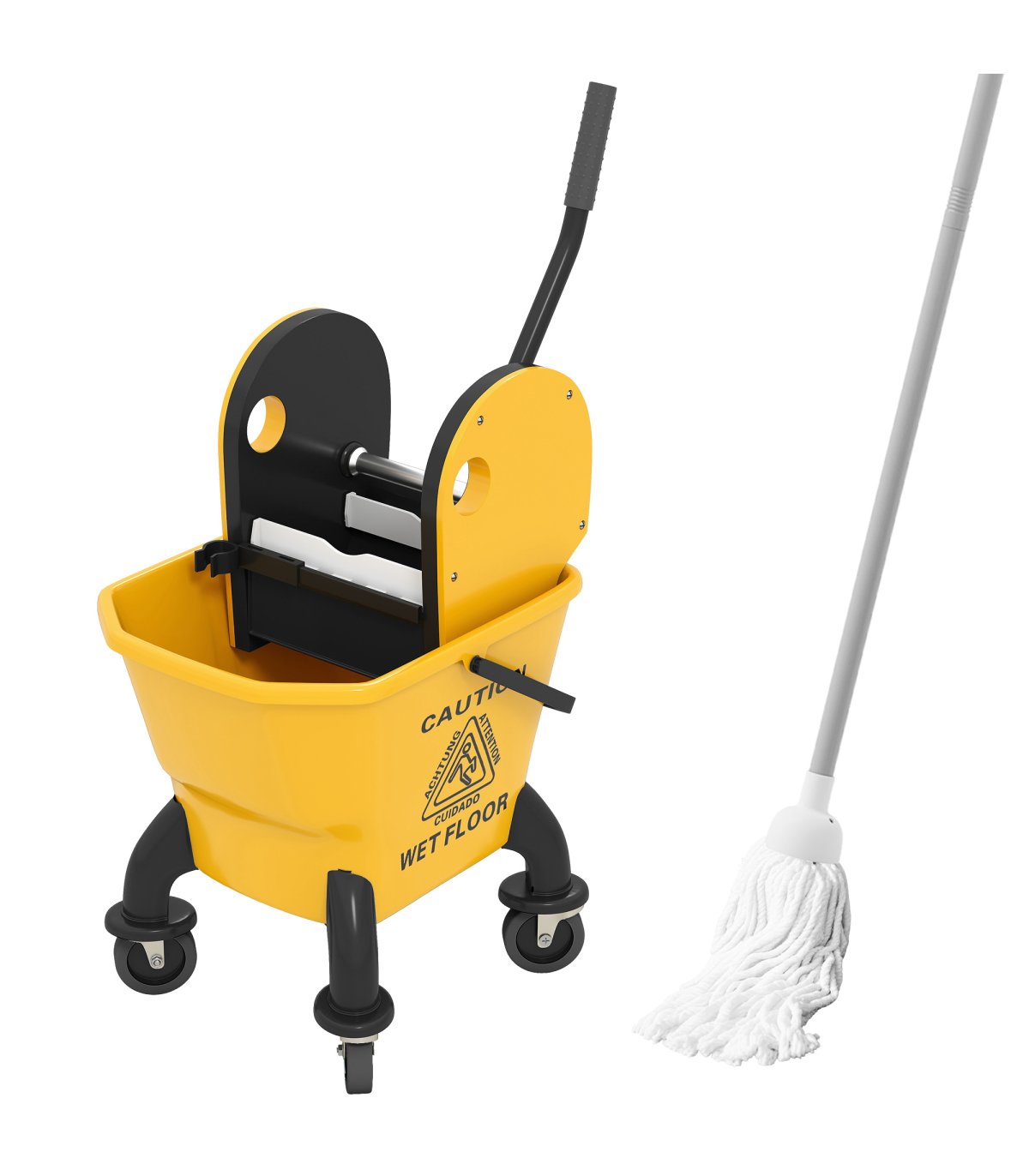 cleaning bucket for mop is complete with wheels to move around easily. Mop included.