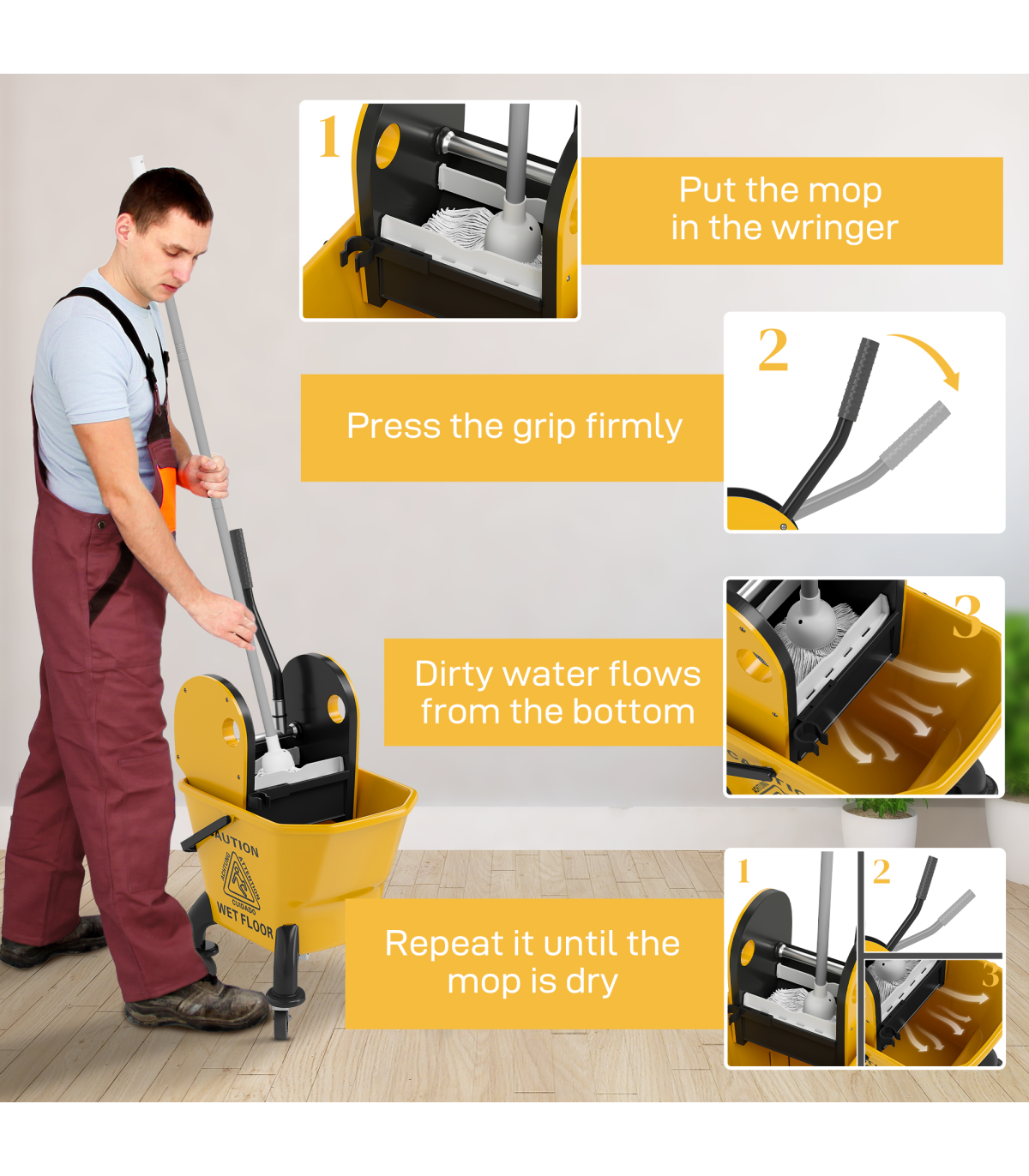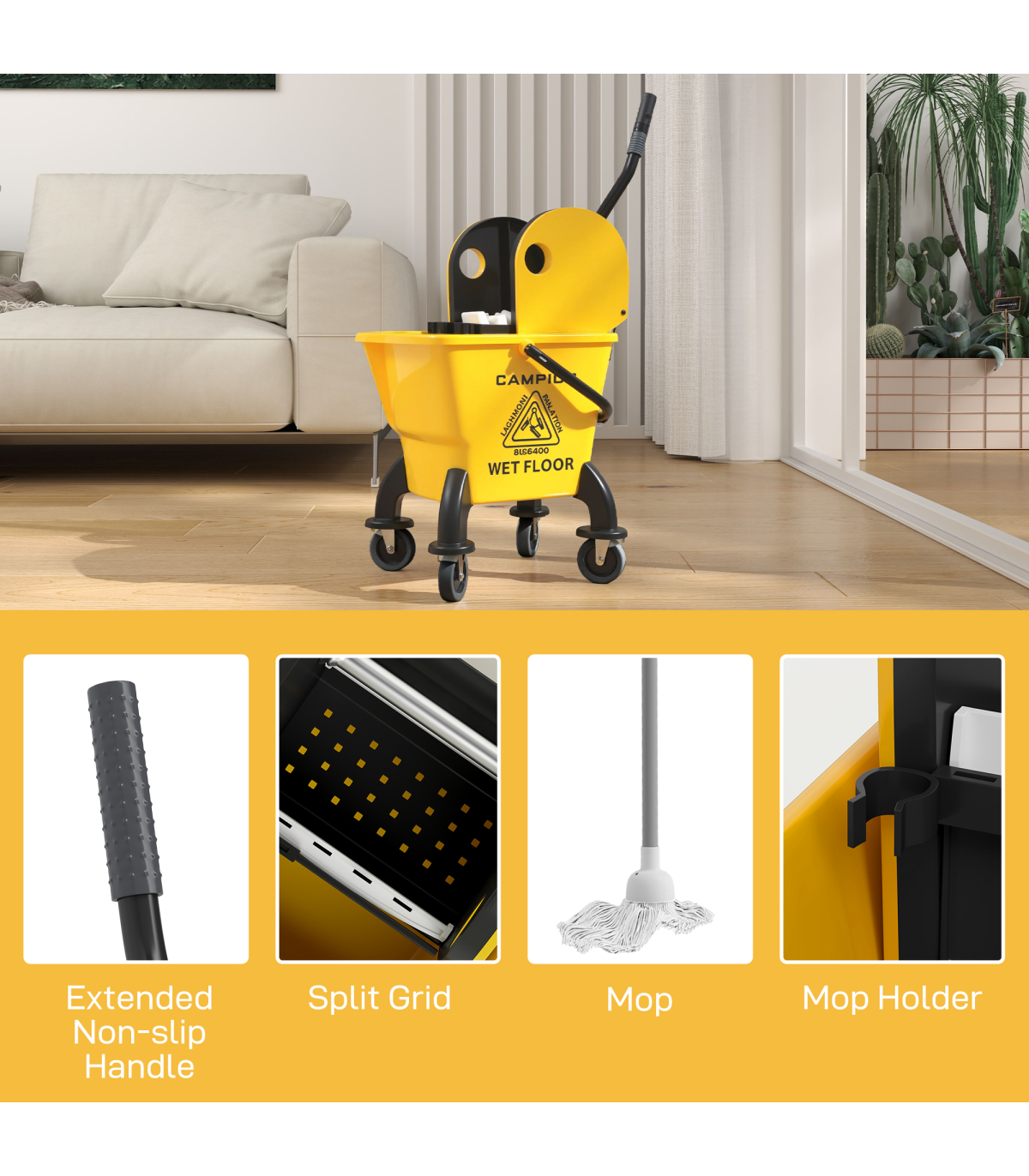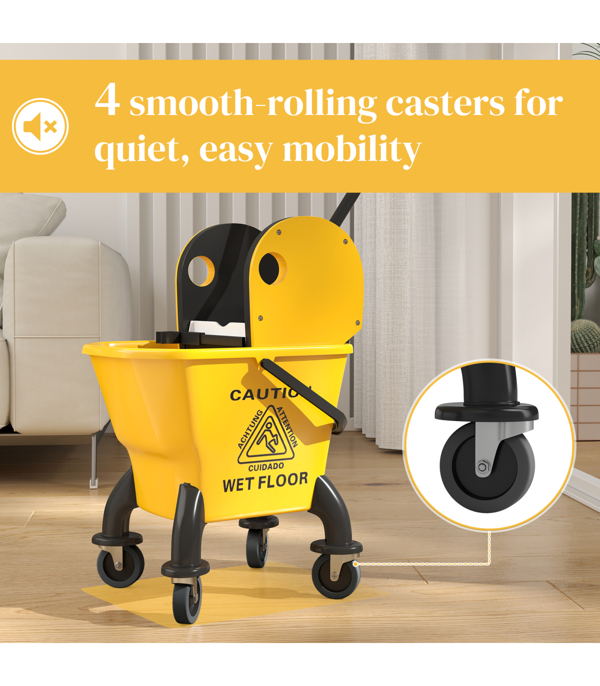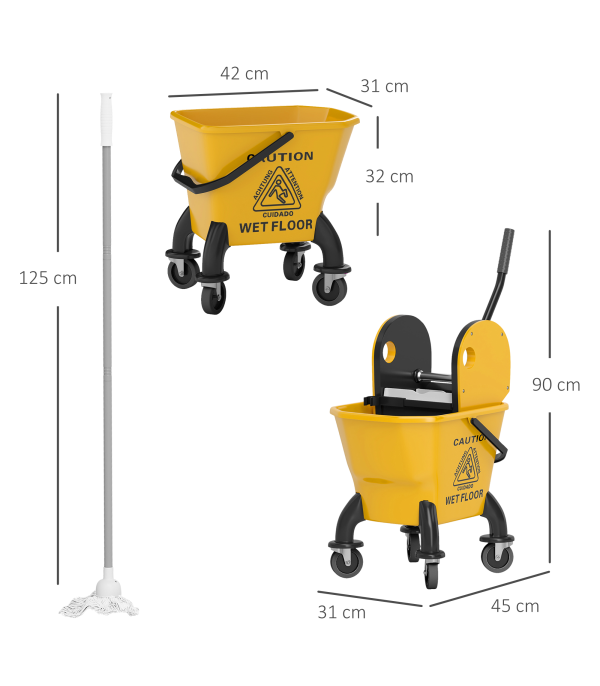cleaning bucket for mop is complete with wheels to move around easily. Mop included.