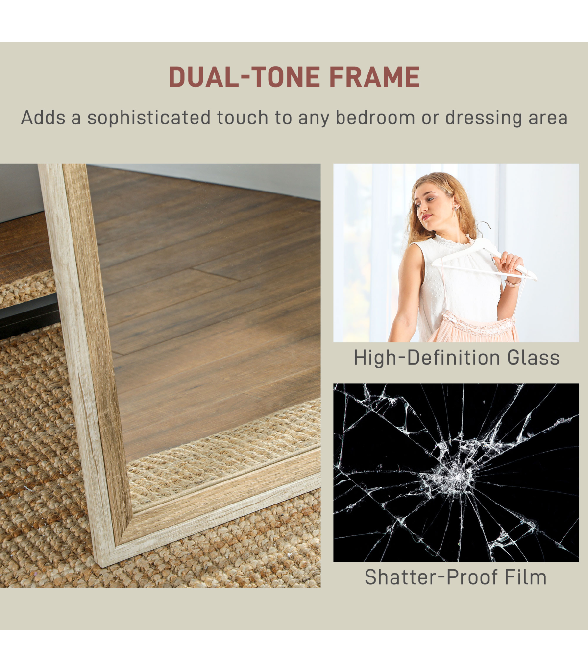 the high definition glass provides a clear and beautiful reflection. Choose to stand it up, lean, or mount it how you want - set it up how you want.